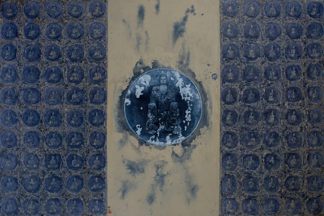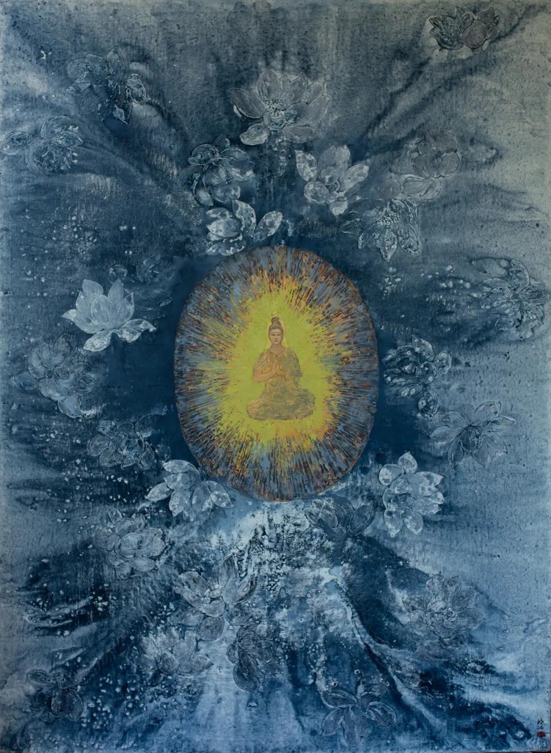 一個(gè)是作品中畫面的主體人物,比如“佛”的包圍感非常強(qiáng),那么這種包圍感肯定是一種自我困擾,一種來自內(nèi)心的困擾,這種困擾不是束縛于世俗的世界。比如我看到有幾張畫佛處在千巖萬壑之中。像這種困擾不是世俗的,它是來源于內(nèi)在的、精神方面的、自然世界的、甚至包括佛教對于宇宙的一些想法的追問。我覺得這是一種沉靜的美,而且我還有更大的感受,就是這個(gè)展覽不是可以定義為宗教繪畫或佛教繪畫,它是來自一種從另外一個(gè)角度,就是獲得了個(gè)人化的一種角度,所以他不能歸之于佛教繪畫。