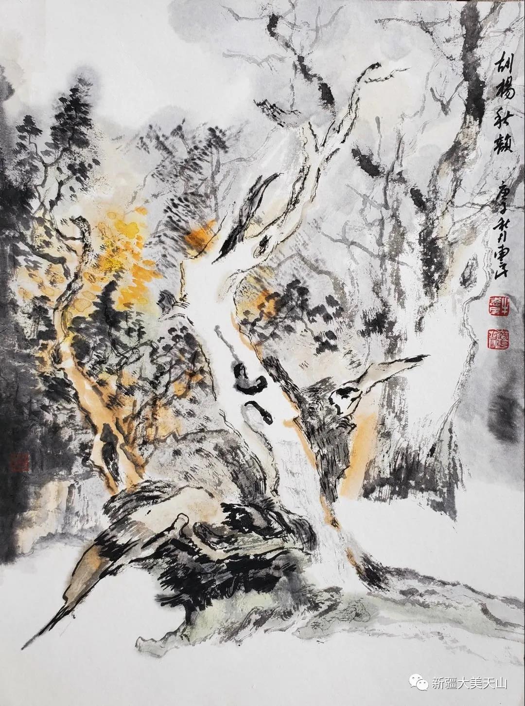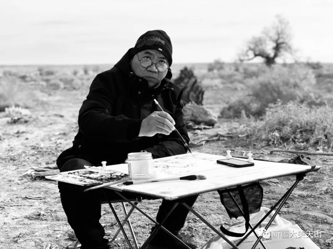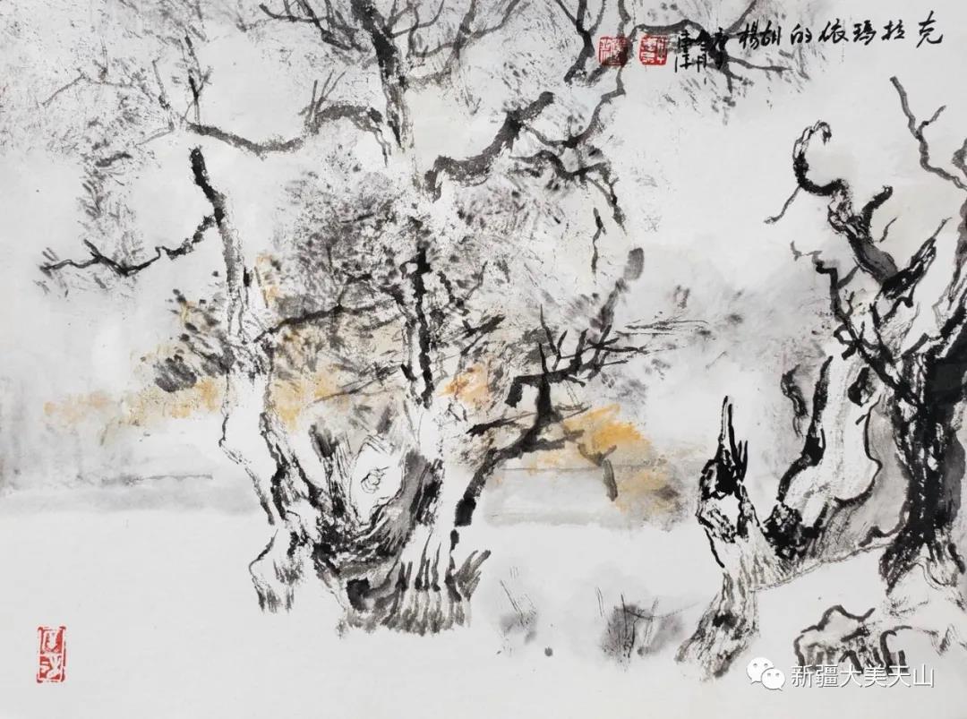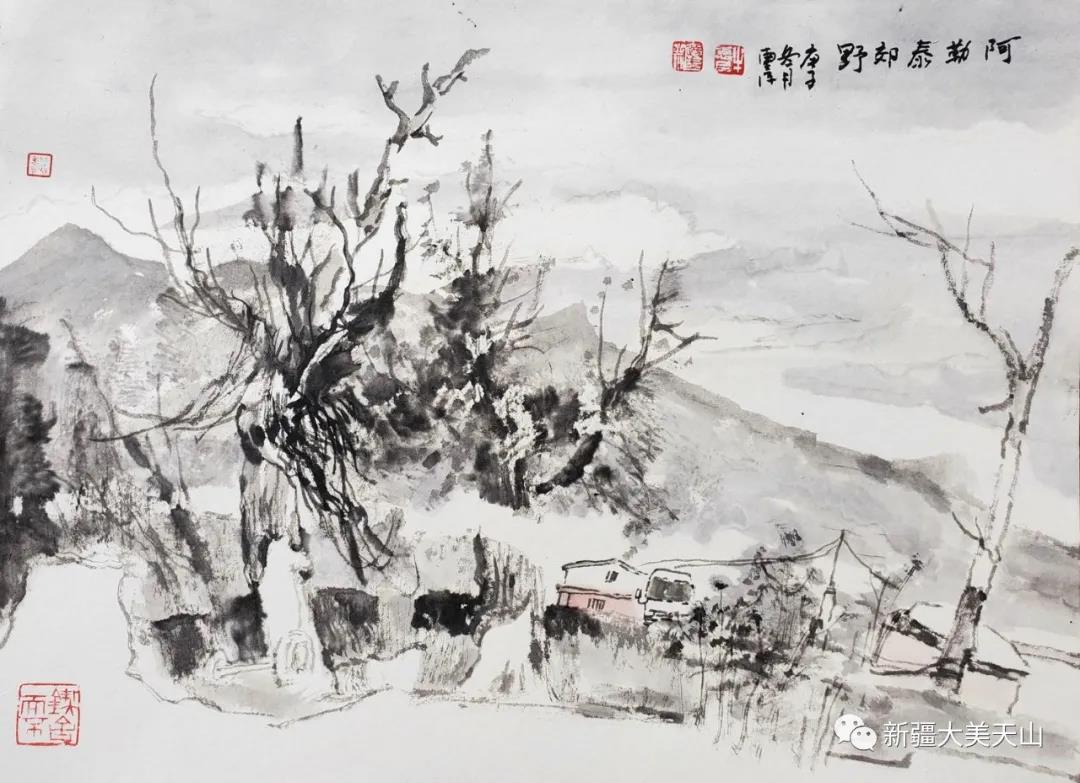 他努力實踐石濤“搜盡奇峰打草稿”的至理名言,熱愛生活,深入生活,真實感受新疆大山大水,用真情感受生活,又把真實感受升華在一幅幅畫作里。