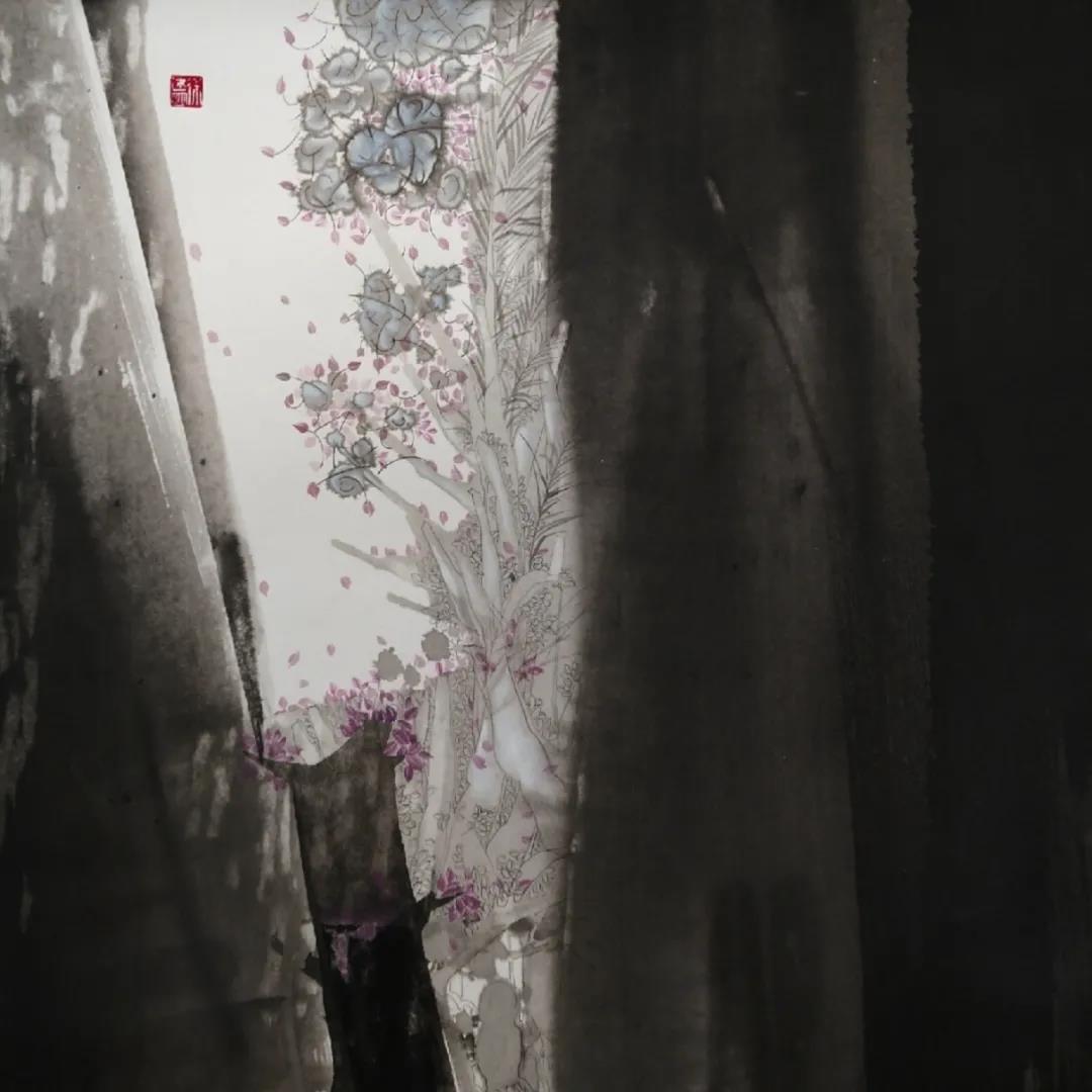 但是,這樣的創(chuàng)作表現(xiàn),反倒是讓他的國畫作品具有了不同于傳統(tǒng)的新風(fēng)尚,顯示了國畫審美圖式與裝飾設(shè)計(jì)觀念相結(jié)合的新動(dòng)向,令其作品的視覺形式表現(xiàn)有了張力,肌理形式表現(xiàn)有了感覺,情感符號(hào)表現(xiàn)有了特殊的意味。