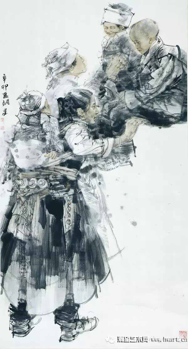 象《輕風(fēng)》、《帕米爾之歌》、《吉祥甘南》、《人間天堂》等新作,都漾溢著濃郁的現(xiàn)實(shí)生活氣息和西部高原的清新詩(shī)情;特別是畫家的抒情的筆致和墨韻,表現(xiàn)了他對(duì)“人”的主題的關(guān)注和理解,在繁簡(jiǎn)、虛實(shí)、黑白、濃淡的對(duì)比中,營(yíng)造了空間層次和人物關(guān)系的主次;而且,為使主要人物的性格與情懷得到典型性的表現(xiàn),畫家吸收并融入了某些寫實(shí)造型手法,給人物以明暗、光影的造型因素,使之生動(dòng)并充滿生命活力,同時(shí),又圍繞著典型人物進(jìn)行環(huán)境與氣氛的烘托,使作品獲得整體的充實(shí)與飽滿,進(jìn)而感染著欣賞者,這樣的作品溝通著當(dāng)代人的心靈,讓我們看到,處在現(xiàn)實(shí)生活中的畫家不可遏止的創(chuàng)作激情和藝術(shù)觀念;同時(shí),我們也明顯地感覺到,在現(xiàn)實(shí)生活中,畫家所煥發(fā)的靈感與沖動(dòng)。