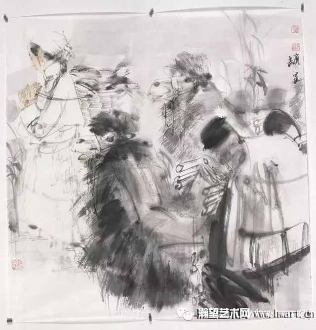 引人注意的是,趙星的作品緊緊把握著中國(guó)藝術(shù)特有的含蓄與空靈感,強(qiáng)調(diào)的是“得意忘形”、“意到筆不到”、“畫外之境”等等,淋漓處率性揮灑、任意潑墨,細(xì)致處精微傳神、氣韻俱足,用筆靈活,富于變化,筆線在虛實(shí)之間若即若離,結(jié)構(gòu)處輔以皺擦,使以筆立骨的寫意手法,結(jié)實(shí)、穩(wěn)定,而不渙散;用墨以潑墨和濃淡相破手法為主,營(yíng)造枯、濕、濃、淡的豐富變化及水法帶來的墨色幻化,在一片墨韻、墨氣之中襯托人物關(guān)系,使畫面產(chǎn)生流動(dòng)感,打破了靜止?fàn)顟B(tài),在運(yùn)動(dòng)中使畫面頓生蓬勃之氣韻。