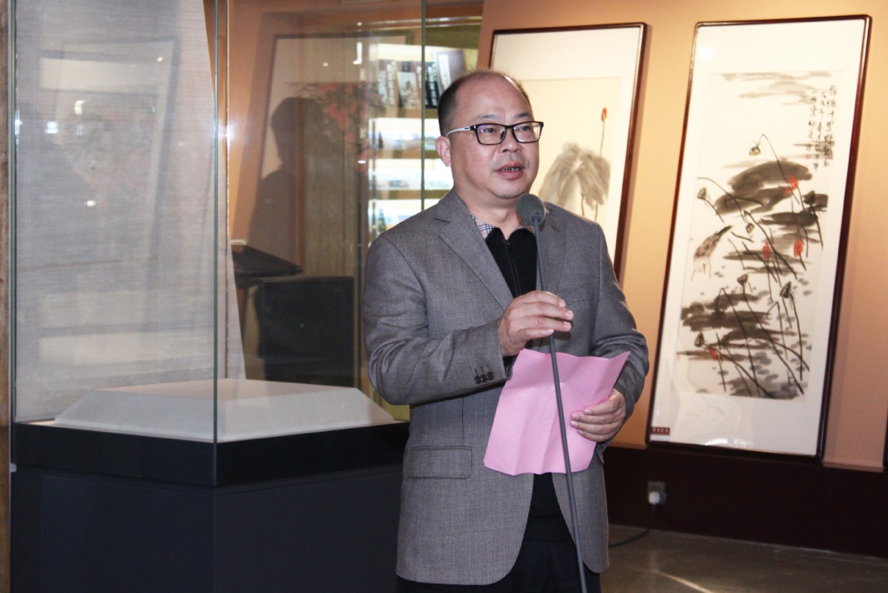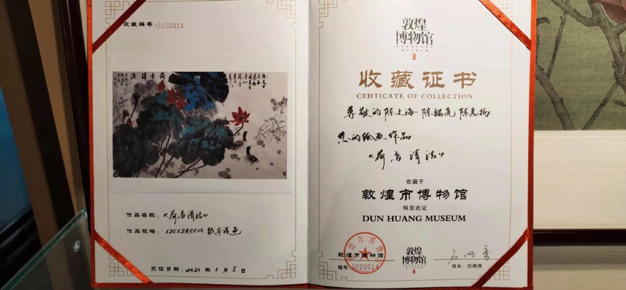 開幕式上,陳文海、陳裕亮、陳惠揚(yáng)將共同創(chuàng)作的大幅繪畫作品《荷香清潔》捐贈(zèng)給敦煌市博物館,敦煌市博物館向作者頒授了收藏證書。