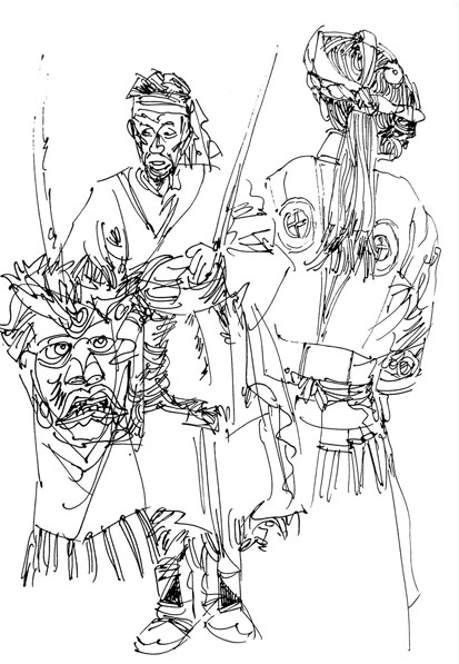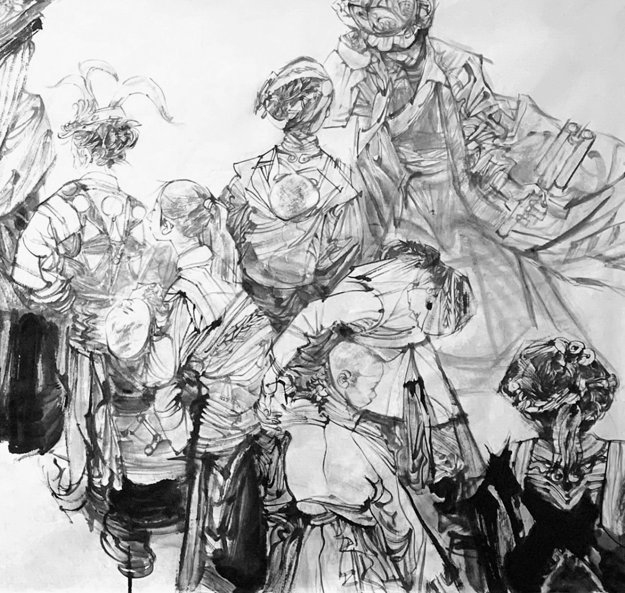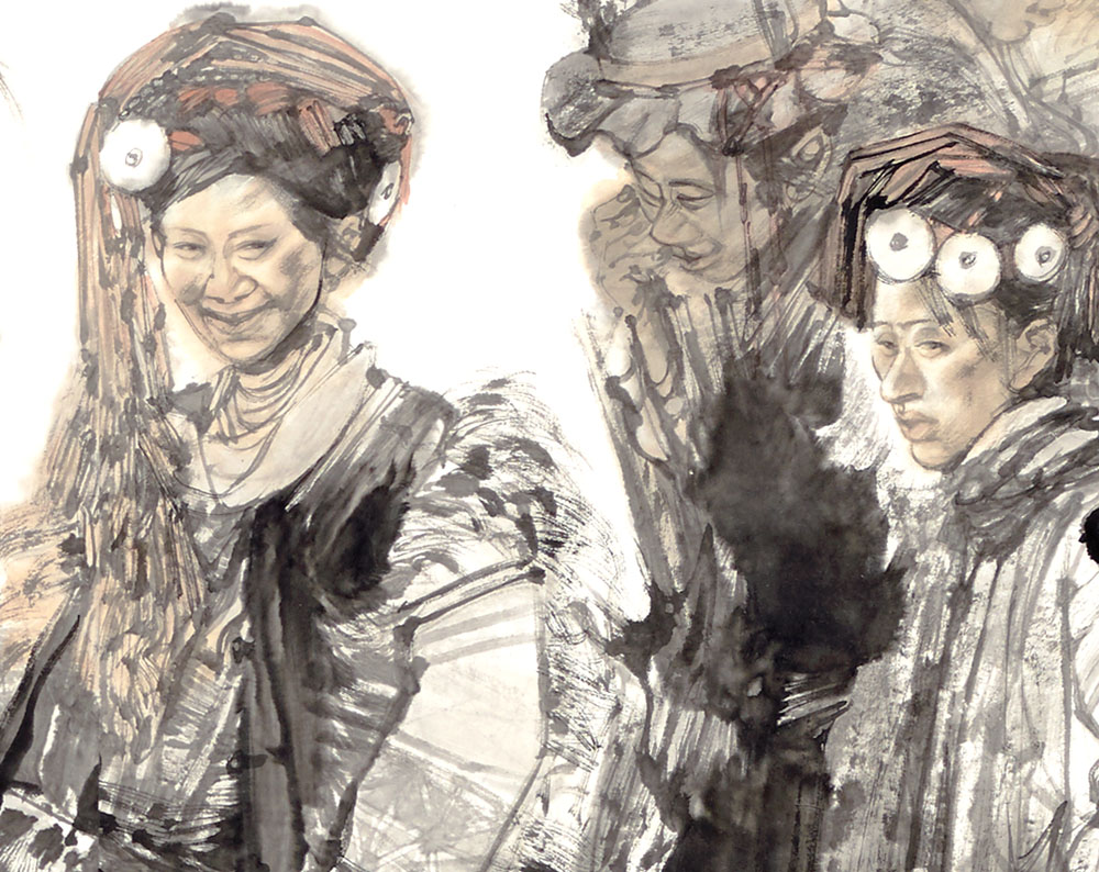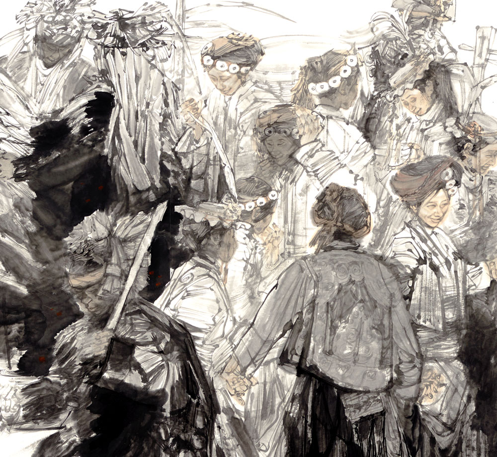 技法的細節(jié)問題暫切不談。從初步的嘗試來看,詩意的表現白馬人頑強不屈、蒼桑久遠、悲愴厚重如史詩般的生活歷程便是我所追求的畫面總基調。營造這種氣氛就必須用濃重的筆墨,大塊的黑白對比,鮮明富有個性的人物造型烘托主題。這一點有別于我以往的創(chuàng)作,尤其是大塊面墨色運用上對我而言取得了突破性進展,《祭火》便是范例。隨后又創(chuàng)作出白馬詩篇系列《白馬人與池哥晝》等大尺幅作品,通過白馬詩篇系列組畫的創(chuàng)作我的心靈受到了感動和洗禮,同時找到了歸屬感。在接下來的日子里,我將繼續(xù)這一命題的創(chuàng)作,竭力解決寫實與寫意之間的矛盾找到平衡點,在內容和形式上達到一個新的境界。