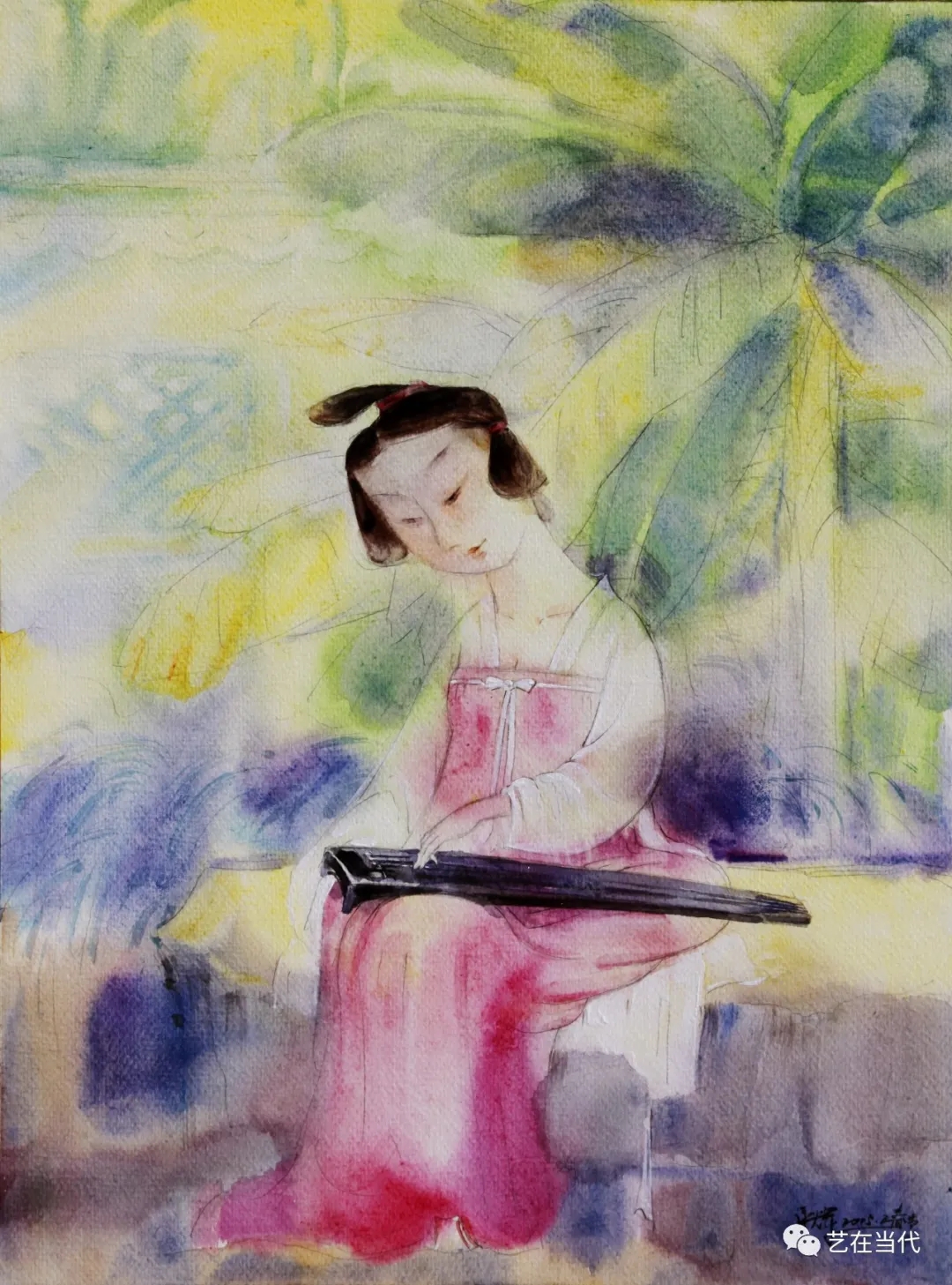 支撐起這種圖景背后的是一種極致浪漫的表達(dá)方式。隨性的線條自然的附著于物體的邊界,大面積的背景是寥寥幾筆的暈染,逸筆草草間便可感受到畫中人物和創(chuàng)作者的情緒。在色彩與水離子的碰撞之下觀看者看到的是詩(shī)情畫意的夢(mèng)境,甚至讓人恨不得立馬去翻看卷首的題跋尋找配詩(shī)。可以說(shuō)這個(gè)系列中水墨化的情緒表達(dá)是創(chuàng)作者對(duì)水彩顏料一次成熟的材料實(shí)驗(yàn)。將某種創(chuàng)作情緒更加感性的帶入每一次“潑墨”之中,使得作品更像是文人水墨的呈現(xiàn)而非西洋水彩。蔡永輝教授對(duì)水彩與水墨二者間媒介共性的理解,使這種結(jié)合具備了合理成形的現(xiàn)實(shí)可能性。