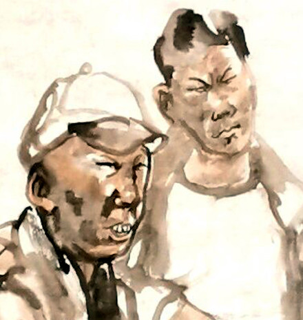 這樣的內(nèi)容與意境,雖已背離豐子愷原畫,但另具時代性與真實性,學術意義更大。畫中人物的身體造型與臉部表情雖然帶有一點漫畫的變形意味,但不像漫畫故意夸張,而是恰到好處,只求形神達意,且有筆墨趣味的講究,因而不會和使用中國畫形式創(chuàng)作的漫畫混同。這只需比較豐子愷原畫和著名漫畫家華君武的作品,就可理解兩者的區(qū)別,中國畫的表現(xiàn)力比漫畫強得多。