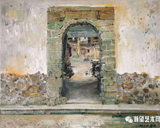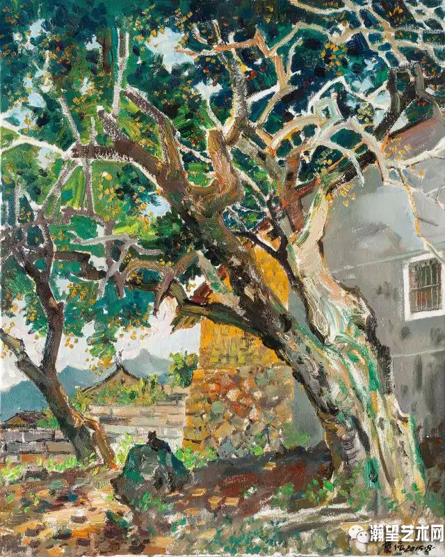 畫是無(wú)聲的詩(shī),可這無(wú)聲卻是如此的讓人不可抗拒地要呼喊人類停下腳步來(lái)拯救大自然。因此,這不僅僅是作者的故鄉(xiāng),更是人類共同的故鄉(xiāng)。小河彎彎,作者的情感何嘗不是如此曲折傷感呢?油畫《午陽(yáng)斜照——李光地故鄉(xiāng)寫意》,畫家注重從藝術(shù)的本源出發(fā),從心靈深處挖掘出對(duì)偉人及其故鄉(xiāng)的守望,新舊建筑交相輝映,小巷深深,伊人獨(dú)步,所有的意象構(gòu)造都在表達(dá)作者的歷史使命感。另一幅作品是《千年風(fēng)采——安溪清水巖寫意》,此畫深綠之中有淺綠,古樹傲立天地,寺宇屋角寄情思,路邊石獅悟禪深。整幅作品用寫意的語(yǔ)言來(lái)表達(dá)更讓人覺(jué)得作晶的深度和力度,體現(xiàn)了畫家對(duì)名勝古跡的深層文化內(nèi)涵的迷戀和向往。從這三幅作品,我們可以看出畫家駕馭繪畫語(yǔ)言的輕松和嫻熟,幾乎達(dá)到技不為心所縛,而其精神維度是飽滿的、寬博的、有彈性的,能讓人馳騁其間不覺(jué)得乏味和單調(diào),這全然要?dú)w功于畫家的善于觀察和精深思考。