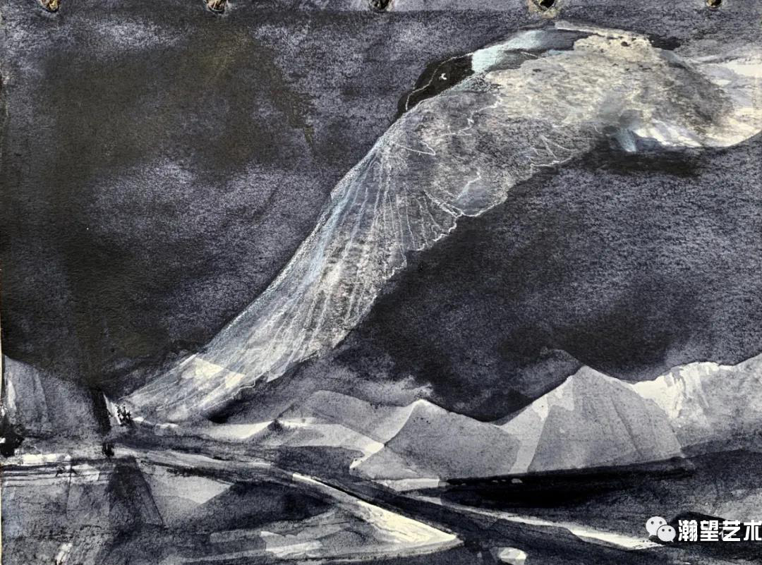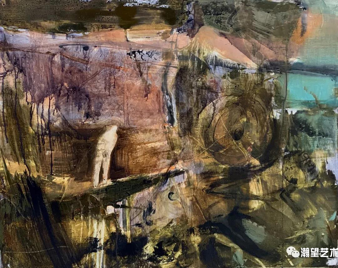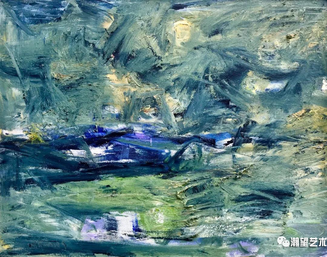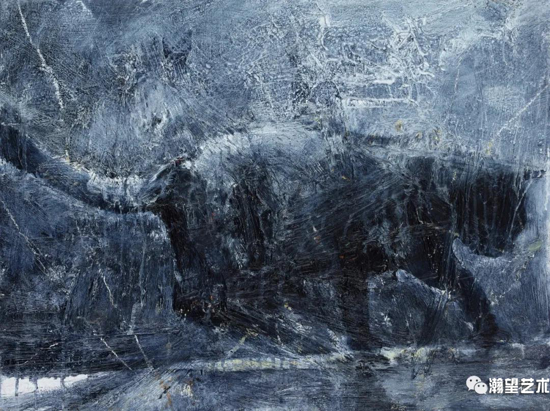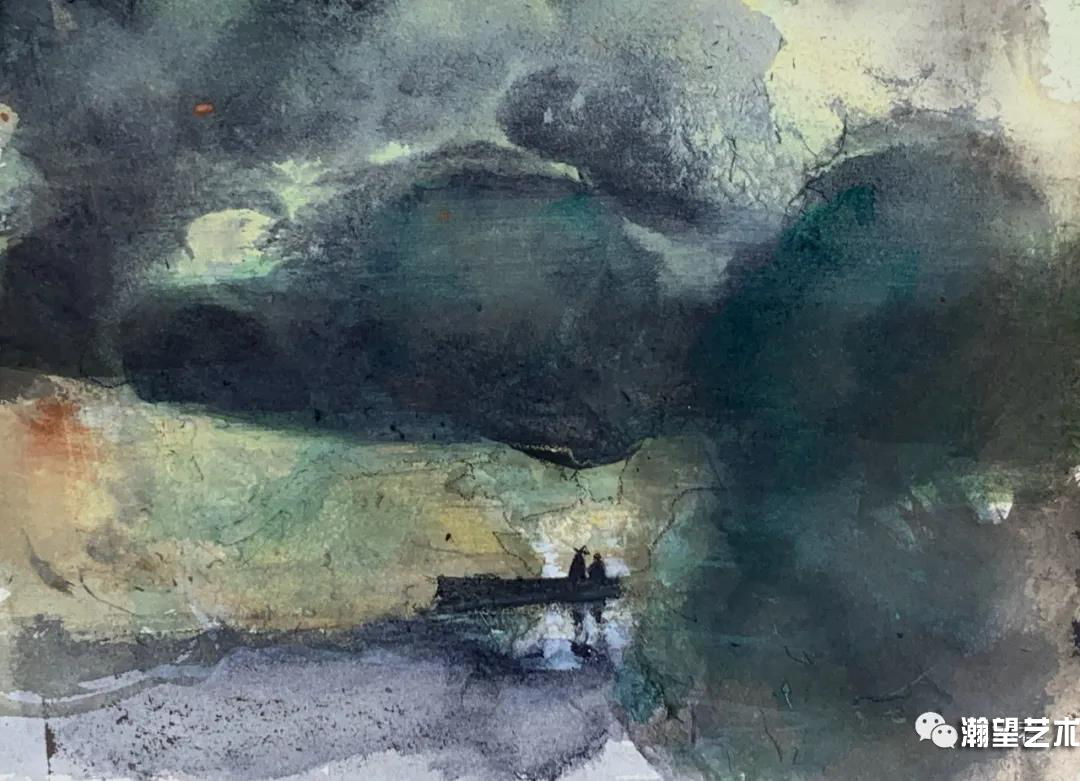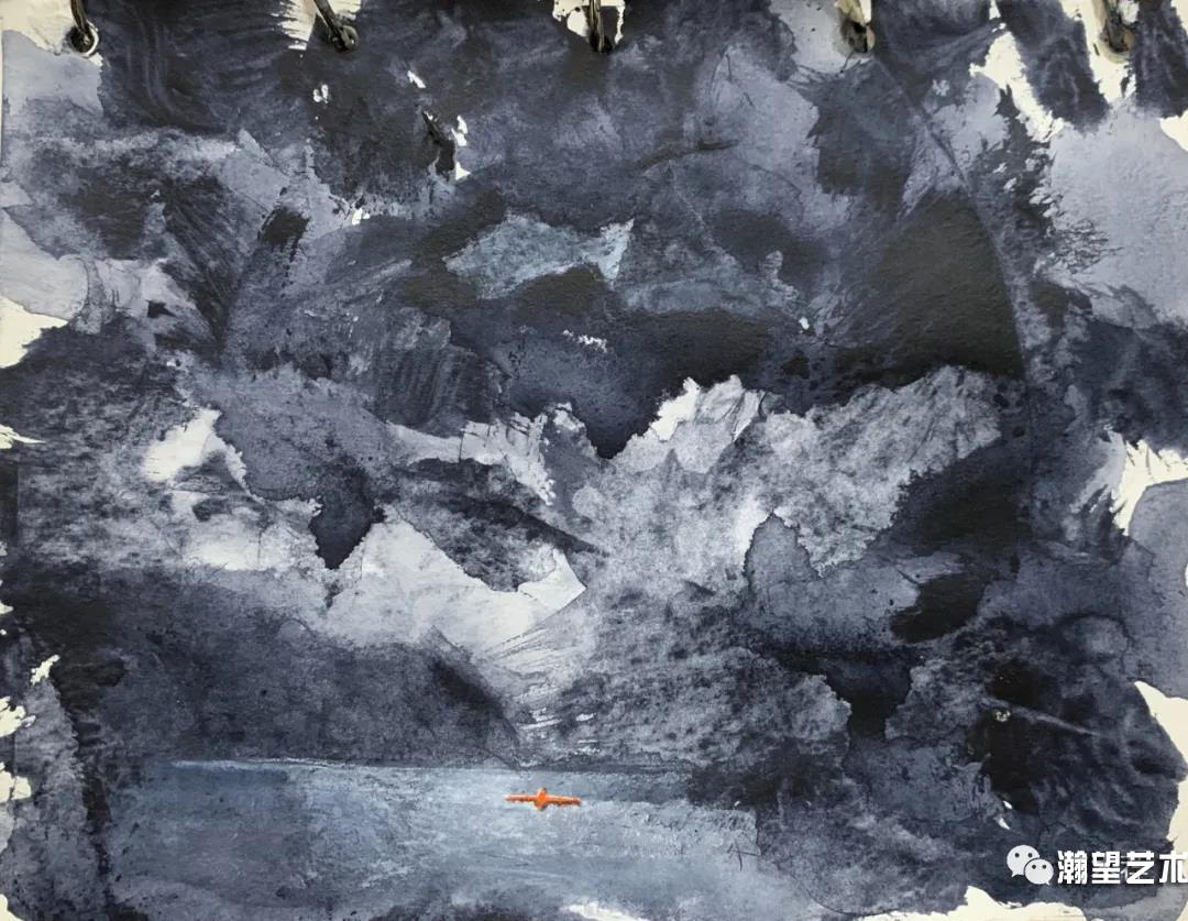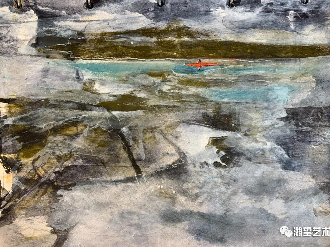 人和動物一樣,由于命運的未知與不確定性,生命的進程中會遇到各種危機與挑戰(zhàn)。在內(nèi)心深處,每個生命個體都是孤獨的。明華的風(fēng)景畫猛一看似乎有些“粗野”,其實不然,畫家的心思不乏縝密,若定睛細(xì)觀會發(fā)現(xiàn),汪洋恣肆的畫面中時常留有一隅空曠與靜寂,靜寂處可以尋見一抹小舟,舟中立一小人。人極小,小到看不到五官和任何細(xì)節(jié),他就那樣立著,任小舟隨意漂流。