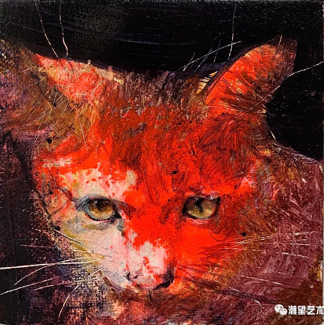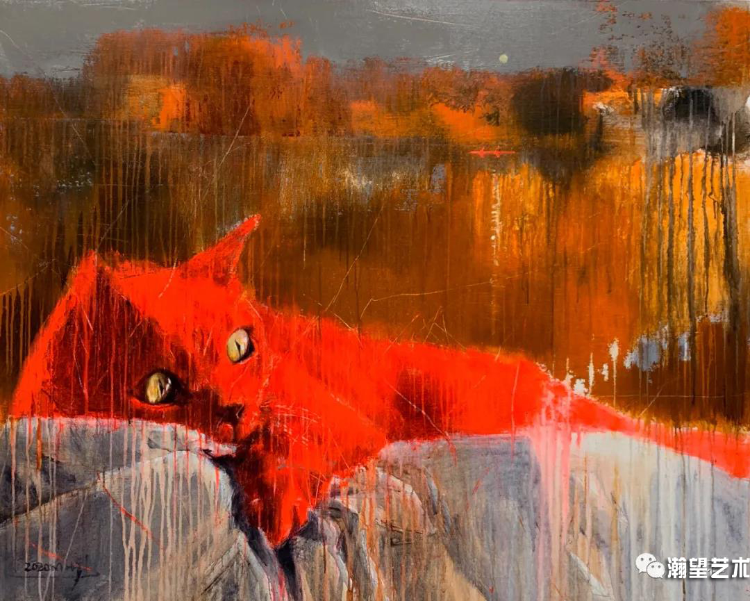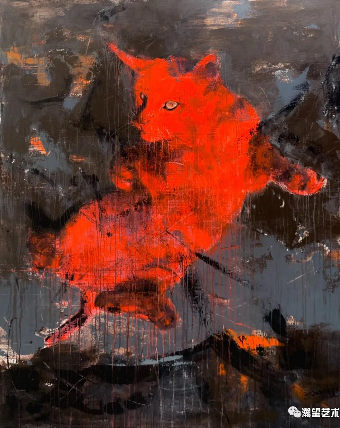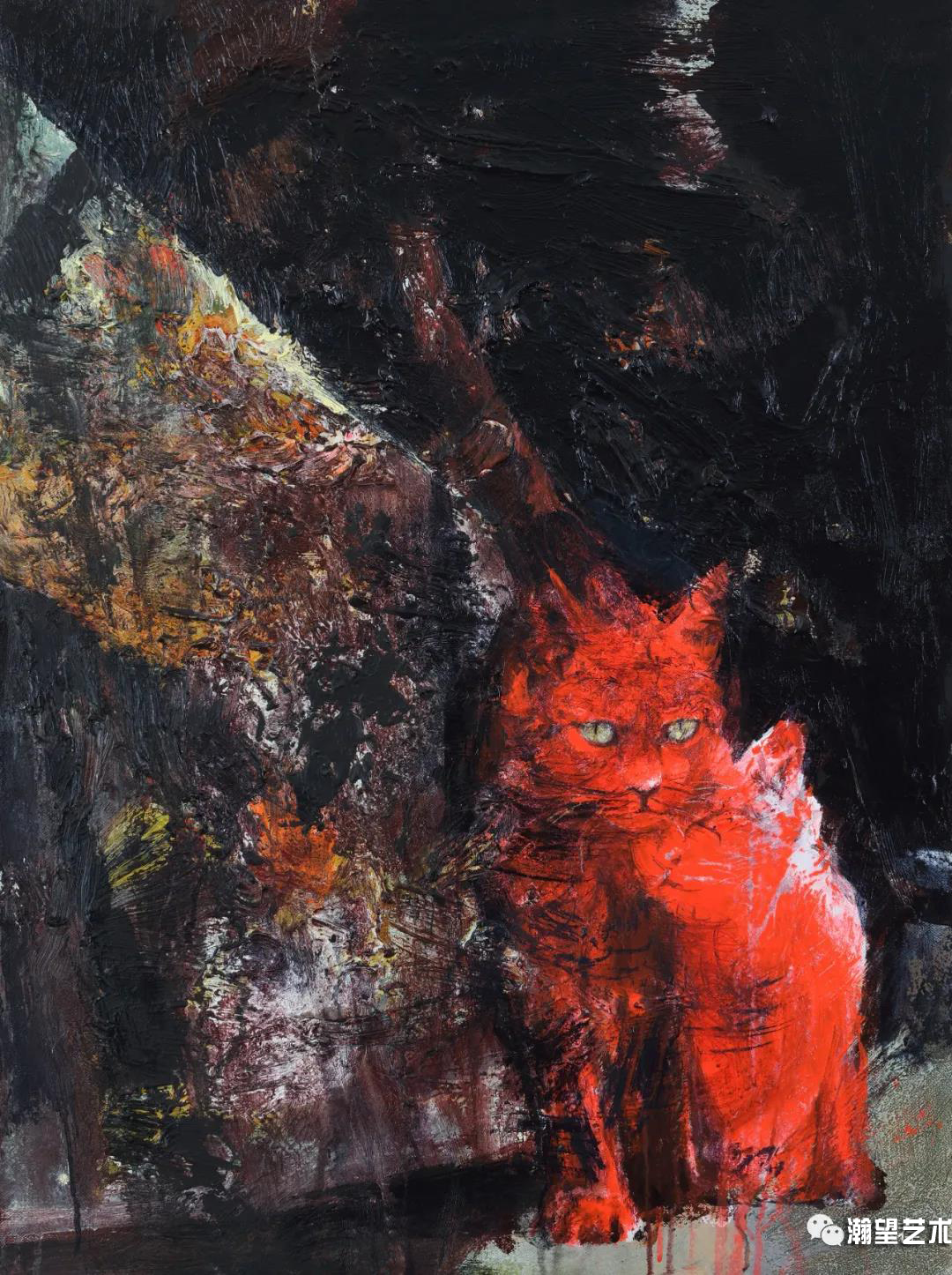 認(rèn)識明華,始自其狂放筆觸下那只霸氣十足的貓,自此,《紅貓》系列油畫成了頭腦中揮之不去的魅惑。正如畫家所言:“當(dāng)藝術(shù)作為一種媒介使人心靈產(chǎn)生巨大的震撼之時,一切的語言都是蒼白的?!泵魅A作品中那對瞬間即逝的情緒的捕捉和對色彩高度的把控力,令人心顫,繼而魂飛魄散……