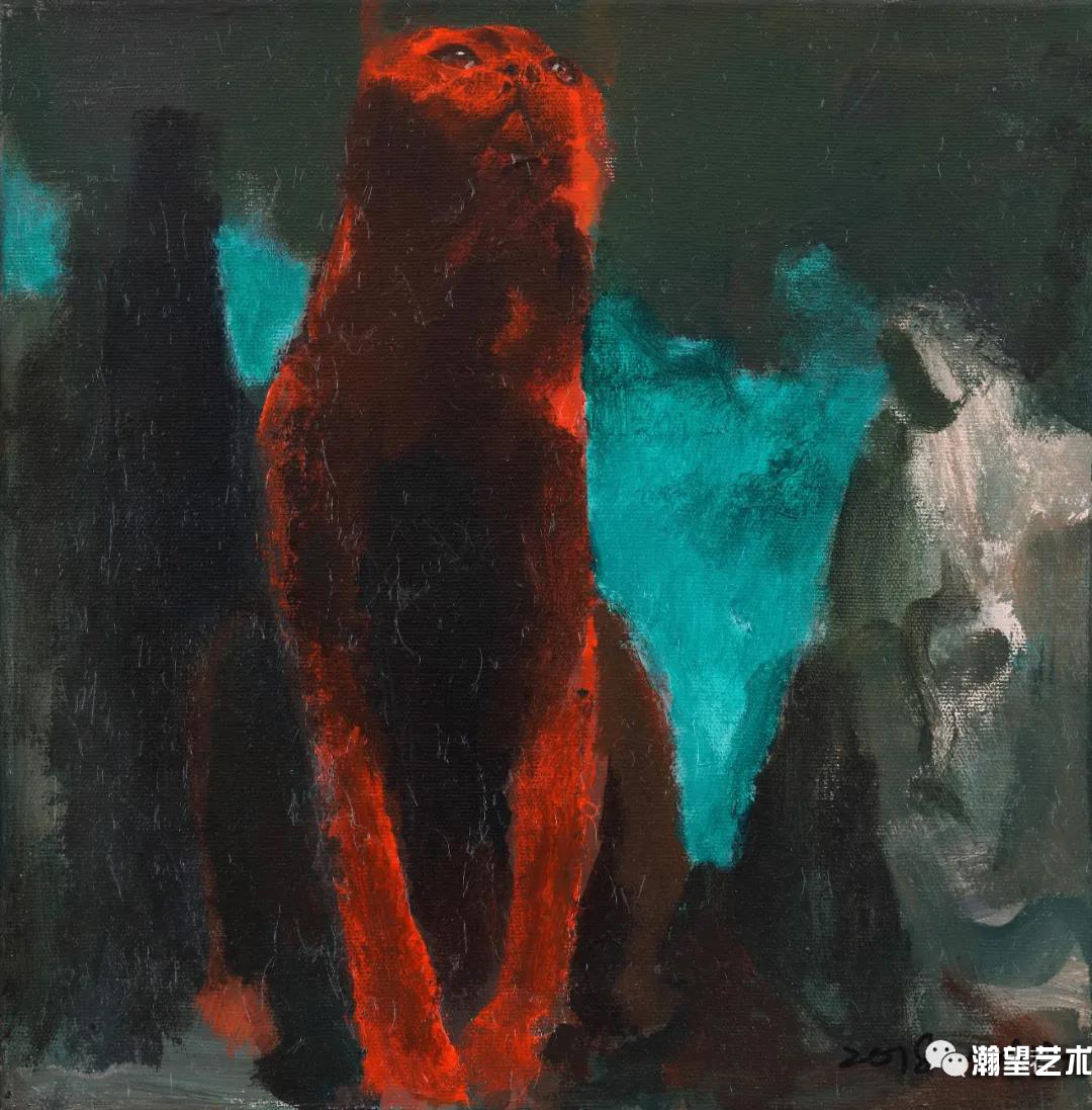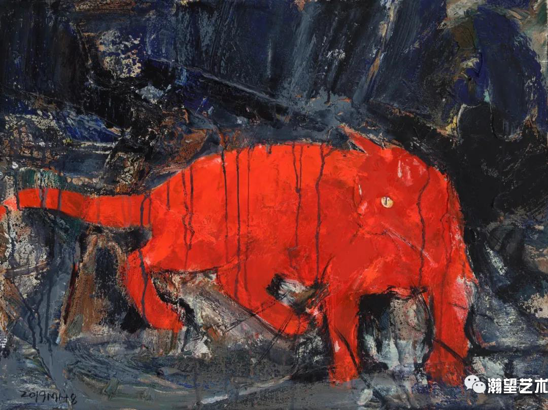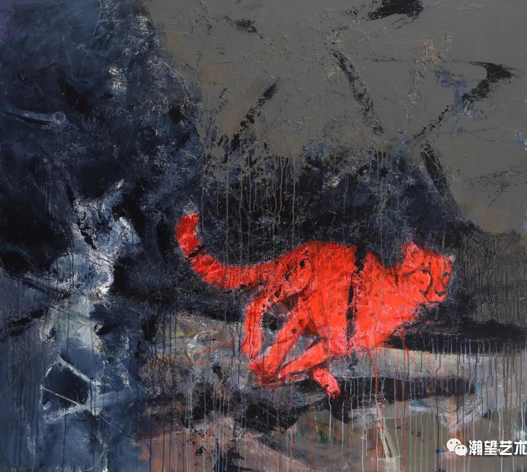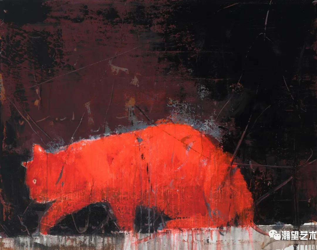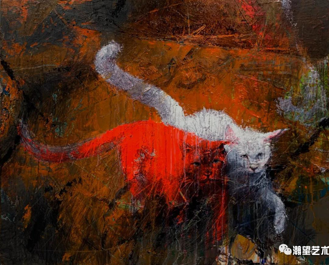 認(rèn)識明華,始自其狂放筆觸下那只霸氣十足的貓,自此,《紅貓》系列油畫成了頭腦中揮之不去的魅惑。正如畫家所言:“當(dāng)藝術(shù)作為一種媒介使人心靈產(chǎn)生巨大的震撼之時,一切的語言都是蒼白的?!泵魅A作品中那對瞬間即逝的情緒的捕捉和對色彩高度的把控力,令人心顫,繼而魂飛魄散……
