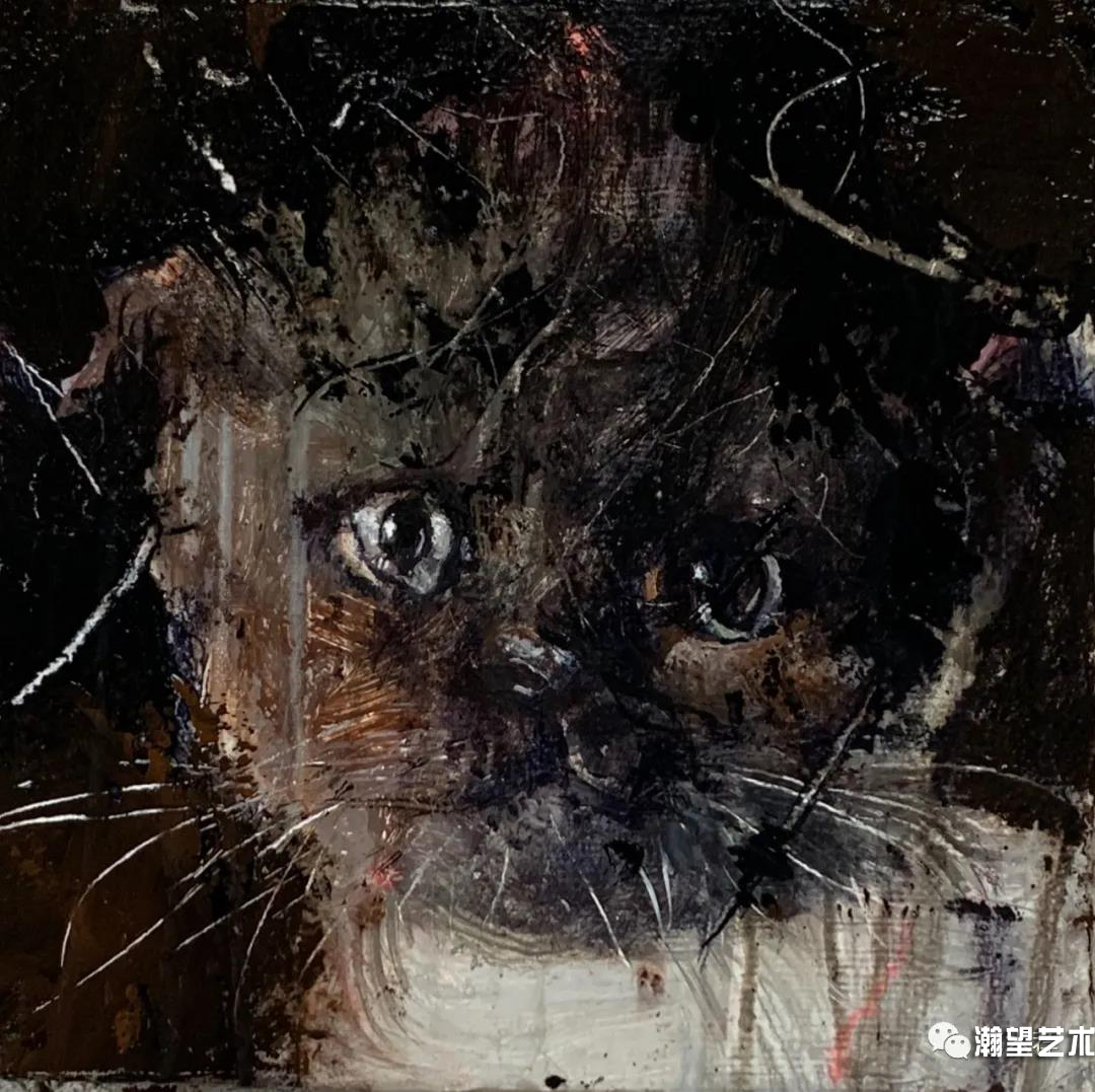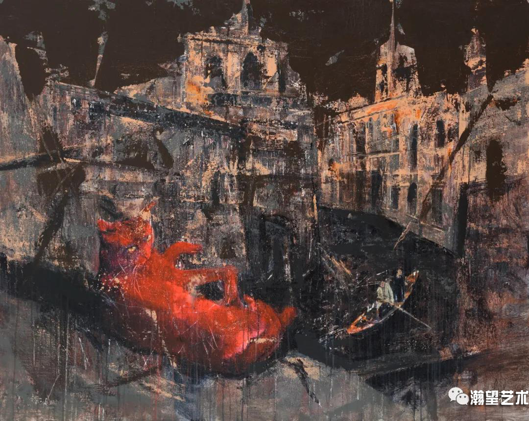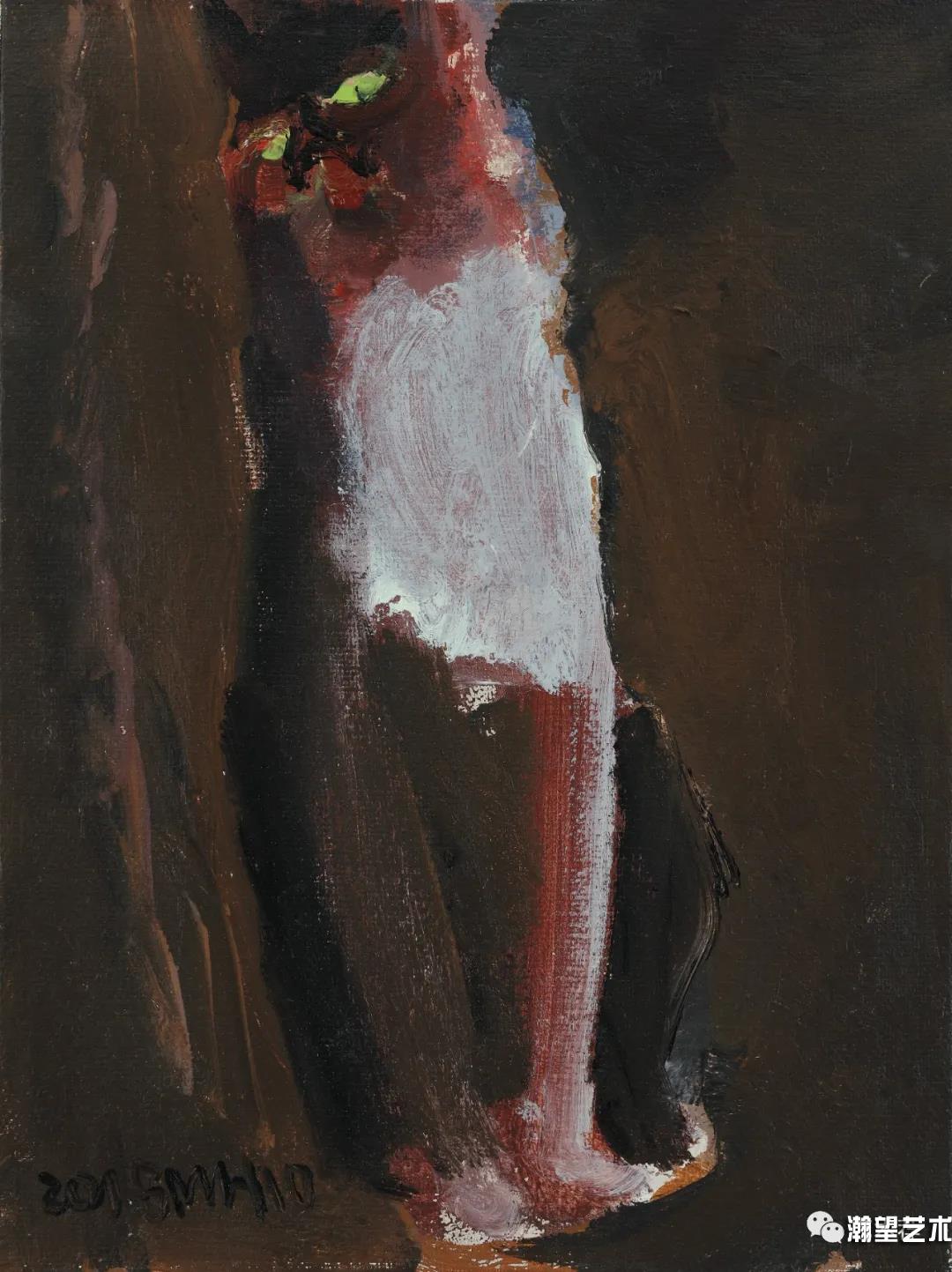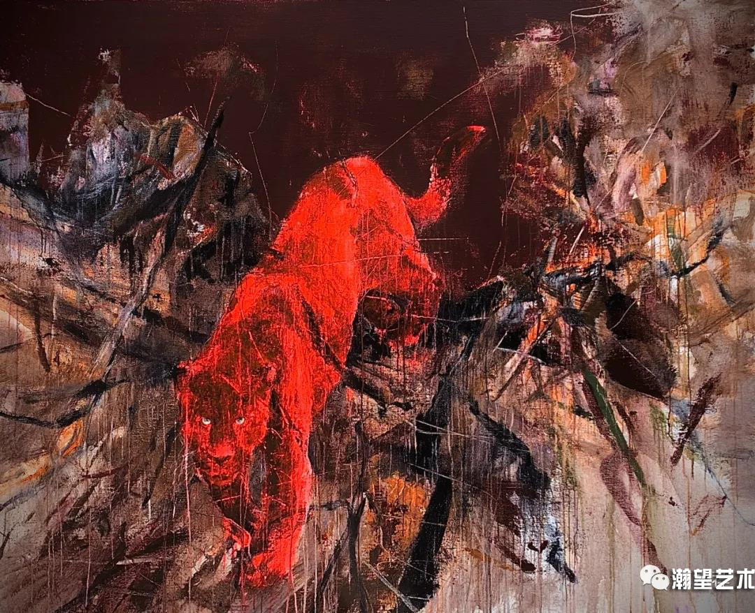 認(rèn)識明華,始自其狂放筆觸下那只霸氣十足的貓,自此,《紅貓》系列油畫成了頭腦中揮之不去的魅惑。正如畫家所言:“當(dāng)藝術(shù)作為一種媒介使人心靈產(chǎn)生巨大的震撼之時,一切的語言都是蒼白的?!泵魅A作品中那對瞬間即逝的情緒的捕捉和對色彩高度的把控力,令人心顫,繼而魂飛魄散……