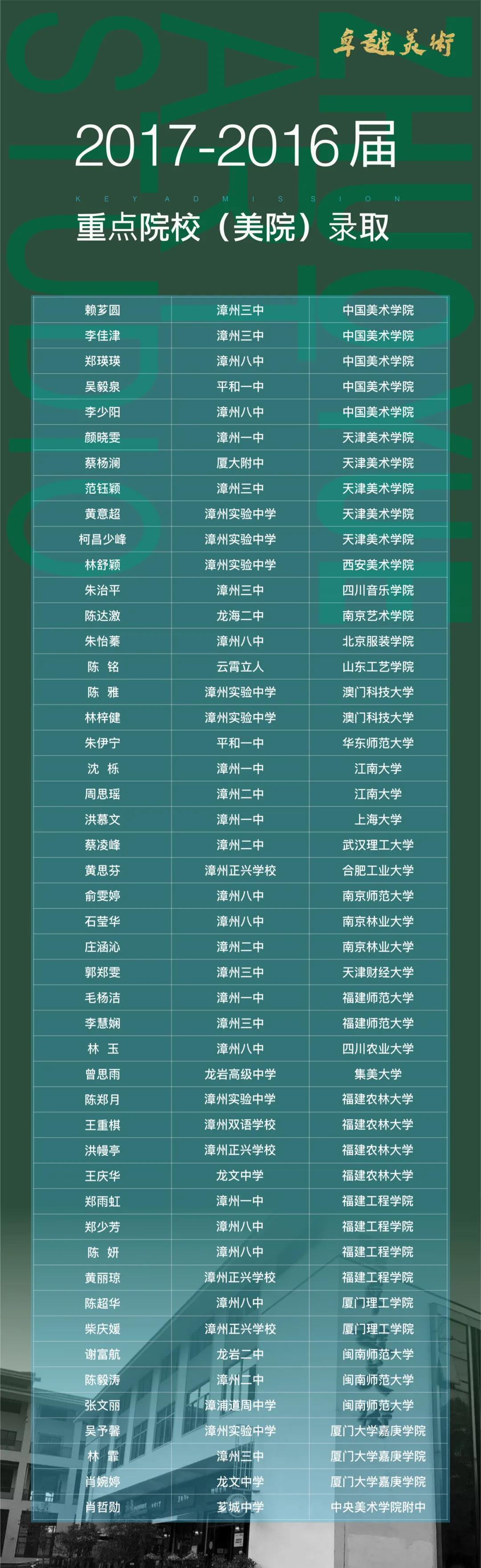 至創(chuàng)辦以來屢獲碩果,2012年陳玳鵬同學(xué)取得中國美院全國第2名,2014年沈晉同學(xué)取得中央美院全國第2名, 2015年22人次專業(yè)通過中國美術(shù)學(xué)院,林欣同學(xué)取得北京電影學(xué)院全國第6名... 2019年福建省聯(lián)考孫伯淵同學(xué)取得全省第12名... 現(xiàn)已為漳州地區(qū)輸送上百名中央美院、中國美院、天津美院、北京服裝學(xué)院、北京電影學(xué)院、廈門大學(xué)、福建師范大學(xué)、廈門工藝美術(shù)學(xué)院等重點(diǎn)院校學(xué)生,卓越美術(shù)是為漳州學(xué)子實(shí)現(xiàn)美術(shù)夢想的搖籃,愿我們共同努力,成就卓越,成就未來!