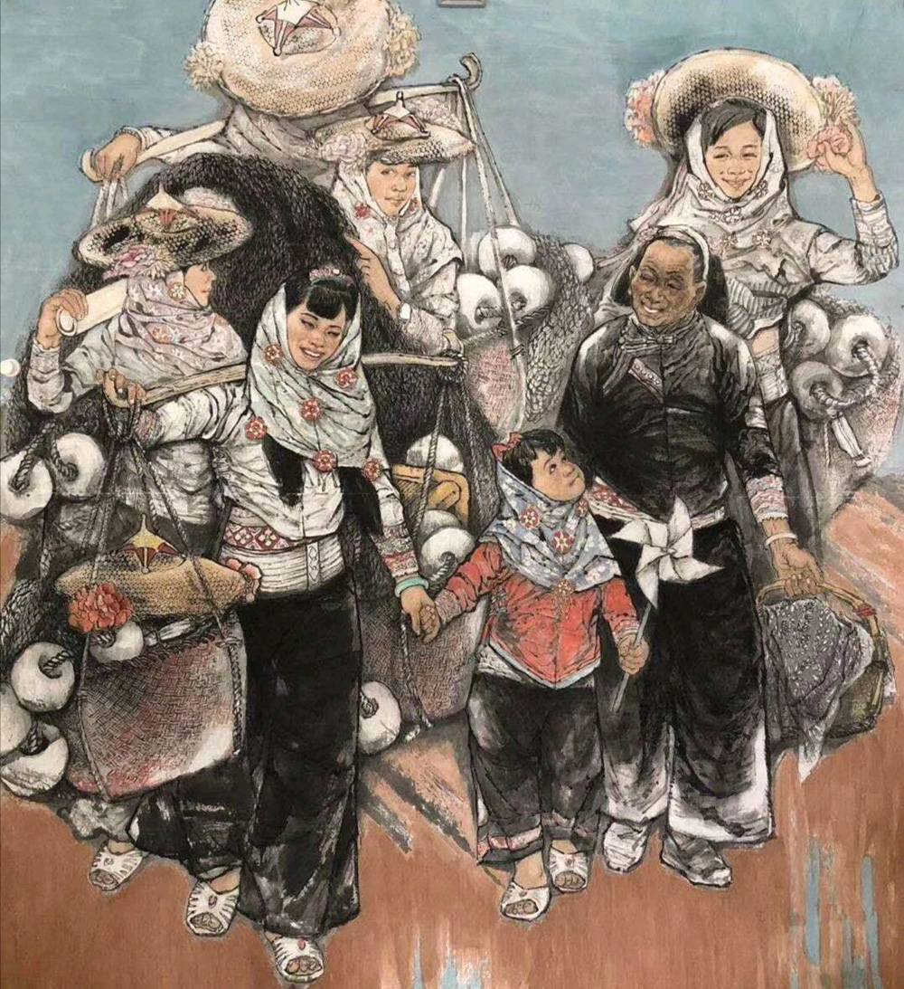 天道酬勤,筆墨不綴,博弈人生。我們北京榮寶齋畫院高研班結(jié)業(yè)后,多數(shù)同學(xué)都打道回府,而他繼續(xù)漂在北京,先后報名參加了首師大劉大為人物畫高研班、北京大學(xué)王首麟工作室訪問學(xué)者、中國人民大學(xué)宰令石書法工作室。他深知若要畫好現(xiàn)代人物畫,不僅要關(guān)注民生,還必須練好書法,書畫同源。他創(chuàng)作的人物畫,既關(guān)照現(xiàn)實又充溢著對家鄉(xiāng)偏愛的理想化,既有客觀惠安女的勤勞生動,又有主觀惠安女印象的鮮活風(fēng)情,他有很多惠安女題材的作品都入了國展,如:《惠風(fēng)吹來早》《 迀海》等,畫面彰顯著如夢的裝飾化構(gòu)成,突出了筆墨上的節(jié)奏與韻律。