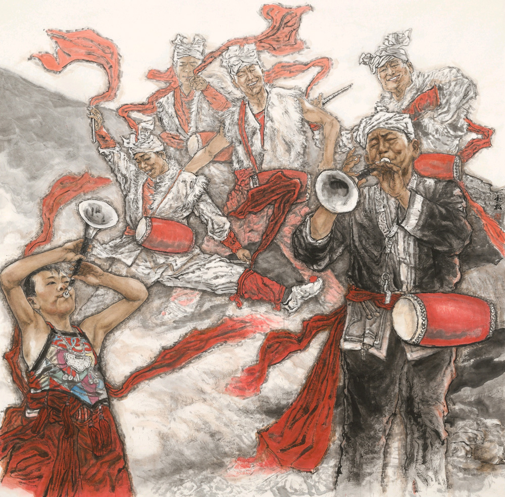 楊欽松高調(diào)做事,低調(diào)做人。畫格在一定程度上也體現(xiàn)人格,我一直以為,一個藝術(shù)家能走多遠(yuǎn),是他的綜合素質(zhì)和能力決定的。身為班長的他,儒雅內(nèi)斂,不溫不火,舉重若輕,無論是福建還是青海采風(fēng)寫生,他均以“九勢扛鼎,大器神閑”的氣韻,為大家組織與付出著。尊師重道,以誠相待。畫家們大多囊中羞澀,無論是在工作室還是在集中營(畫家們宿舍的別稱),每到飯口,他都愿慷慨解囊,心即是佛,之所以說他總是慈悲為懷,是因為不管對誰,都報以尊重,沒有分別心,真乃“修和無人見,存心有天知”。當(dāng)久別重逢的同學(xué)返回宋莊,都愿投奔于他,每每他都召集大家聚在一起,和親人一樣,讓北漂的畫家同學(xué)找到歸屬感。正因為他為人處事的方方面面都有格局,所以畫中才見大局大品,如:《鄉(xiāng)郎音》《茶余飯后》《壺口歡歌》將心中所想象的客體,用較為大膽、潑辣的筆墨表現(xiàn)出來,包括對黑色,線條,干濕濃淡焦的用墨把控,用較為洗練的筆墨交代清楚。在虛實超然間,以空為悟、以遠(yuǎn)為覺,以山為樂,以海為知,外師造化,中得心源。