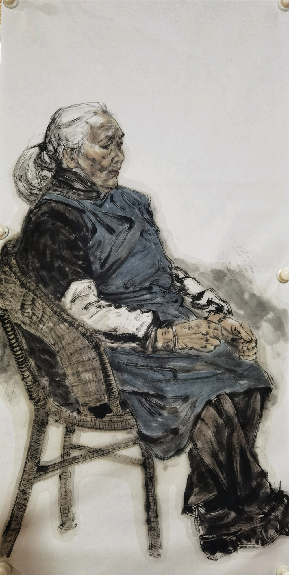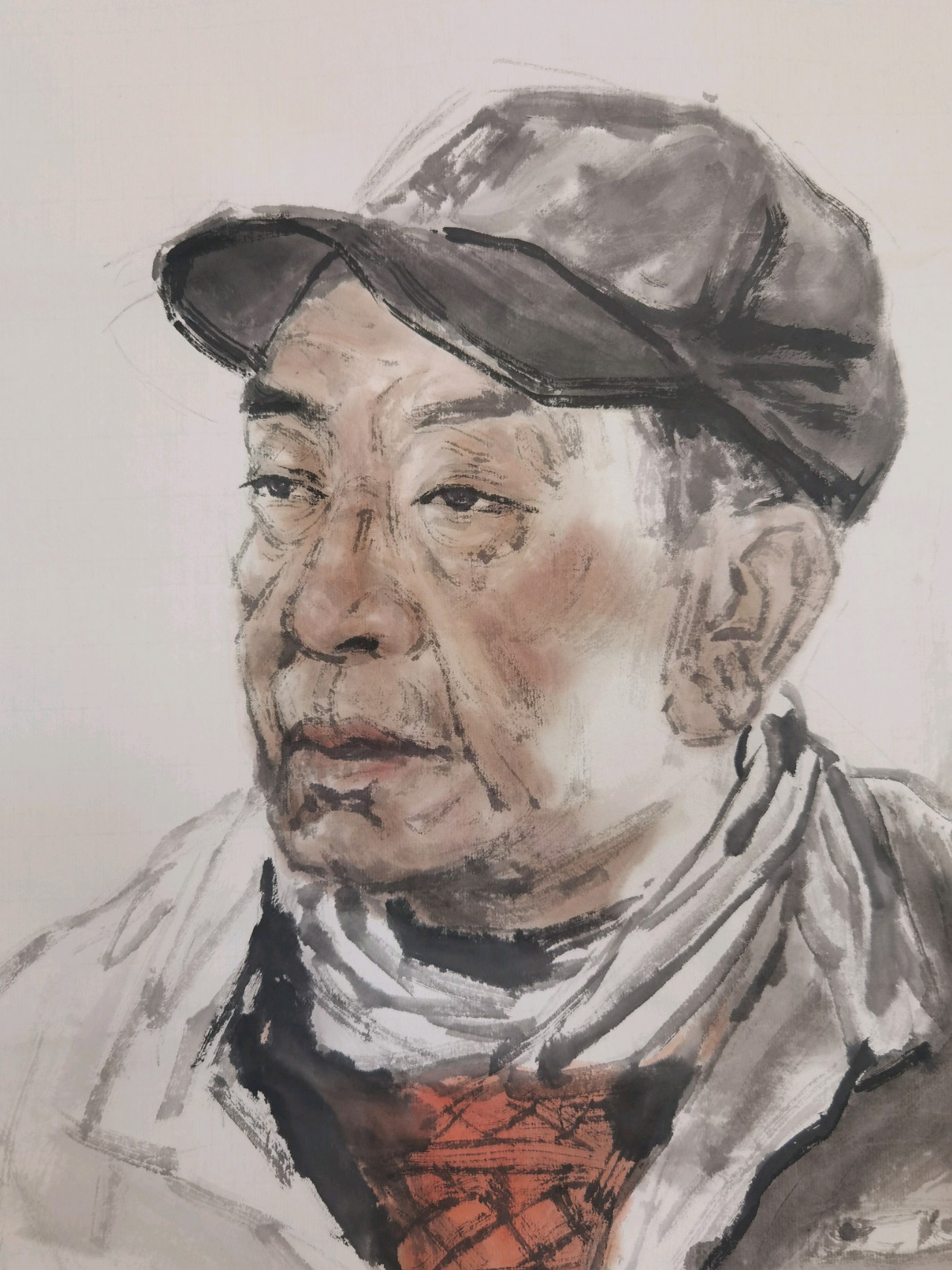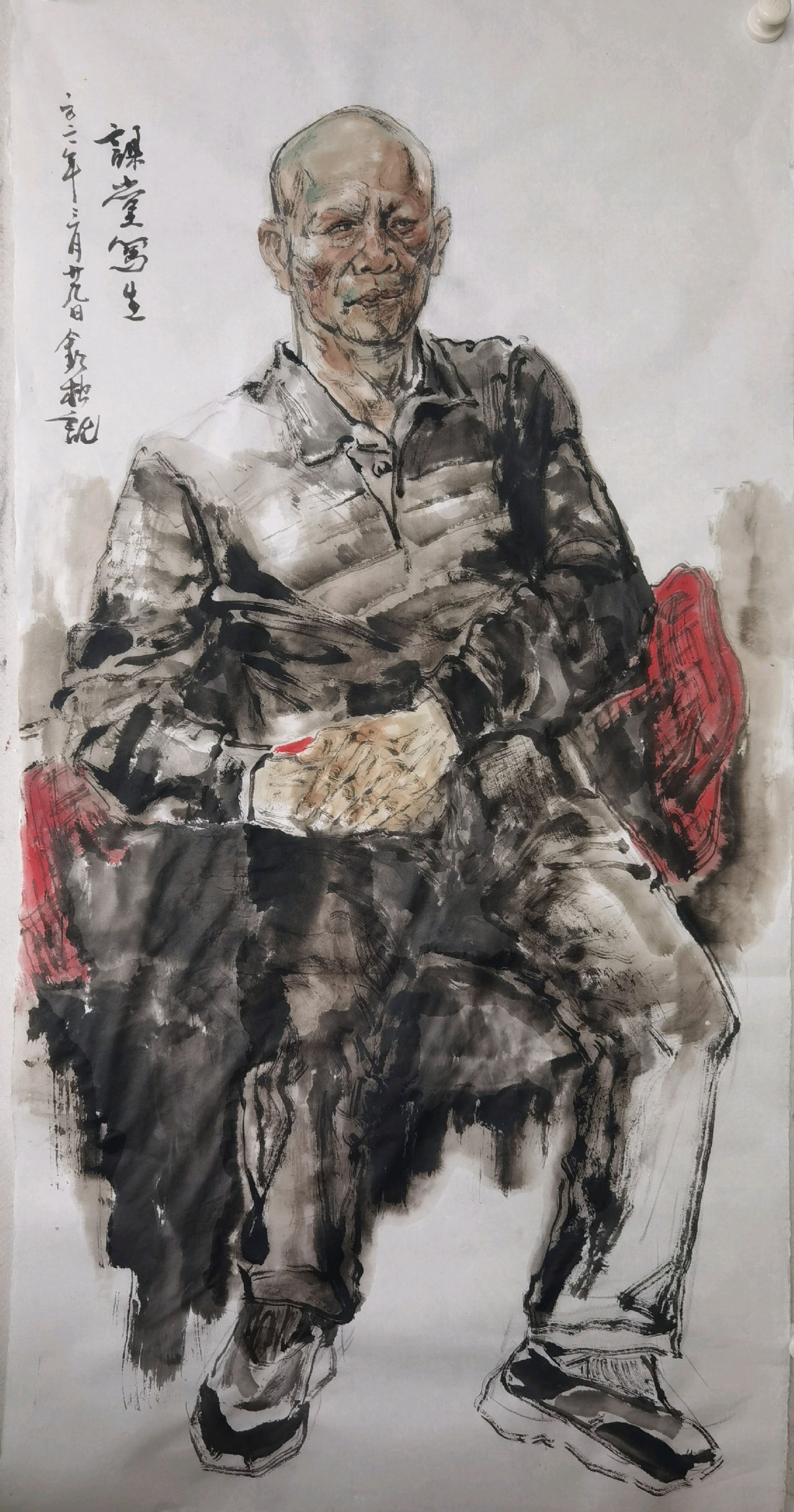 楊欽松眼睛很準(zhǔn),具有敏銳的洞察力與靈感的捕捉力。從他畫的大量寫生作品來看,筆狠墨辣,形簡意足,我們畫寫意人物畫,雖然都不追求“像”,但我認(rèn)為作為一名合格的畫家,想畫像時要能畫得像,眼準(zhǔn)是一種能力。而畫家看人準(zhǔn)的另一個標(biāo)志是,有敏銳的洞察力與覺知力,能對模特的性格特點、思想情緒,有著精準(zhǔn)的判斷與把握,甚至能洞悉靈魂深處的東西,這更能看出畫家的思想、修養(yǎng),不單是運用筆墨技巧的能力,更是功夫在畫外、見心見性見品格的能力。再就是靈感的捕捉力,畫人物寫生作品化,這就要求畫家通過現(xiàn)場人物模特,觸發(fā)自己的創(chuàng)作靈感并能瞬間捕捉到,還能迅速落于筆端,現(xiàn)于紙上,最終達(dá)到離形歸神的效果。這三方面在他創(chuàng)作的大畫上也多有體現(xiàn)。