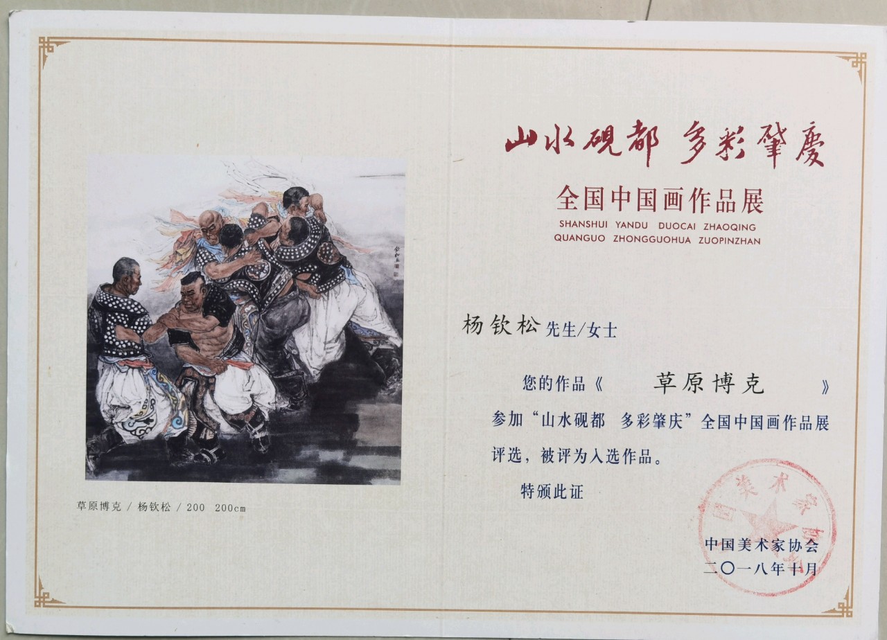 又如他的《博》、《草原博克》、《王者歸來》,我的理解楊欽松畫這幅畫是在表達(dá)自己一路走來的不易,經(jīng)得起摔打,博弈人生,表達(dá)一種對抗,這種對抗不是與社會的對抗,不是與別人的對抗,而是自己與自己的對抗,并且他將個人的經(jīng)驗上升為普遍經(jīng)驗的時候,這幅畫就站立了,這是他在榮寶齋畫院結(jié)業(yè)后到首師大深造后最初創(chuàng)作的大畫,代表了個體與人物畫創(chuàng)作之間的一種挑戰(zhàn),是對筆墨語言、人生經(jīng)驗、思考深度等因素的綜合展現(xiàn)。并且,分別入選“百年國藝”全國寫意人物畫展和“山水硯都 多彩肇慶”全國中國畫作品展等。
