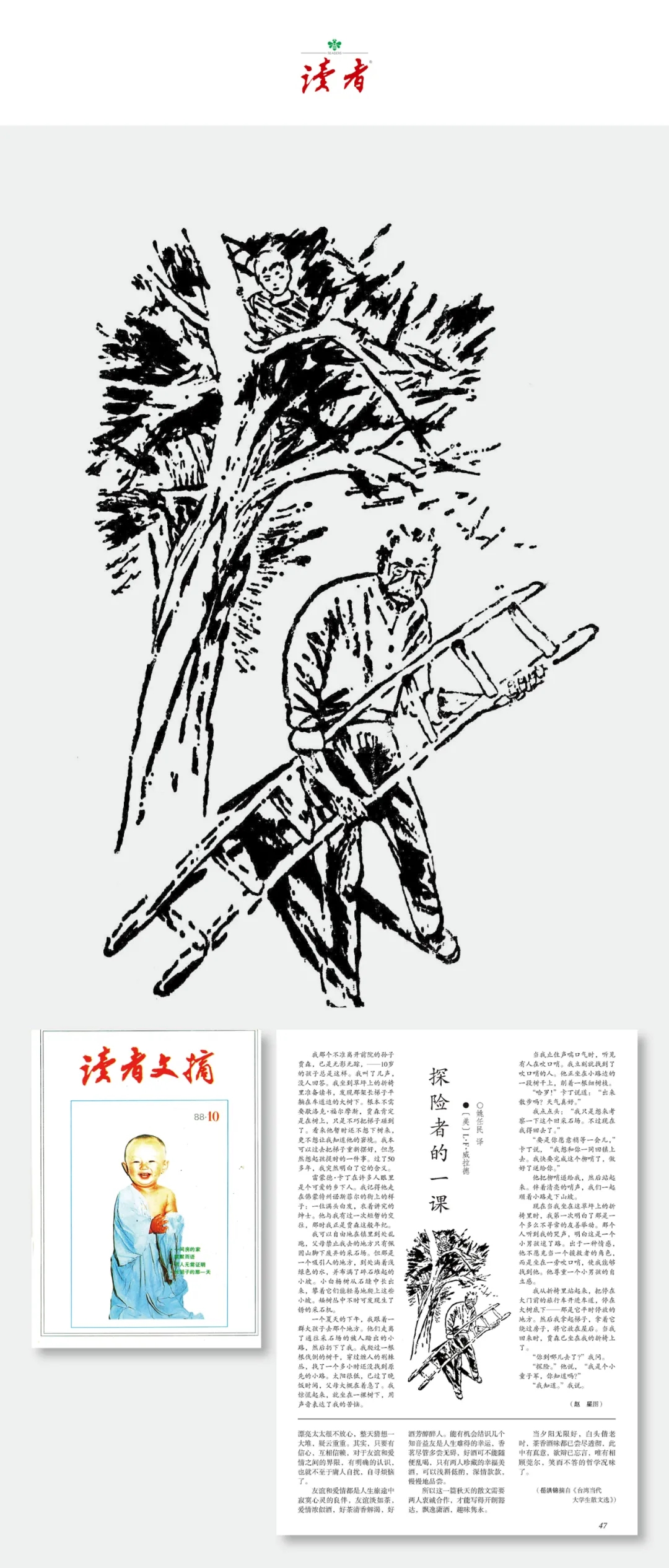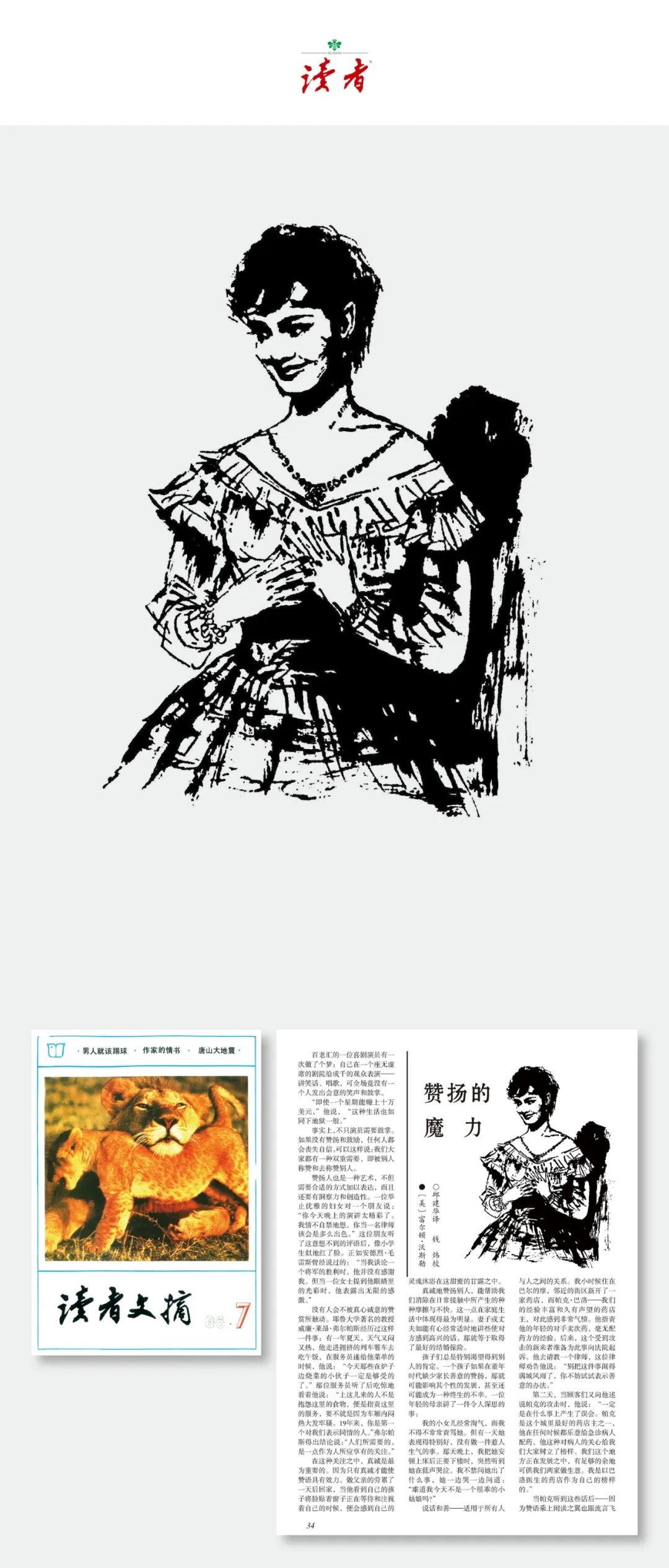 《讀者》雜志創(chuàng)刊初期就認(rèn)識(shí)到插圖對(duì)于刊物的重要性,一副優(yōu)秀的插圖是以文學(xué)作品為緣起,為文學(xué)作品增光添彩,就其藝術(shù)地位而言,也可與文學(xué)相提并論。我十分高興地看到,《讀者》雜志40年來(lái)的辦刊歷程中一直高度重視插圖作品的水平和質(zhì)量,這是《讀者》雜志深受讀者喜愛的原因之一。在這40年中,我與《讀者》風(fēng)雨同行,很榮幸地成為《讀者》走向輝煌的見證者。