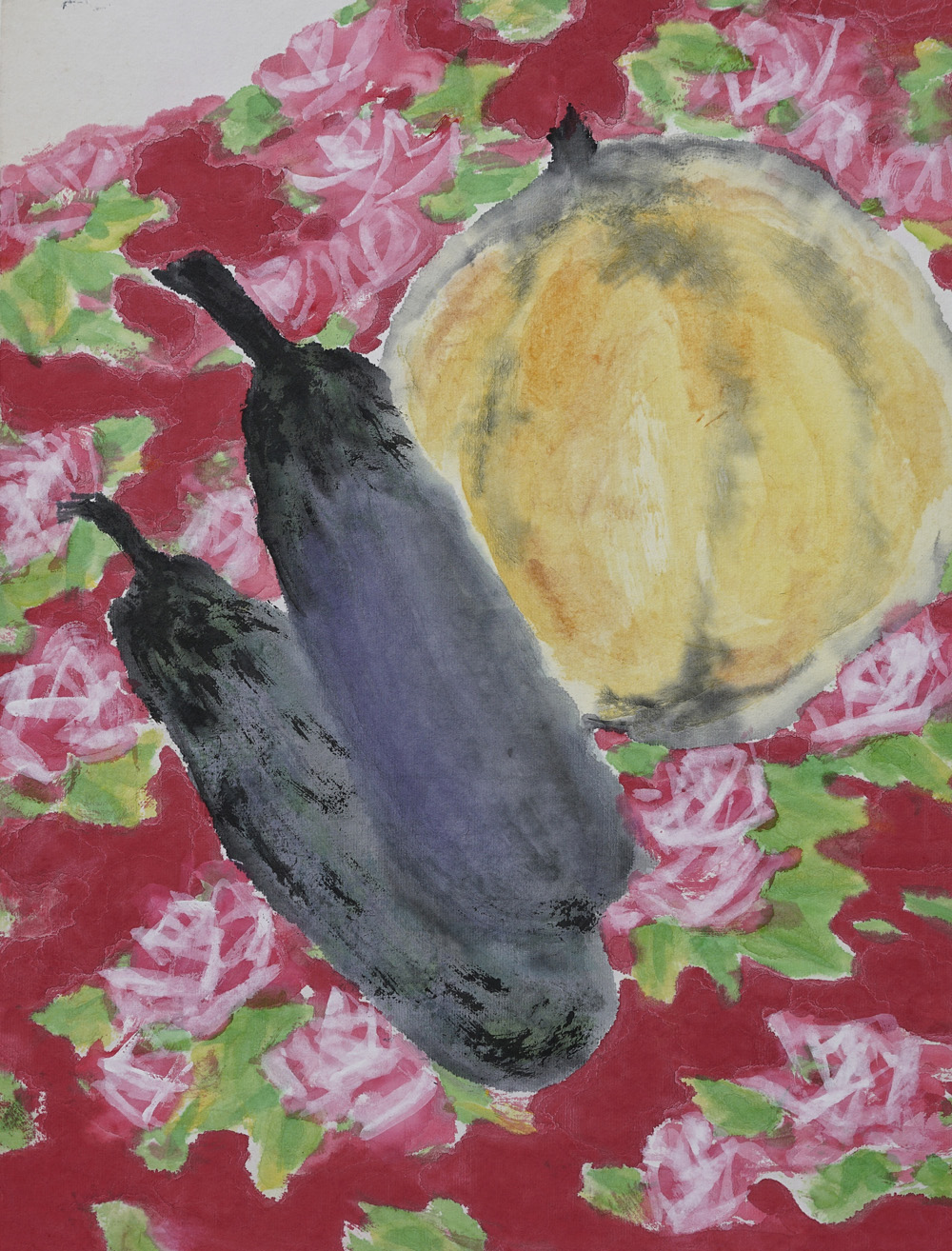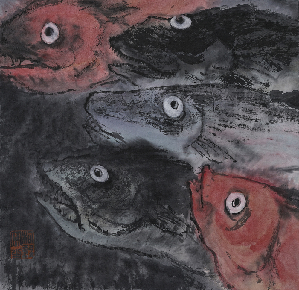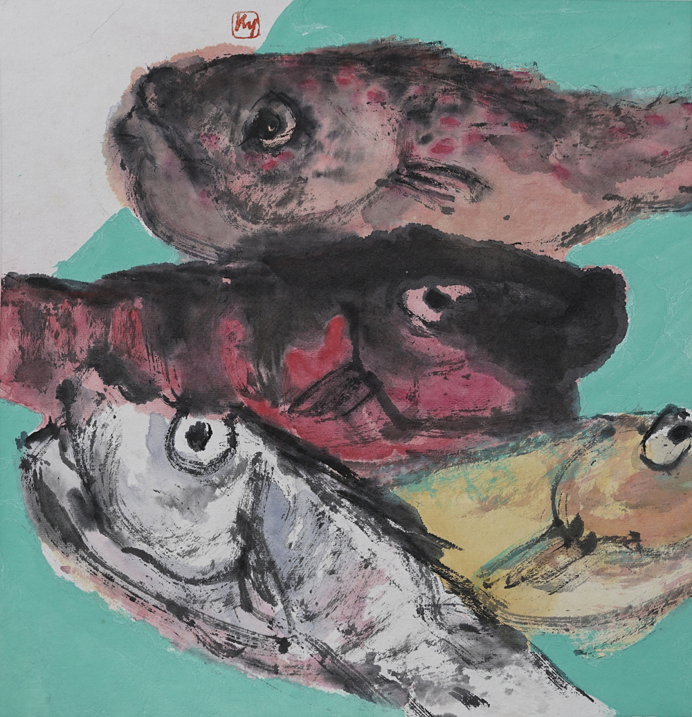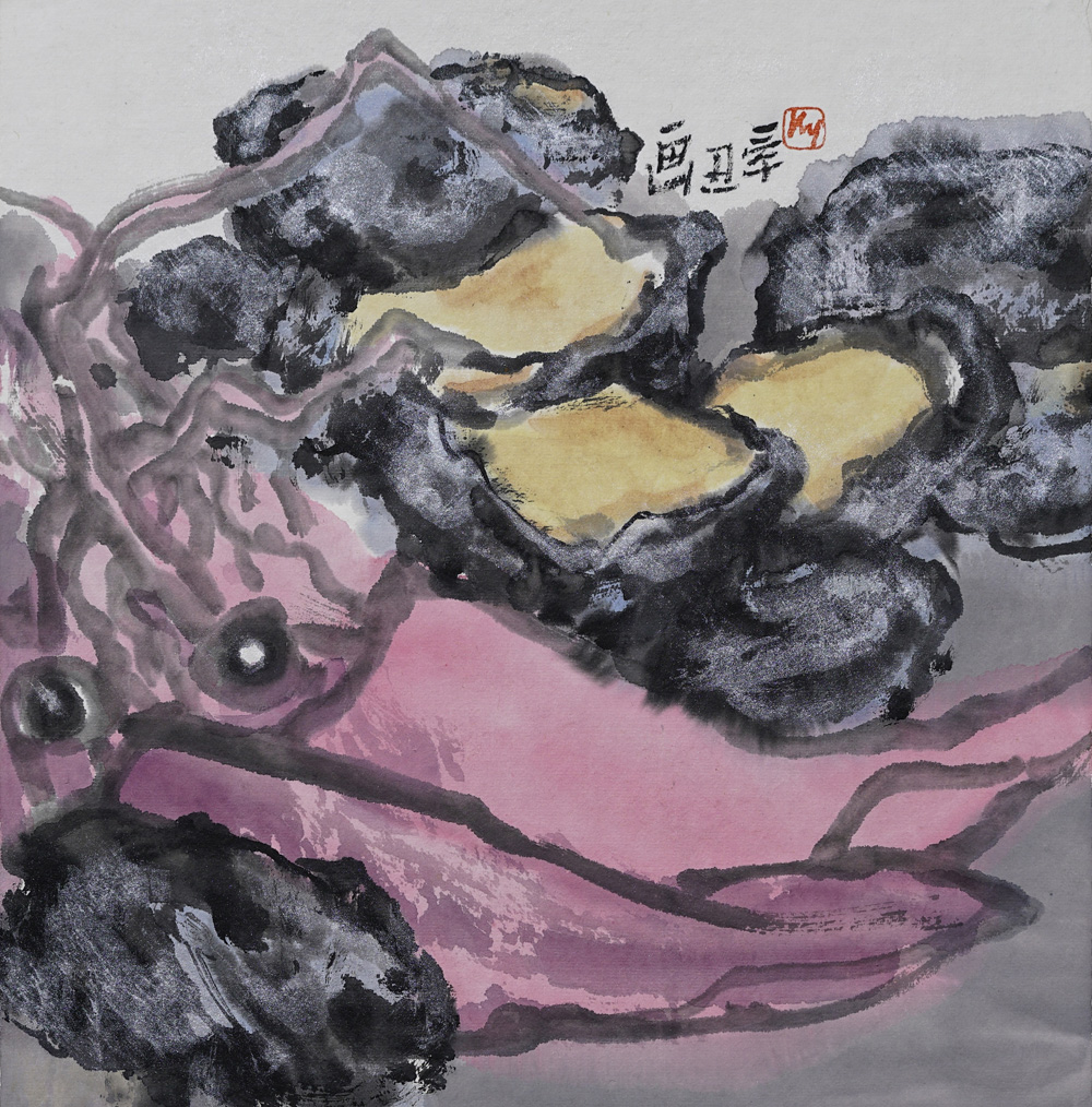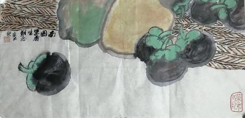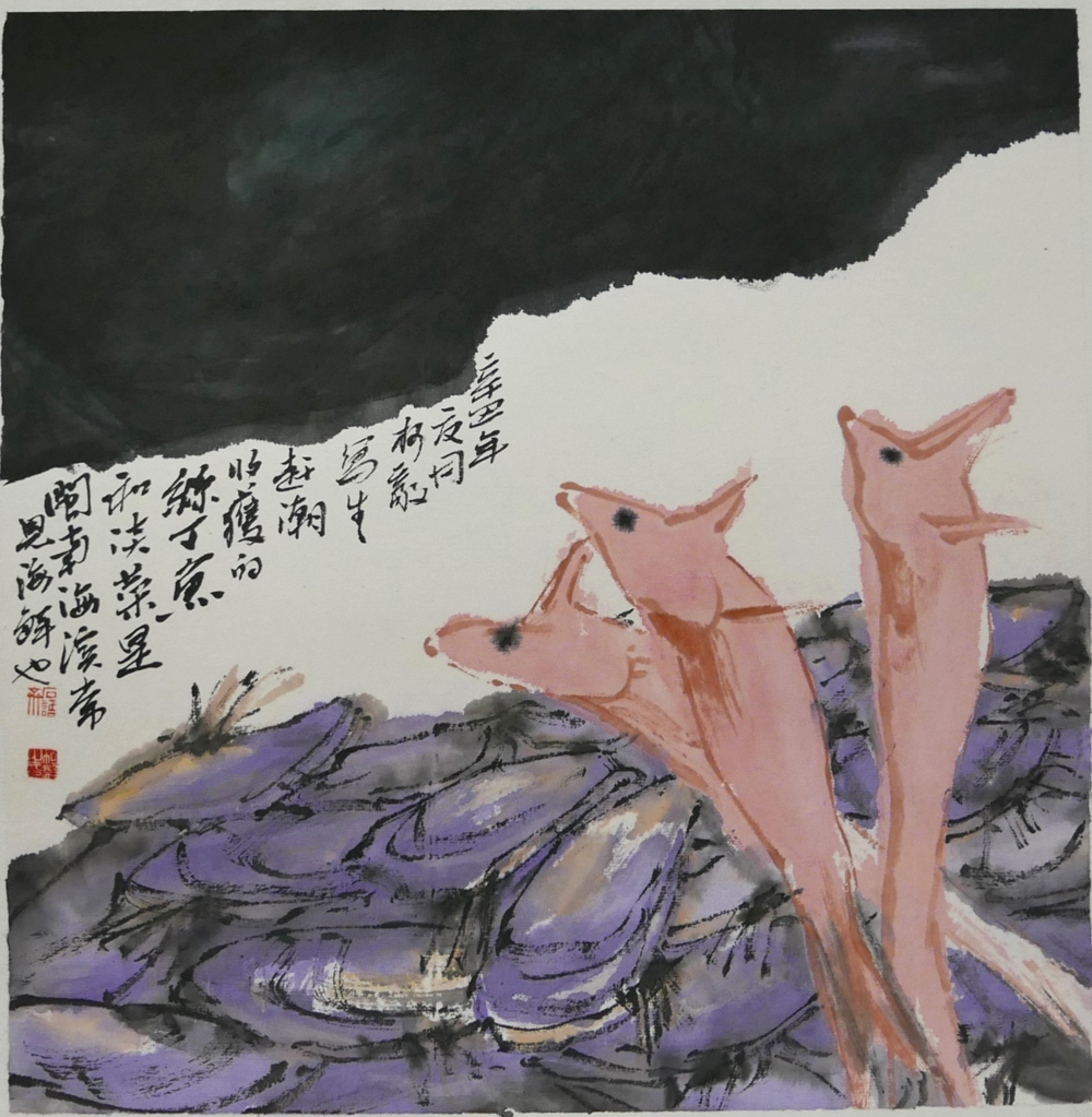 在柯毅“漳州”題材的作品中,我尤其喜歡他近來所畫的“菜市所見”系列。這些作品以大寫意摹漳州的海味與果蔬,卻跳脫開此類國畫常用傳統(tǒng)意象,寫實又富有創(chuàng)意。而粗放有力的線條,淋漓恣肆的色彩,更象征著漳州人的豪放與生命力。蔥與辣椒似乎要動起來了,而菠蘿、石榴有其粗糲的質(zhì)感,紫色的大蟶、如山的蠔殼、綠色的海蟹、張開嘴的絲丁魚、翻白眼的剝皮魚、爪須盡張的魷魚等等,讓人看了既感動又痛快。正是這樣的風(fēng)物養(yǎng)成了漳州人開放而頑強的海洋性格,而柯毅準(zhǔn)確又生動地將之表現(xiàn)了出來——或毋寧說漳州人柯毅正是這樣的性格,其所寫的亦是自身。