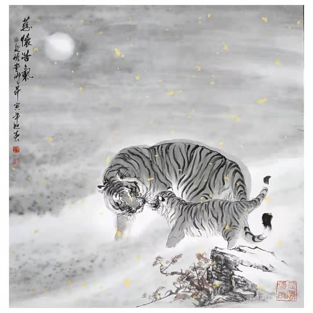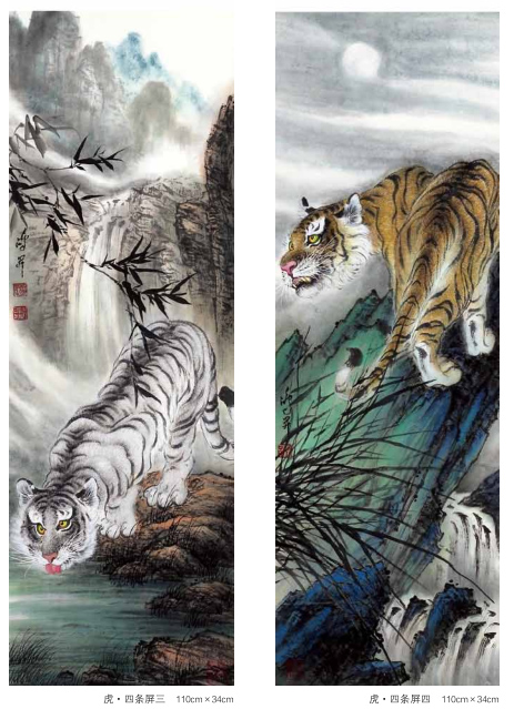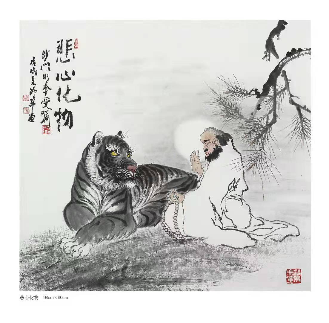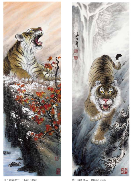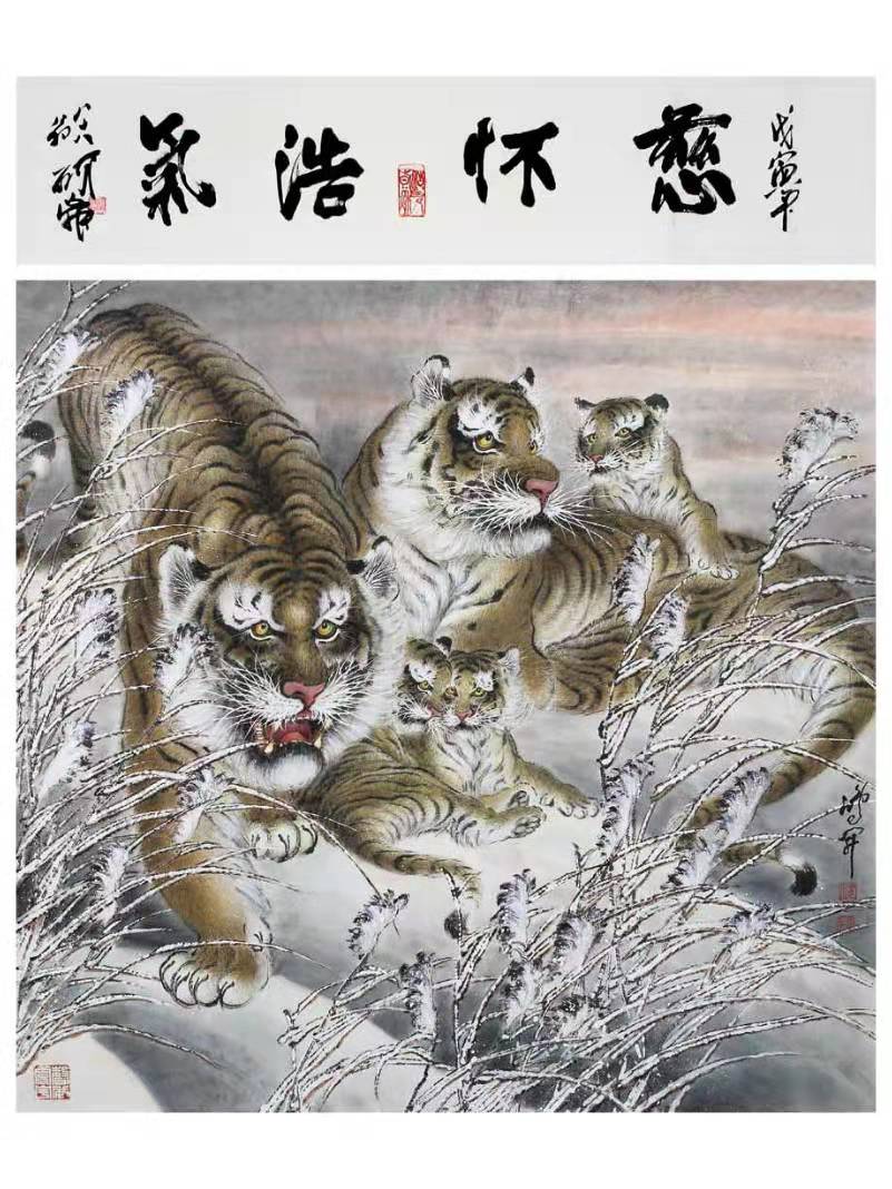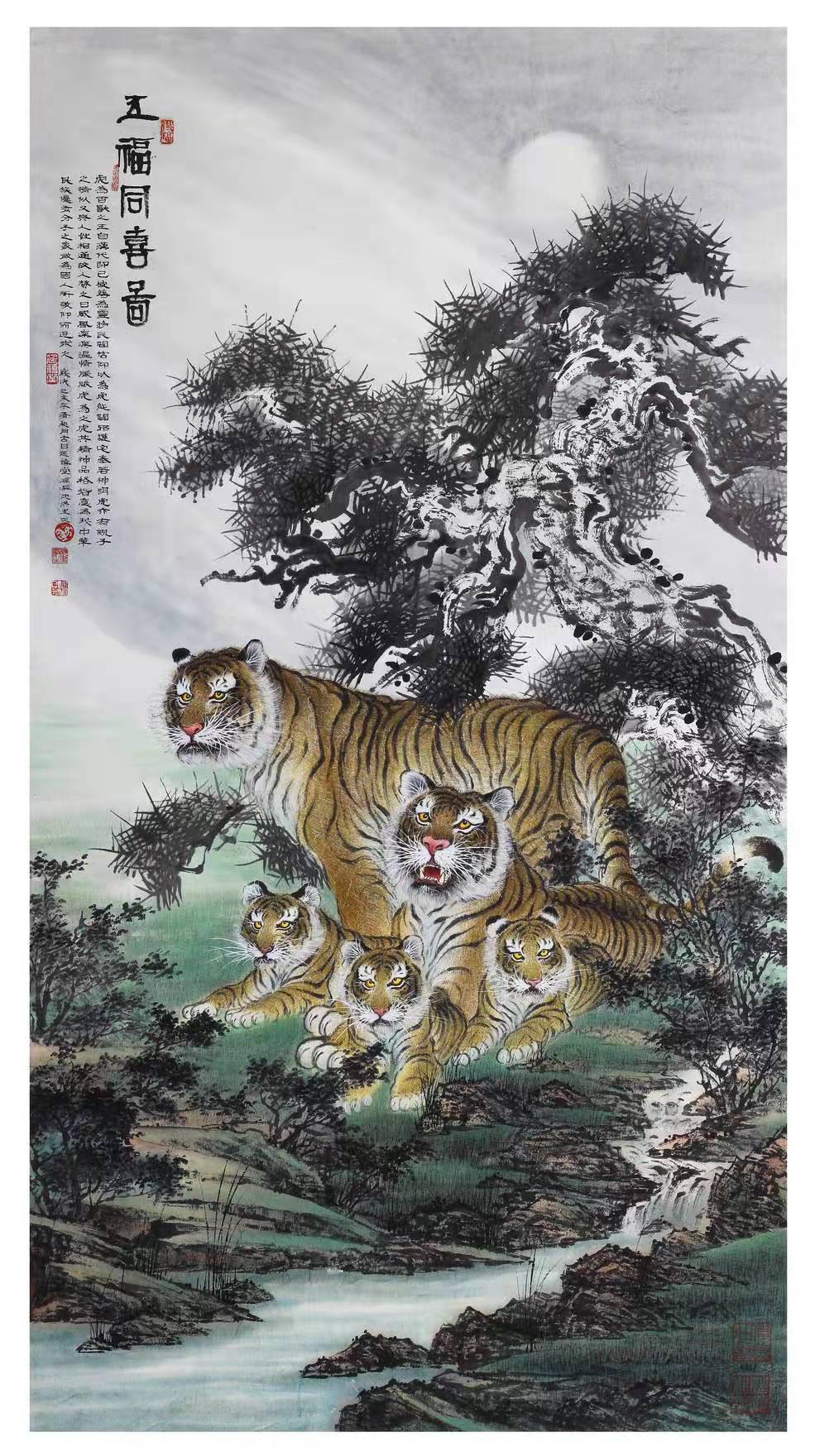 托物言志,是中國(guó)畫重要的、普遍的創(chuàng)作思路,鴻昇畫虎自然也是借畫虎以抒發(fā)自己的情懷。他筆下的猛虎充滿豐富的情感意味,有和諧一家的五虎圖《慈懷浩氣》,有月夜屹立高崗長(zhǎng)嘯驚天動(dòng)地的《卓立雄風(fēng)》,有氣勢(shì)磅礴凌空飛躍的《聲威震宇》,有靜聽高僧講經(jīng)的《悲心化物》,有信步紅葉危巖的《聽秋》,更有充滿祥和氣氛的《五福同喜》……虎年賞虎畫,虎年大吉祥。他畫虎的立意是將虎擬人化,借畫虎畫出人間百態(tài),贊美慈愛、勇敢、正直、善良的傳統(tǒng)美德,弘揚(yáng)祥和、寬容、博大、壯美的文化精神。