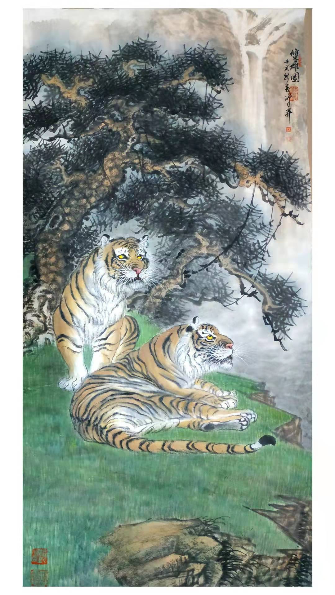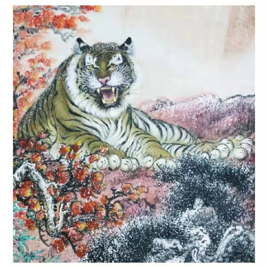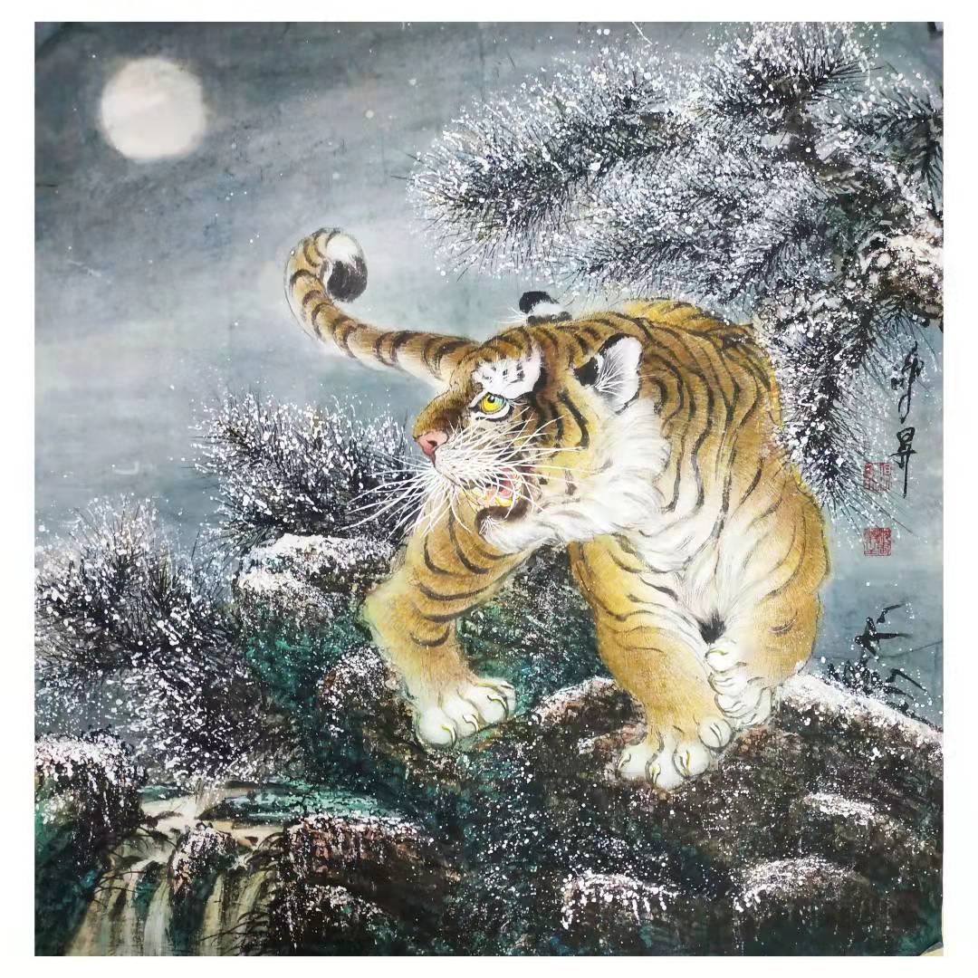 鴻昇畫虎直接師承沈錫純,畫虎以工整細(xì)致畫風(fēng)為主,刻畫精微,毫發(fā)畢現(xiàn)。中國(guó)畫重在寫意,鴻昇畫虎突出猛虎的精氣神,老虎的眼睛是他刻畫的重點(diǎn),造型夸張,用色層層套染,目光如炬。老虎之美,在其虎紋,鴻昇精細(xì)刻畫老虎皮毛,真實(shí)可感。隨著藝術(shù)上的發(fā)展,他后期的意筆老虎,筆簡(jiǎn)意豐,生動(dòng)傳神。