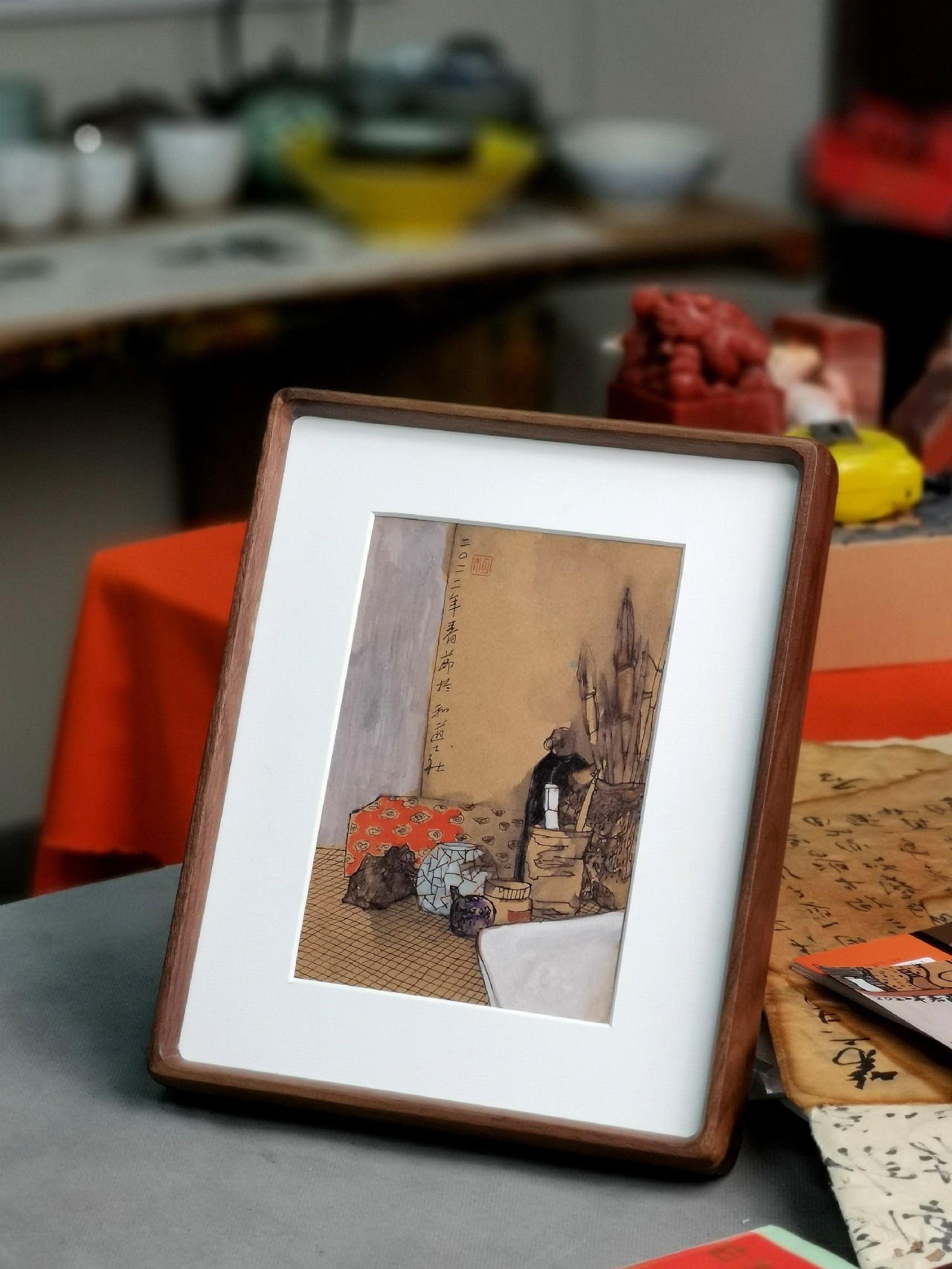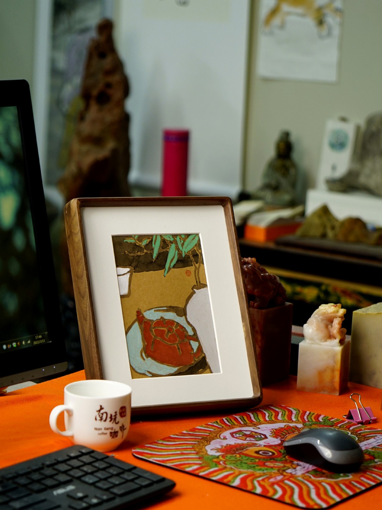 閩南之地,茶風(fēng)最盛,三五人的茶聚隨時(shí)隨處可見。和道工社的茶會(huì)亦是不少,新舊物件也算是多的了。行走其間,茶席、文房用具、竹椅、綠植還有蹦蹦跳跳的小黑貓墨汁,這些場(chǎng)景和物件,自然是可以直接入畫的。興致一起,畫數(shù)量和內(nèi)容就多了。這些小畫比起古人的博古圖,雖然少一份文人畫的清雅,但多了一份真實(shí)和有趣。