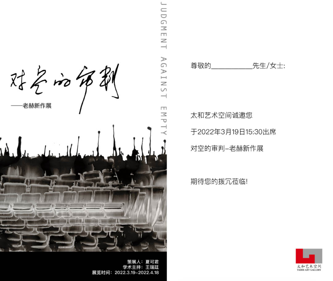 太和藝術(shù)空間榮幸地宣布,將于2022年3月19日下午15:30舉辦《對空的審判-老赫新作展》開幕式,本次展覽是繼2017年至今太和藝術(shù)空間舉辦的老赫先生第二次個(gè)展。本次展覽共展出作品40余幅,均為老赫先生新作。老赫,本名吳國全。八五藝術(shù)老炮,在40多年的創(chuàng)作生涯中嘗試過油畫、裝置、行為、影像、水墨等各種藝術(shù)表現(xiàn)形式。難能可貴的是他一直保持著一種創(chuàng)造的熱情和藝術(shù)重生的新鮮感。他沒有陷入自我的重復(fù),而是每一次的藝術(shù)創(chuàng)作都是一場生命的重新開始。他創(chuàng)造的靈感似乎隨時(shí)都會(huì)觸機(jī)而來,他的藝術(shù)不僅是一種表達(dá),更是一種生命的需要。藝術(shù)即救贖,“處處皆藝術(shù)”。尤其是近幾年老赫專注于硬紙水墨作品創(chuàng)作,在一個(gè)極為狹窄的語言范圍內(nèi)不斷深挖,從觀念、媒介、工具到表達(dá),構(gòu)建起了一個(gè)獨(dú)立的純化的視覺語言系統(tǒng),豐富而單純。本次展出新作以“對空的審判”為主題,體現(xiàn)了老赫先生對中國古老水墨藝術(shù)進(jìn)行現(xiàn)當(dāng)代轉(zhuǎn)換的批判性思考及反復(fù)地藝術(shù)實(shí)踐成果,讓我們更直觀感受到“黑白藝術(shù)”的當(dāng)代價(jià)值。