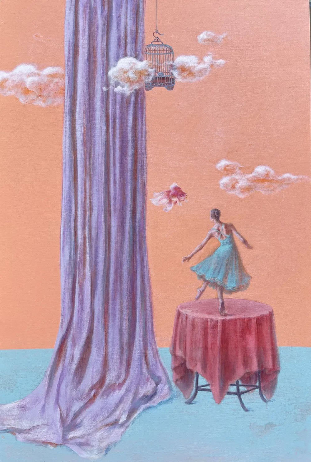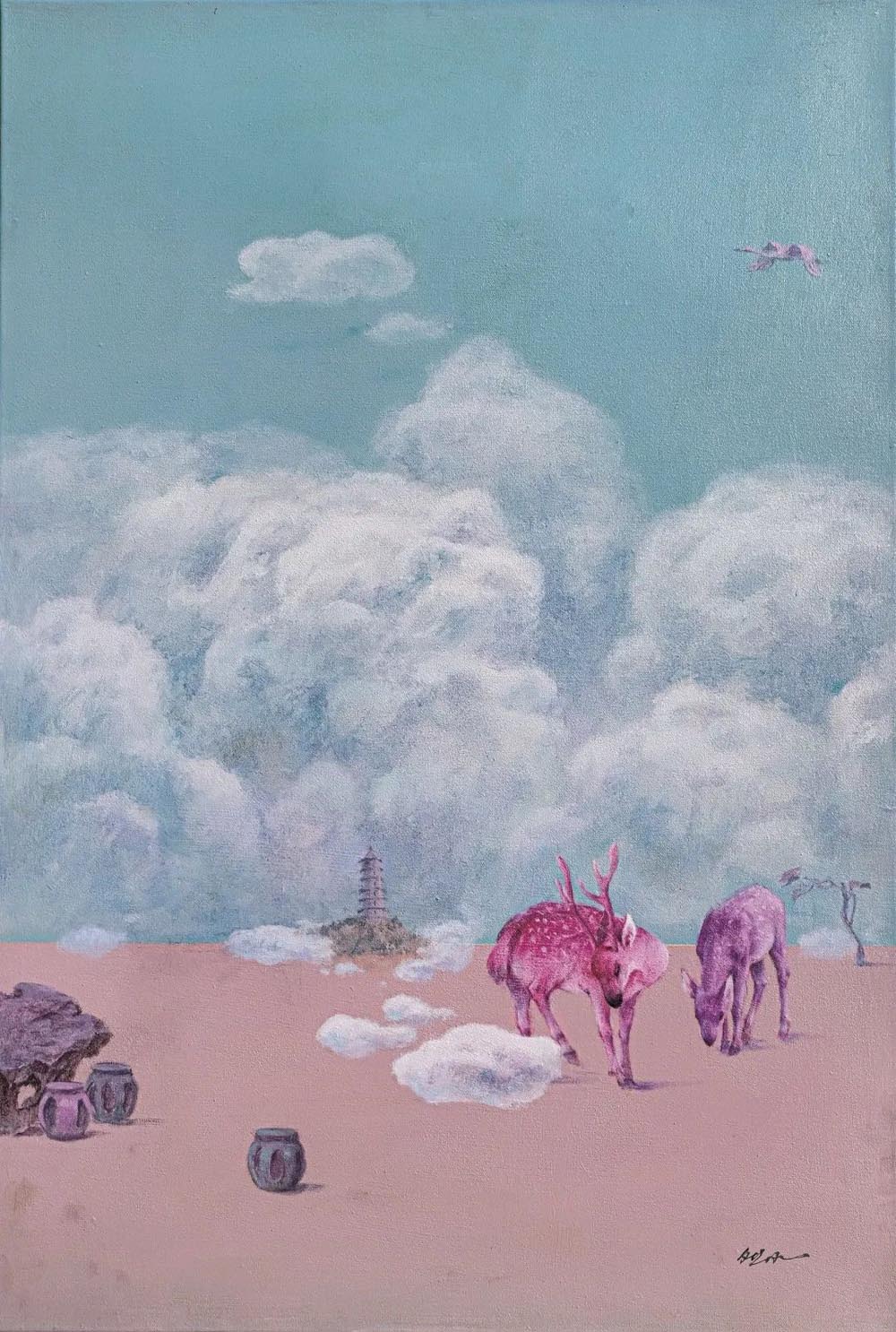 譚軼瑋的作品一直在表達“希望”,畫面中的人物、飛魚、馬、鹿、鶴、云彩、世外桃源般愜意安適的地方,無一不是在向觀者訴說著對美好生活的向往。