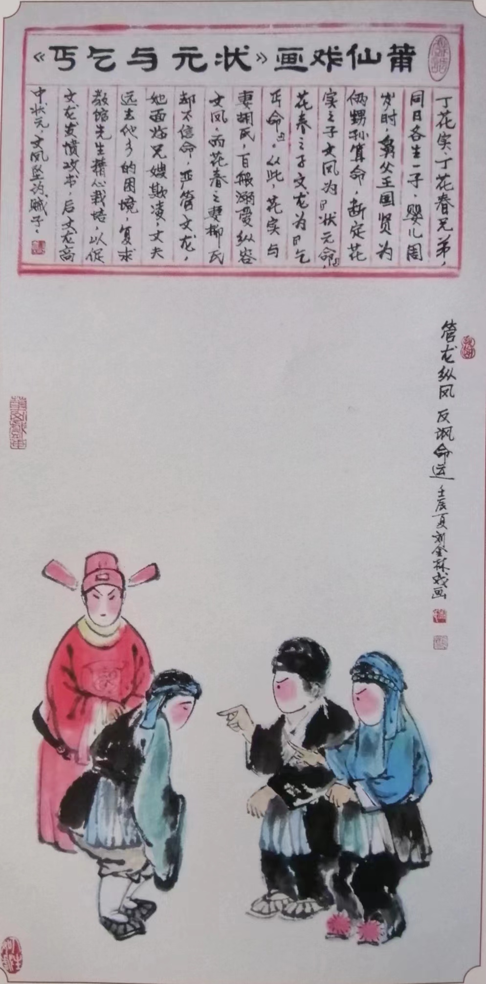 金林對(duì)傳統(tǒng)文化情有獨(dú)鐘,這來(lái)源于他長(zhǎng)期從事基層文化工作有關(guān),他常年走村穿巷,廣收博采,于紛繁的史實(shí)中發(fā)現(xiàn)閃光點(diǎn),從枯燥的典籍里洞見(jiàn)不平凡,更在廣泛的交際間搜得許多新鮮事,進(jìn)而成為漫畫創(chuàng)作源泉。他把平日收集到的古代笑話縮編成短話,并配上漫畫,其漫畫系列作品《笑話笑畫》、《十二生肖笑話笑畫——錢錢錢》幽默詼諧,妙語(yǔ)連珠,使人開(kāi)心拊掌,忍俊不禁而開(kāi)懷大笑。金林對(duì)傳統(tǒng)的生肖、福、童趣等吉祥文化積淀豐厚,故能將其自如地溶入畫中,如“十二生肖十二福”“全家?!钡茸髌罚溲澎`動(dòng),意韻高深,畫面構(gòu)圖形態(tài)生動(dòng)逼真,畫格韻新,傾注他的獨(dú)運(yùn)匠心。豐厚的莆田地方文化藝術(shù)底蘊(yùn)也讓他看得更遠(yuǎn),創(chuàng)作的領(lǐng)域更寬,技巧更熟,由于他對(duì)莆仙戲文化積淀的厚積薄發(fā),戲筆戲墨,移情入畫,其創(chuàng)作莆仙戲系列漫畫《莆仙戲畫》系列就自然敦厚敦樸,拙趣橫生,不但入展莆田市首屆書畫藝術(shù)節(jié),還入選了福建省美協(xié)主席團(tuán)成員展。近年來(lái),金林又在探索把漫畫特有的語(yǔ)言,用中國(guó)水墨畫的手法來(lái)表現(xiàn)、去傾說(shuō),尋找融合的“密碼”,傳遞心靈的信息,并以莆田俗諺、打油詩(shī)入畫,力求雅俗共賞,寓莊于諧,寓教于樂(lè),意奇味新,拙中見(jiàn)趣。