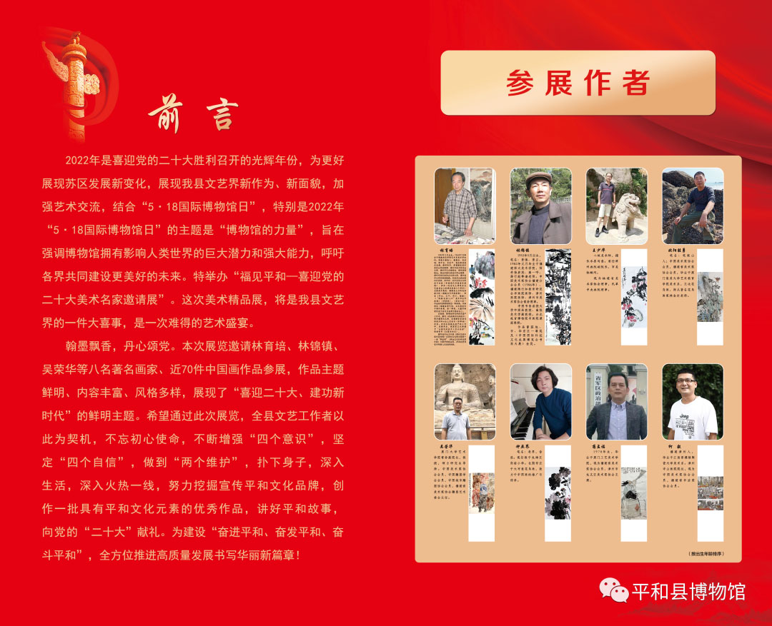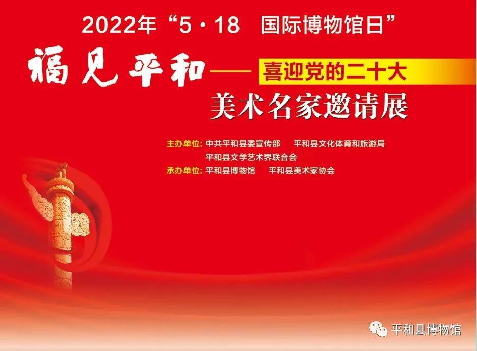 2022年是喜迎黨的二十大勝利召開(kāi)的光輝年份,為更好展現(xiàn)蘇區(qū)發(fā)展新變化,展現(xiàn)我縣文藝界新作為、新面貌,加強(qiáng)藝術(shù)交流,結(jié)合“5·18國(guó)際博物館日”,特別是2022年“5·18國(guó)際博物館日”的主題是“博物館的力量”,旨在強(qiáng)調(diào)博物館擁有影響人類(lèi)世界的巨大潛力和強(qiáng)大能力,呼吁各界共同建設(shè)更美好的未來(lái)。特舉辦“福見(jiàn)平和—喜迎黨的二十大美術(shù)名家邀請(qǐng)展”。這次美術(shù)精品展,將是我縣文藝界的一件大喜事,是一次難得的藝術(shù)盛宴。