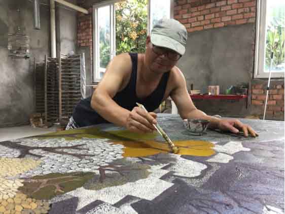 周榕清開始有點著急,心想如果還是這種狀況將影響整體作品效果和進(jìn)度。心下無奈,走到門口長吁一口氣,抬頭望著藍(lán)天白云的天空,打趣地與學(xué)生說了一句:“老天爺能下一陣雨來幫忙就好了!”因為大漆在潮濕的環(huán)境下干燥更快。