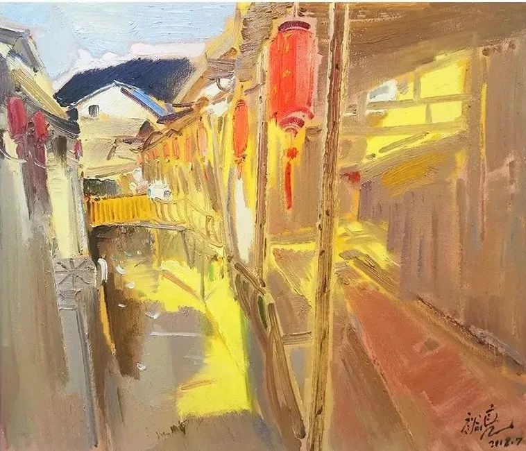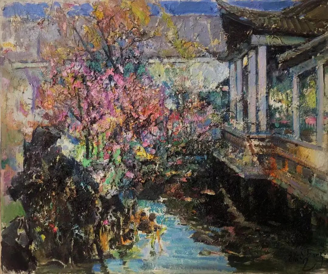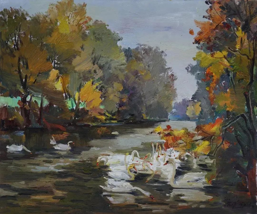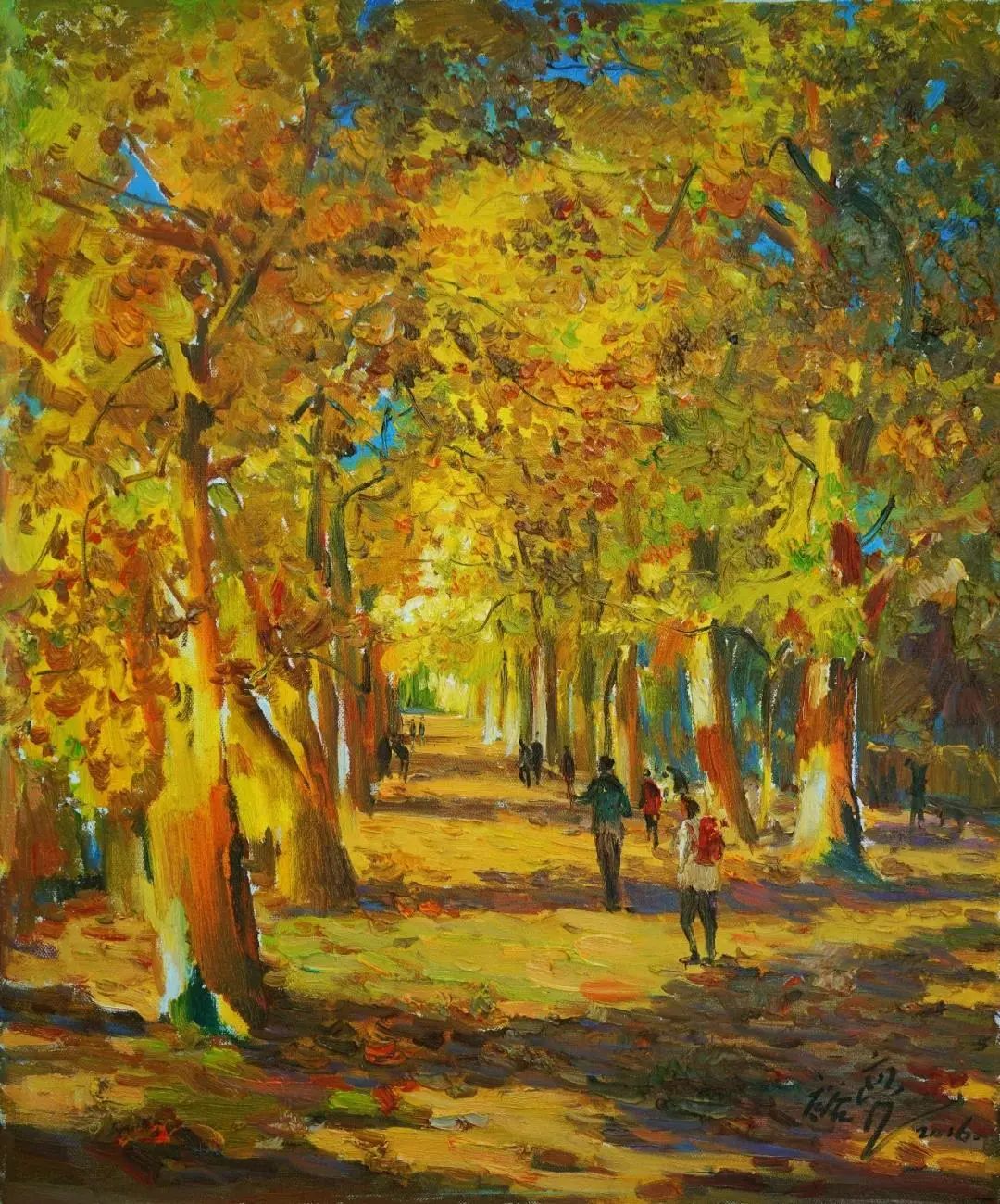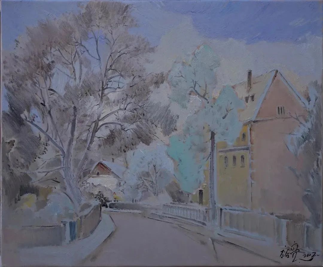 福建省缺少一所純粹的專(zhuān)業(yè)美術(shù)學(xué)院,這在無(wú)形中制約著福建美術(shù)事業(yè)的發(fā)展,特別是在人才隊(duì)伍的培養(yǎng)建設(shè)、學(xué)理研究的系統(tǒng)化、學(xué)術(shù)梳理的深度化等方面,相比起廣東、浙江等這些有著美術(shù)學(xué)院的省份,福建美術(shù)事業(yè)的繁榮發(fā)展要付出更多的心血與心力。福建師大美術(shù)學(xué)院不是專(zhuān)業(yè)美術(shù)學(xué)院,而是綜合型大學(xué)所屬的美術(shù)院系,但它是福建美術(shù)人才的重要搖籃,發(fā)揮著專(zhuān)業(yè)美術(shù)院校的部分作用。福建師大美術(shù)學(xué)院由留法歸來(lái)的著名油畫(huà)家謝投八先生于1941年創(chuàng)辦,一直以來(lái)有著優(yōu)良的西畫(huà)傳承。早期的優(yōu)秀西畫(huà)老師有留法的謝投八、留日的吳啟瑤、留菲的葉淑華等,他們教授地道的西洋繪畫(huà)技巧,奠定了師大美院的西畫(huà)學(xué)科教學(xué)基礎(chǔ)。20世紀(jì)60年代到80年代期間,又有來(lái)自浙江美院(現(xiàn)中國(guó)美院)的謝意佳、林以友、高一呼、楊思陶等老師前來(lái)任教,他們不僅帶來(lái)了前蘇聯(lián)的現(xiàn)實(shí)主義藝術(shù)觀(guān)念和表現(xiàn)技法,更重要的是,在原來(lái)的基礎(chǔ)上形成了福建師大美院的現(xiàn)實(shí)主義教學(xué)與創(chuàng)作觀(guān)及詩(shī)性寫(xiě)生的教法,形成了較完善的西畫(huà)教學(xué)體系,在省內(nèi)發(fā)揮著重要的作用,一直影響至今。福建師大美院這一傳承有序的油畫(huà)體系,一直是福建油畫(huà)發(fā)展繁榮的重要發(fā)源地。裕亮作為地道的福建師大美術(shù)學(xué)院人,他從本科、碩士、博士到留校任教,一直在這所學(xué)校學(xué)習(xí)生活,自然也就深深地烙上了母校文脈的印記。他在這樣的文脈與校風(fēng)里成長(zhǎng),秉承前輩們樸素的藝風(fēng),腳踏實(shí)地進(jìn)行油畫(huà)創(chuàng)作的探索。記得十年前裕亮去澳大利亞留學(xué),回來(lái)后,即在省美術(shù)館舉辦了個(gè)人畫(huà)展。記憶里依然記得他那批在澳大利亞寫(xiě)生的作品,整體華麗透明,在色彩的豐富性與畫(huà)面色調(diào)的統(tǒng)一性上有著鮮明的個(gè)人特征,有著太平洋島國(guó)的清新與明亮。那次留學(xué)是裕亮藝術(shù)生涯里一個(gè)轉(zhuǎn)折性的經(jīng)歷,此后他的藝術(shù)視野明顯更加開(kāi)闊,繪畫(huà)技法也有了不斷的提升,更重要的是藝術(shù)觀(guān)念、藝術(shù)思維產(chǎn)生了較大的轉(zhuǎn)變,逐漸邁向成熟,具有相對(duì)穩(wěn)定的藝術(shù)思考方向。時(shí)隔十年后,裕亮前往油畫(huà)的故鄉(xiāng)--歐洲訪(fǎng)學(xué),“此次近一年的訪(fǎng)學(xué)既是交流,更是朝圣之旅,收獲良多”,裕亮說(shuō)。與歐洲特別是與德國(guó)藝術(shù)家的交流,以及前往各博物館的觀(guān)摩研習(xí),都潤(rùn)物無(wú)聲般地充實(shí)和豐富著裕亮的油畫(huà)學(xué)養(yǎng)。前年早秋,裕亮從德國(guó)回來(lái),帶回了一百多張?jiān)跉W洲學(xué)習(xí)時(shí)創(chuàng)作寫(xiě)生的油畫(huà)作品。這批油畫(huà)作品分為兩類(lèi),一類(lèi)是歐洲各國(guó)四季景致的寫(xiě)生之作;另一類(lèi)是具有較強(qiáng)烈表現(xiàn)性的創(chuàng)作作品。寫(xiě)生作品,與十年前從澳洲回來(lái)時(shí)的有明顯的不同,藝術(shù)水平更是有長(zhǎng)足的進(jìn)步。這批作品不管是寫(xiě)生的還是創(chuàng)作的,色彩情緒更加濃郁,色點(diǎn)潑灑自由,筆觸排列交錯(cuò)縱橫有張力。比如表現(xiàn)異國(guó)深秋風(fēng)情的《小島林蔭》,對(duì)金黃之色的使用十分大膽,在紫灰色的襯托下更顯靚麗,濃烈明艷。還有一批冬日下冷灰的雪景作品,在灰冷色調(diào)的處理上格調(diào)高雅,淡雅抒情,既有印象派的細(xì)膩色差之美,亦蘊(yùn)含有東方中國(guó)畫(huà)的意象情境。