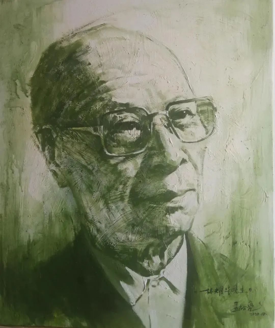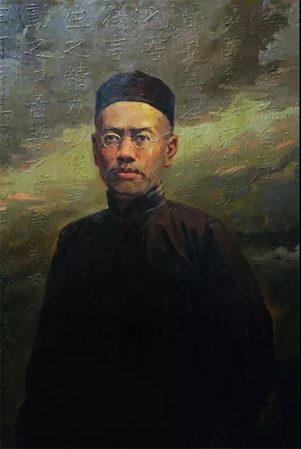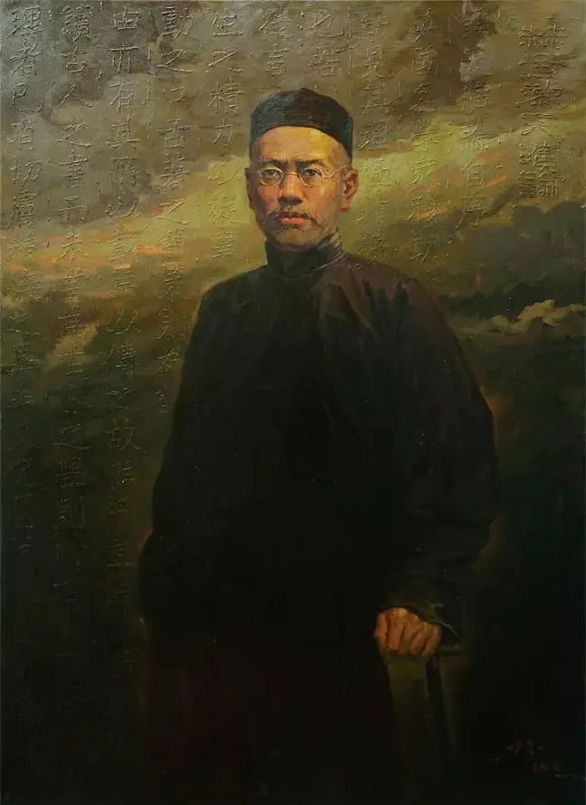 作品《嚴(yán)復(fù)》通過(guò)藝術(shù)的視覺(jué)語(yǔ)言描繪我國(guó)近現(xiàn)代著名思想家、教育家、翻譯家嚴(yán)復(fù)先生。他是中國(guó)現(xiàn)代哲學(xué)、經(jīng)濟(jì)學(xué)、社會(huì)學(xué)、法學(xué)、邏輯學(xué)、翻譯學(xué)的開(kāi)拓者和先驅(qū)。作品表現(xiàn)嚴(yán)復(fù)先生作為杰出的中西文化傳播者博大精深、學(xué)貫中西的思想學(xué)識(shí)與開(kāi)放進(jìn)取、兼容并蓄的精神境界和深厚的民族情懷。作品以肖像刻畫(huà)為主,著重表現(xiàn)嚴(yán)復(fù)先生堅(jiān)毅、智慧的改革思想和勇于追求科學(xué)與真理的精神。人物動(dòng)態(tài)微微后仰,表現(xiàn)嚴(yán)復(fù)放眼世界的胸懷,眉間緊縮,透露出“憂(yōu)國(guó)憂(yōu)民”的偉大民族情懷。作品背景風(fēng)起云涌,象征革命時(shí)代前夕的激流涌動(dòng)、變幻莫測(cè),云間透出的霞光映在嚴(yán)復(fù)臉上象征希望、理想與信念。作品背景隱隱約約透出嚴(yán)復(fù)的代表譯作---《天演論》。畫(huà)家利用厚堆材料的繪畫(huà)語(yǔ)言對(duì)文字進(jìn)行塑形,文字內(nèi)容以一種淺浮雕的獨(dú)特視覺(jué)效果給予呈現(xiàn),暗示著嚴(yán)復(fù)先生學(xué)貫中西的偉大貢獻(xiàn)。作品以巨匠的直立肖像典型動(dòng)作為畫(huà)面主體,注重肖像畫(huà)創(chuàng)作的歷史意義和價(jià)值。作品色調(diào)統(tǒng)一,色調(diào)冷灰?guī)?,樸素莊嚴(yán),冷暖互補(bǔ),給人以歷史的厚重記憶與懷念之意境。作品強(qiáng)調(diào)黑灰白的關(guān)系,用筆上講究繪畫(huà)的平面感與光線(xiàn)的主觀(guān)結(jié)合,充分發(fā)揮油畫(huà)的神秘而真實(shí)的繪畫(huà)語(yǔ)言。