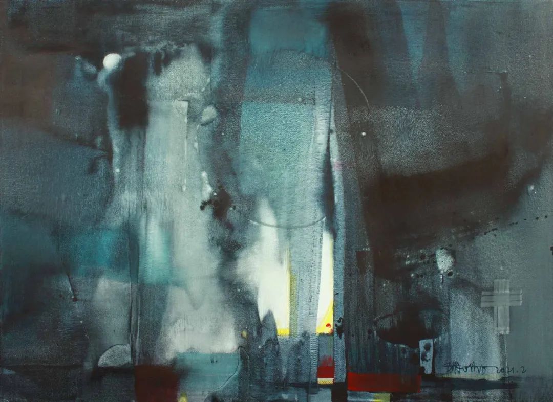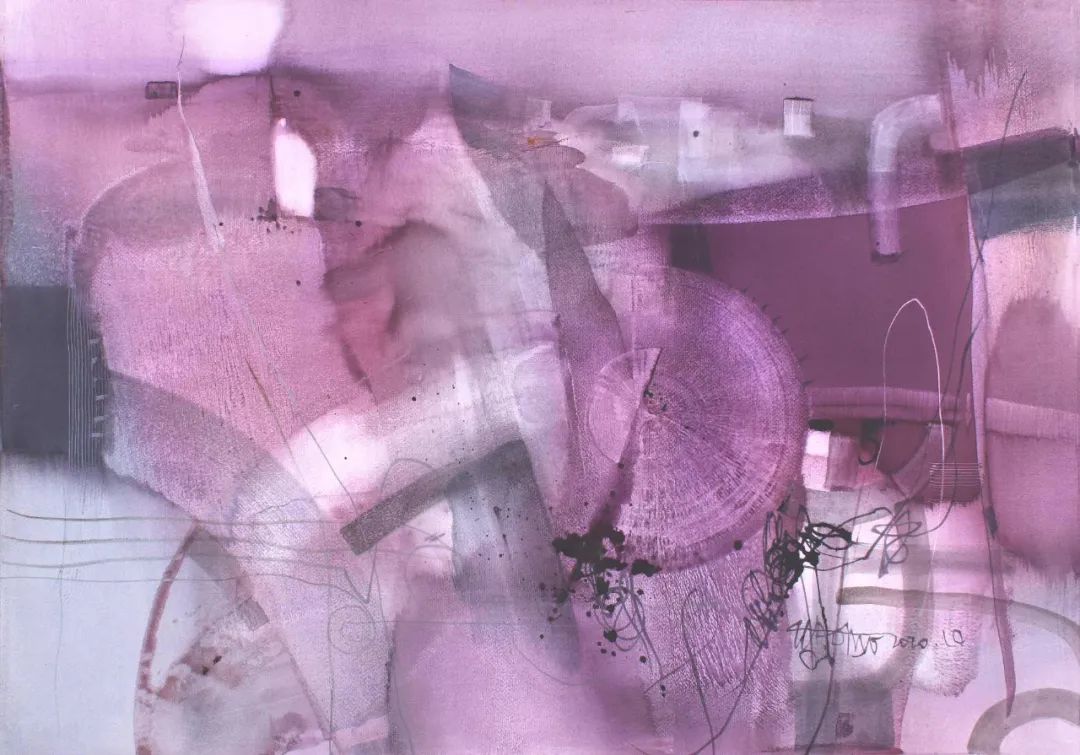 長(zhǎng)久以來(lái)我的作品記錄著我一步一步對(duì)物象消解的快意歷程。與其說(shuō)是描繪物象會(huì)妨礙宣泄胸臆,毋寧說(shuō)是我的繪畫追求自然選擇了這種審美傾向,深感很多富于情緒的乃至形而上感覺(jué)表現(xiàn)會(huì)因具體形像所囿而變得滯澀而矯情,難以暢所欲達(dá),這才導(dǎo)致了我的繪畫實(shí)踐漸漸地走向了對(duì)物象的解構(gòu)、消弭和平面化;繪畫過(guò)程也開(kāi)始拋棄具體形象的束縛而逐步變得沒(méi)有主題,沒(méi)有規(guī)劃,沒(méi)有意義、沒(méi)有方向;我只高度關(guān)注與圖面形色狀態(tài)的對(duì)視、交流,我在紙上涂抹刮擦點(diǎn)描,敏感于每一處形式的變動(dòng)及其在我內(nèi)心的精神反應(yīng);涂改即在創(chuàng)作,形色疊蓋變異之中沒(méi)有對(duì)錯(cuò)而只有心動(dòng)與否,我緊張地調(diào)動(dòng)著心智全部的美學(xué)儲(chǔ)備,悉心感受著畫面炁象的雅俗、格調(diào)和意緒的狀況,審度其結(jié)構(gòu)色彩的趣味雋永與否,直至自以為富于旨趣的意向躍然紙上,它是誘導(dǎo)畫面朝向、發(fā)展的審美動(dòng)力,它在無(wú)意識(shí)或下意識(shí)的形色構(gòu)成狀態(tài)中自然生成,無(wú)設(shè)計(jì)、無(wú)雕飾,可遇而不可求!
