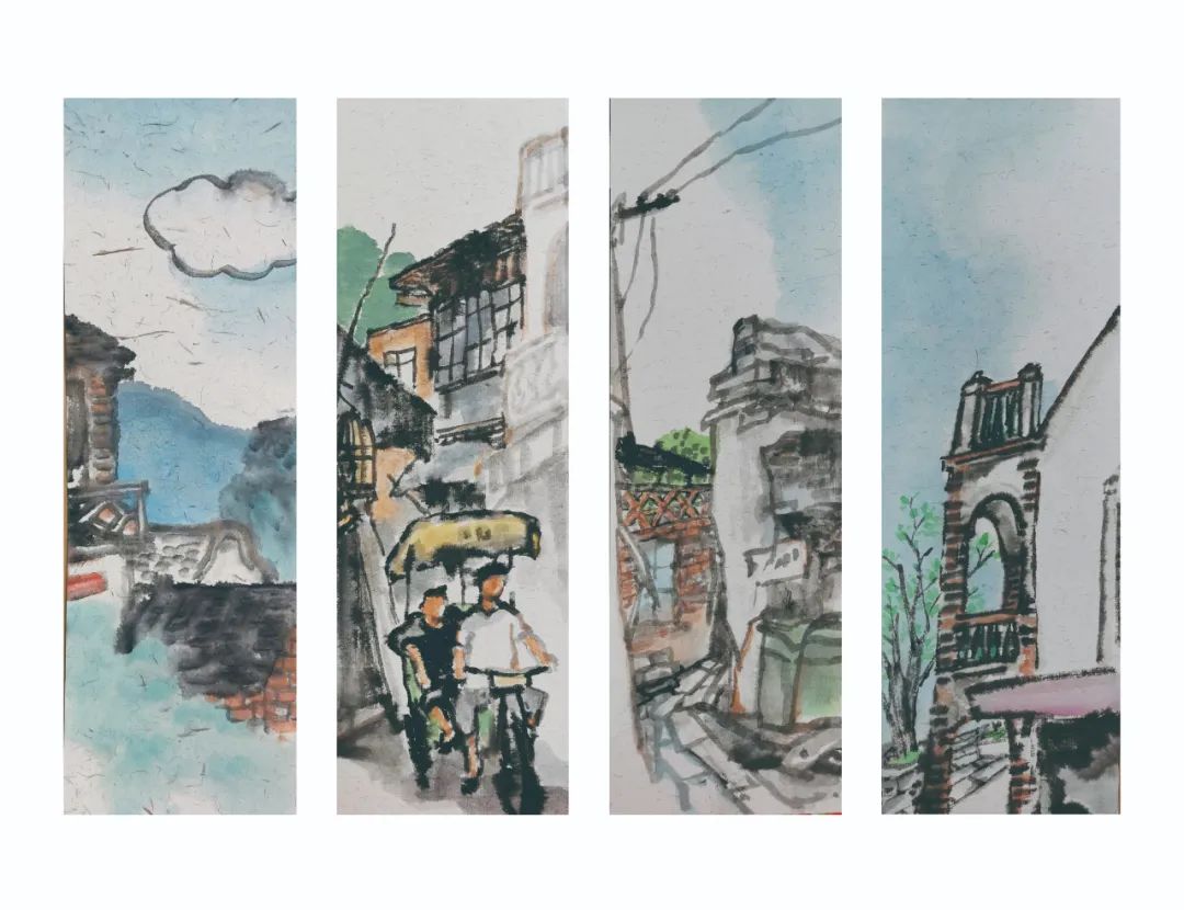 《漳州古城》系列大部分視角是老漳州人日常出行的場(chǎng)景,石板路的街里各式閩南老建筑高低錯(cuò)落。當(dāng)我看到這組古城國(guó)畫(huà)的畫(huà)面,直覺(jué)是一種恬靜,淡然的感覺(jué)躍然紙上。歲月的時(shí)光機(jī),已經(jīng)把當(dāng)年的“柯大俠”沉淀為現(xiàn)在的“柯老師”。經(jīng)歷過(guò)少年調(diào)皮、青年不羈,再到工作三十余年后對(duì)事物觀(guān)察細(xì)致入微的生活歷練,柯老師筆下的古城,畫(huà)風(fēng)鮮活通靈,人物街景栩栩如生。雖然細(xì)節(jié)經(jīng)過(guò)了藝術(shù)處理,不會(huì)讓人一眼看出畫(huà)中的景象細(xì)節(jié),但這樣的畫(huà)面,對(duì)于我這個(gè)外鄉(xiāng)人來(lái)說(shuō),能瞬間感受到閩南小城的歲月靜好,體驗(yàn)到閩南人雖在勞作卻也放松的平衡心態(tài),也就不難理解閩南原鄉(xiāng)人對(duì)家鄉(xiāng)的情懷是:生于茲、長(zhǎng)于茲、念于茲、安于茲。