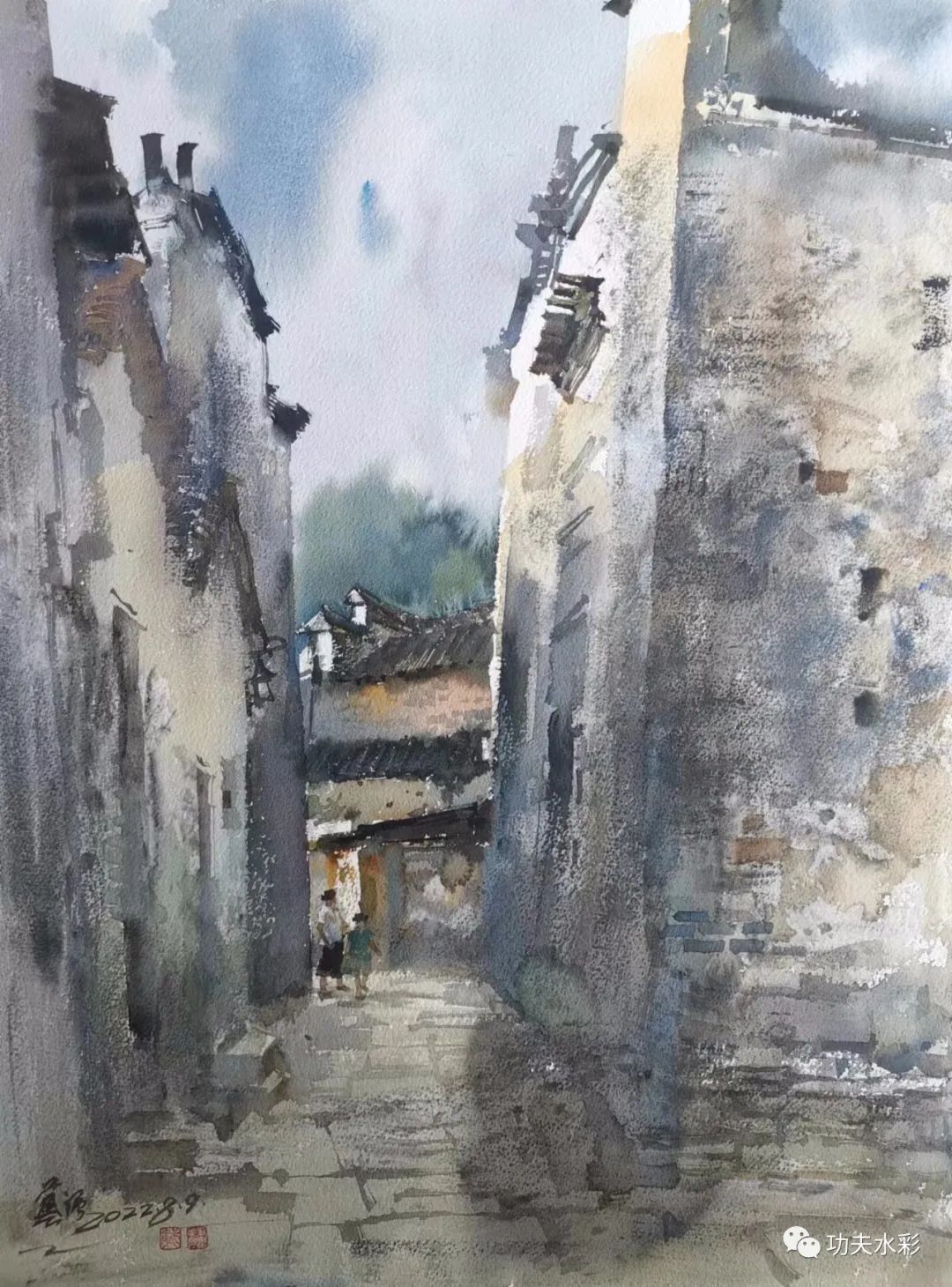 《小巷之遇一一婺源思溪延村故事之七》水彩畫 61x46cm
