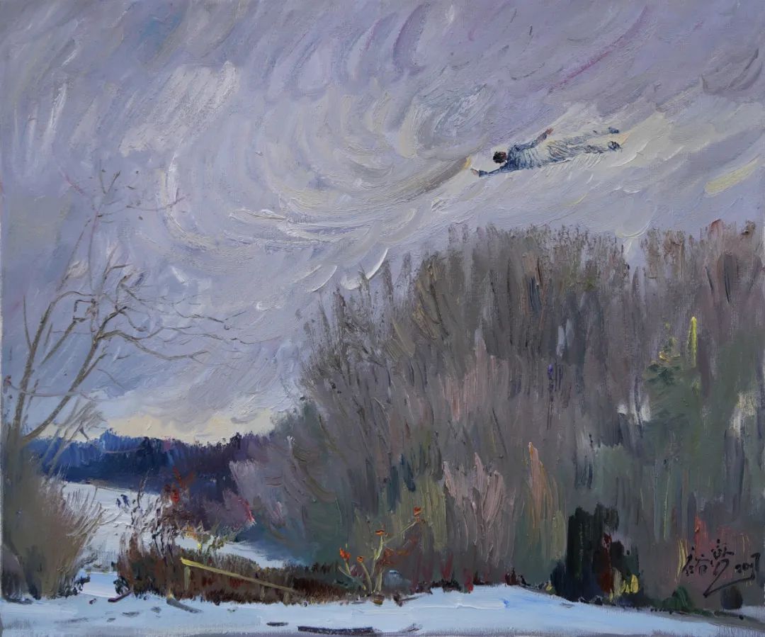 他畫(huà)了一幅《飄》,畫(huà)作中一個(gè)人在雪景上空飛翔。嘗試著用色彩表現(xiàn)異國(guó)風(fēng)情,也將內(nèi)心的迷茫、感動(dòng)等各種情感融入畫(huà)作中,他好像更自由了。