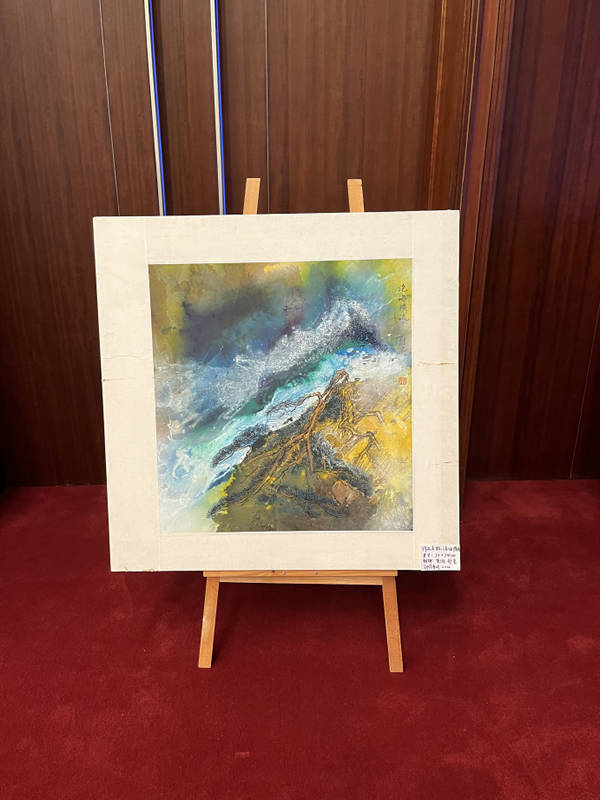 中國對外經貿會計學會副會長,陽光保險集團稅務總監(jiān)宋寧參觀鄭忠作品后與之交流、合影。