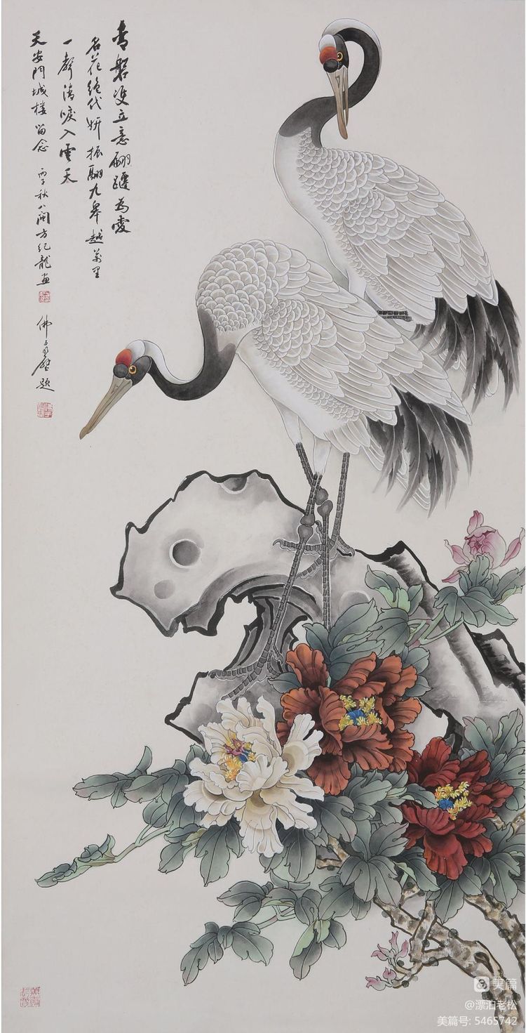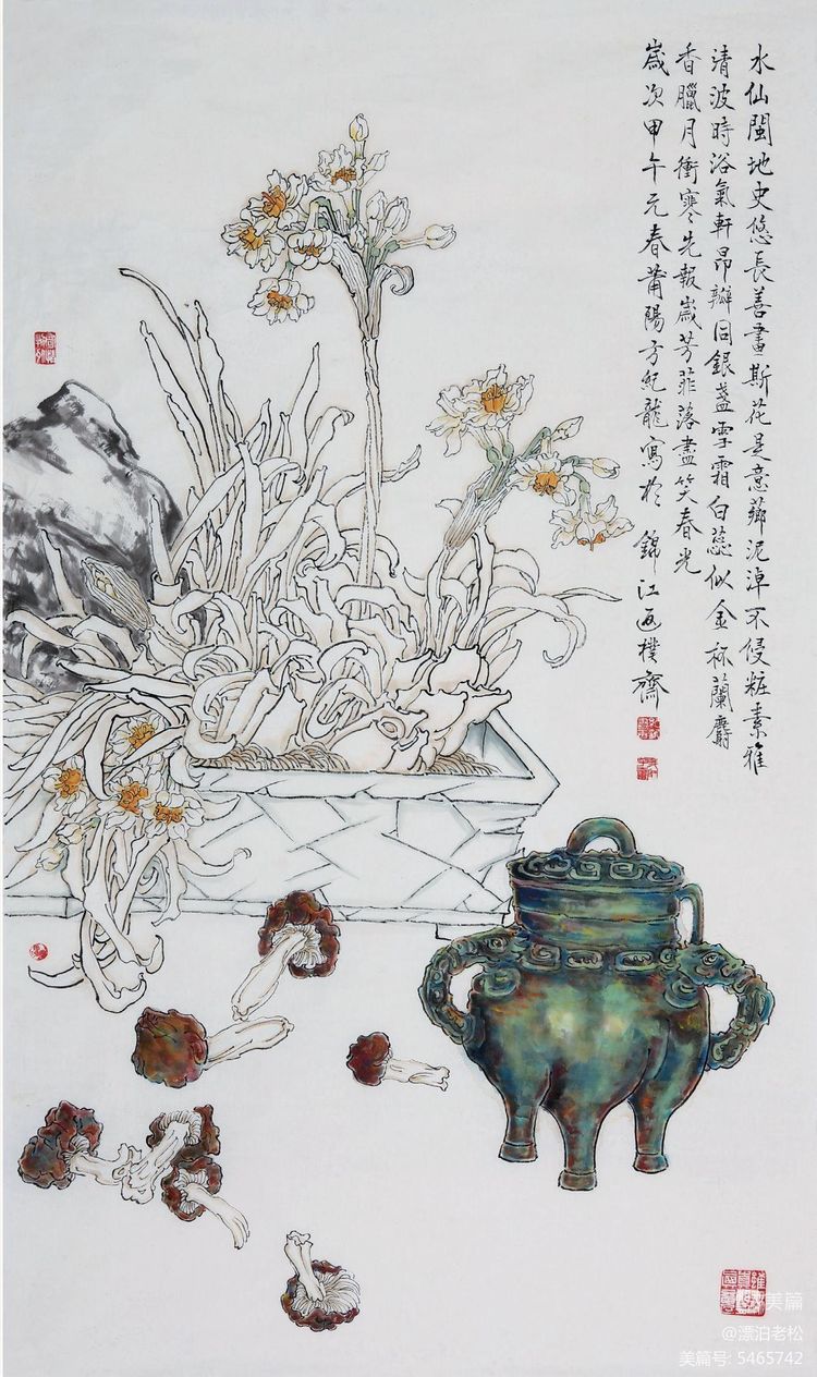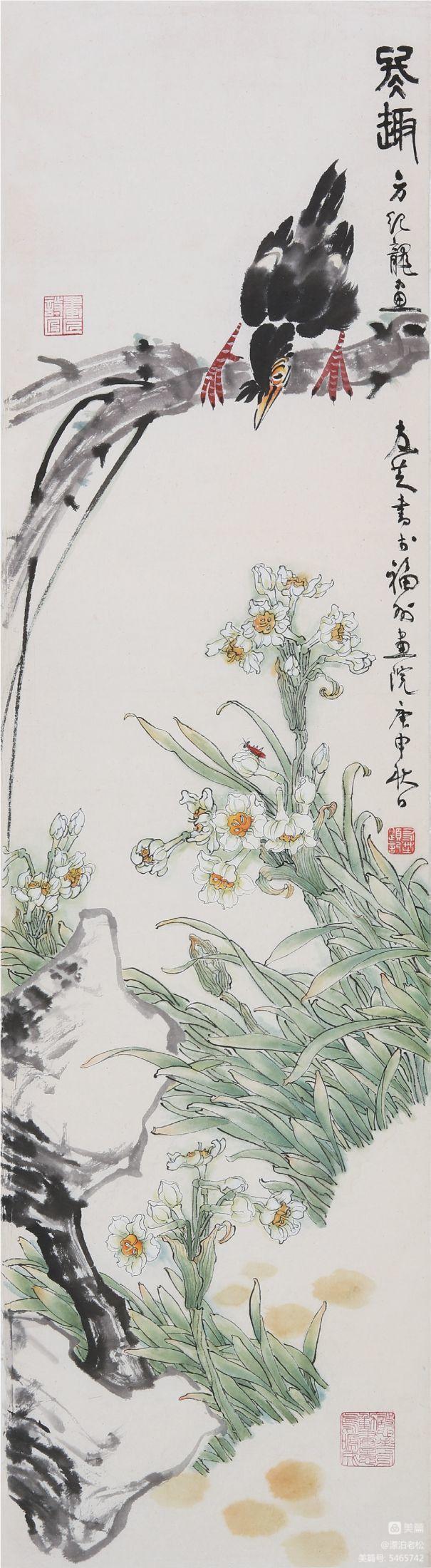 方紀(jì)龍對(duì)藝術(shù)技巧的態(tài)度是比較通達(dá)的,他并未在線描方面劃地為牢,他優(yōu)游于線描、敷彩以至意筆之間。在精嚴(yán)用線的節(jié)律之后,他時(shí)而輕松傳神地以意筆點(diǎn)睛般襯以鳥(niǎo)雀或湖石,別有一番磅礴瀟灑之氣。此時(shí)他并不考慮“純”的問(wèn)題,或許他想的只是完成一件藝術(shù)作品而不是制作白描畫(huà)稿。