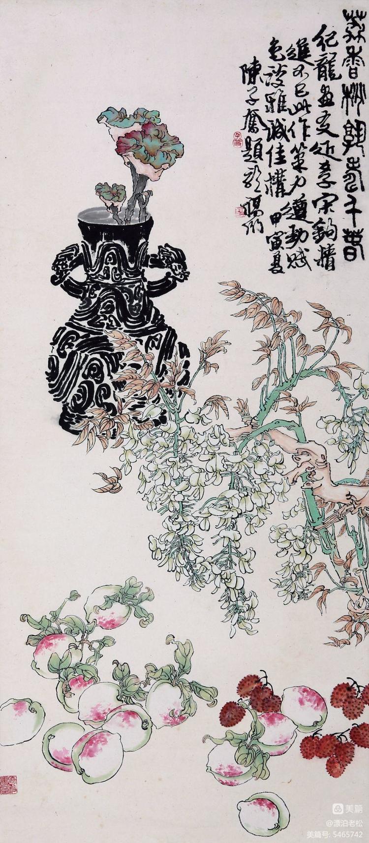 在他的早期作品中,已顯露出在線描方面的才華與追求。1974年作的以鮮桃荔枝為主題的條幅,有陳子奮先生題識(shí):“紀(jì)龍畫(huà)友近學(xué)宋鉤,精進(jìn)不已,此作筆力遒勁,賦色淡雅,誠(chéng)佳構(gòu)。”這確是一件洋溢著勃勃生機(jī)的作品,不但線描精嚴(yán),“筆力遒勁”,而且畫(huà)面結(jié)構(gòu)合理自然,節(jié)奏疏密變化有序,可稱(chēng)功力情韻俱佳。陳子奮先生的題識(shí)中,稱(chēng)賞滿意之情溢于言表。