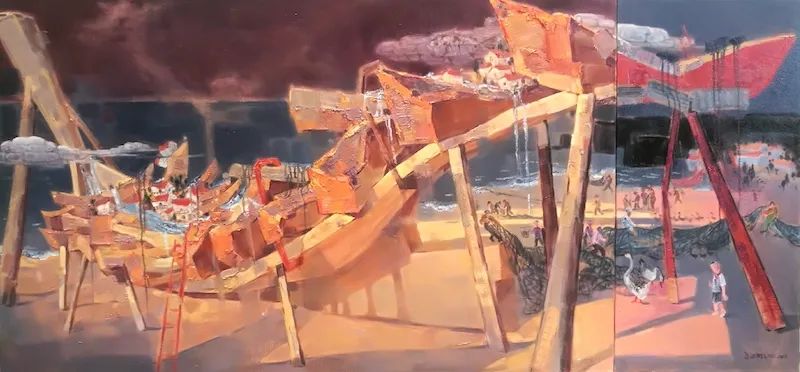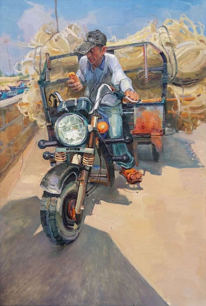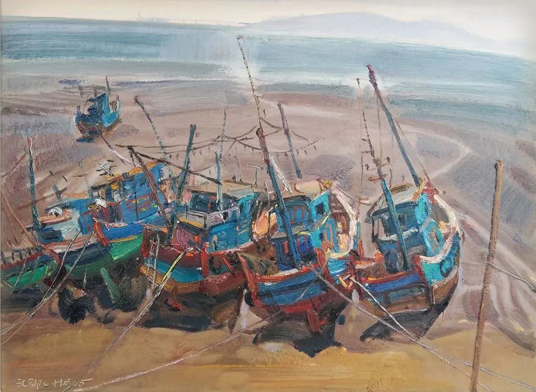 于是漢卿畫海,畫船,畫有關(guān)海的種種景象,更像是一種撓癢癢的方式。"夫畫者從于心者也",畫作就如畫家內(nèi)在生命的感性形態(tài),每幅作品仿佛都是情感癢到極至而玩命撓的一種非常體驗,難言之"癢"必欲言之,于是其筆下就出現(xiàn)了滿口銀牙閃著白光的村里老漁民沖你咧著嘴,慈祥而又憨厚地笑;清晨拂著海風(fēng)的漁家父子攜手豐收海帶,帶著歲月體溫的暖暖畫面;騎著沙灘土三輪車偶爾偷個懶,刷下微信朋友圈的鄰居小伙;永載著海島人祖祖輩輩逐海踏浪之夢的現(xiàn)代鐵管泡沫船與破舊木舟……嗯!海的種種,很具象又賦予夢幻。而作為畫家,他自然而然地把自身生命中內(nèi)在的自發(fā)性意識融入到油畫創(chuàng)作中,似乎成為一種生命的情結(jié)。