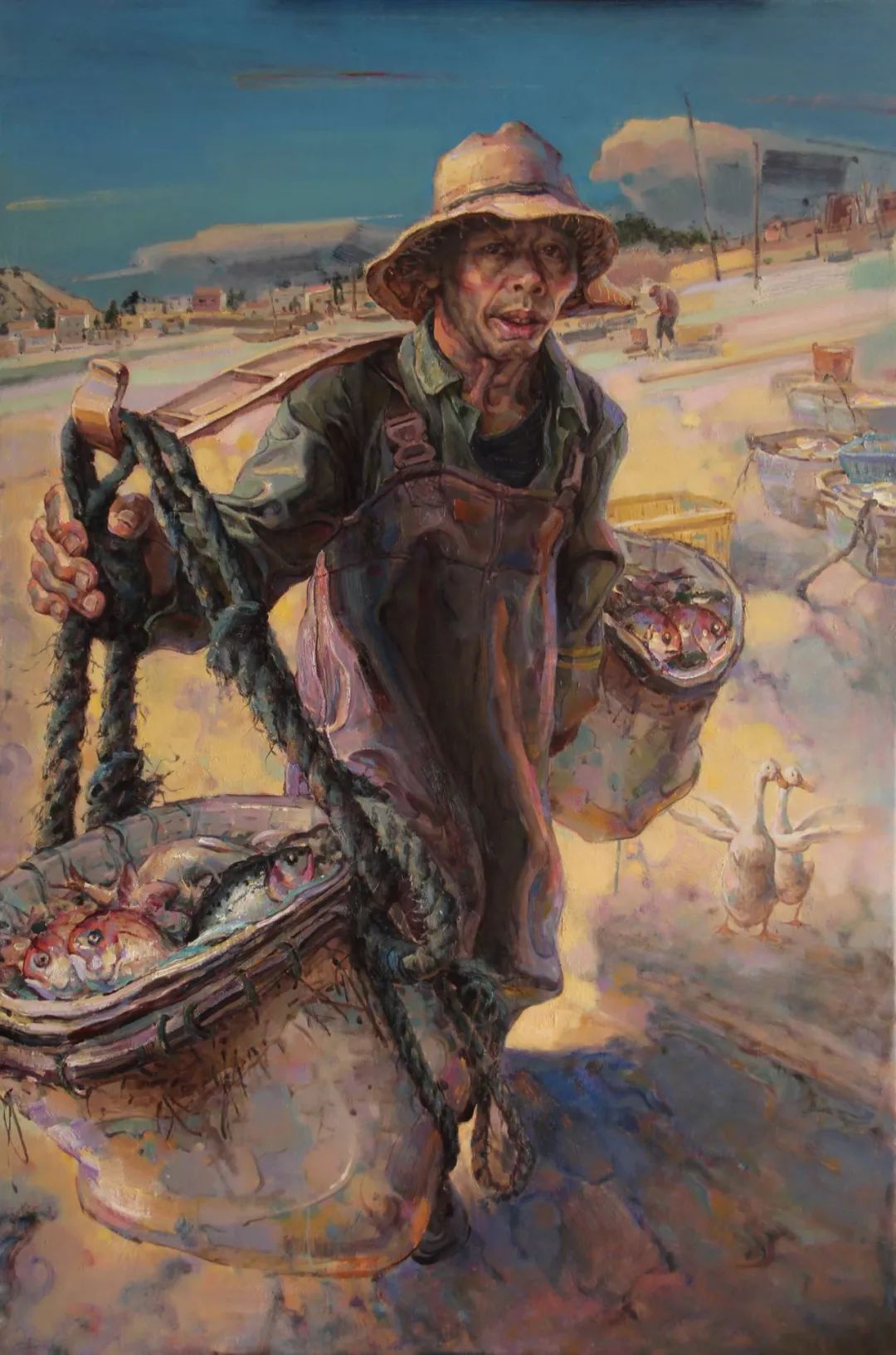 具象也好,意象也罷。"形式內(nèi)涵"自然走向"精神內(nèi)涵",這是一種生命的召喚與升華。"藝術(shù)是一個心靈體驗,一個人有著人格外衣的更高等生命,一個靈魂,在肉眼看不到的情況下,誕生于人的心中。"漢卿的油畫作品在刻畫著一群有著自我追求的新時代漁民,他們在呢喃敘述著生命的種種細節(jié)、感受乃至內(nèi)涵,正如其自己的藝術(shù)歷程。繪畫作品終究是畫家內(nèi)在精神探索的圖像式解讀,它總需有感而發(fā)的。傳統(tǒng)也好,當代也罷,終歸在思維上是需要切入對生活與藝術(shù)融合的電源。漢卿對海的關(guān)注實際上不僅是血脈天性,更是他多年來細膩地思索著時代及生命變遷的一種反映……