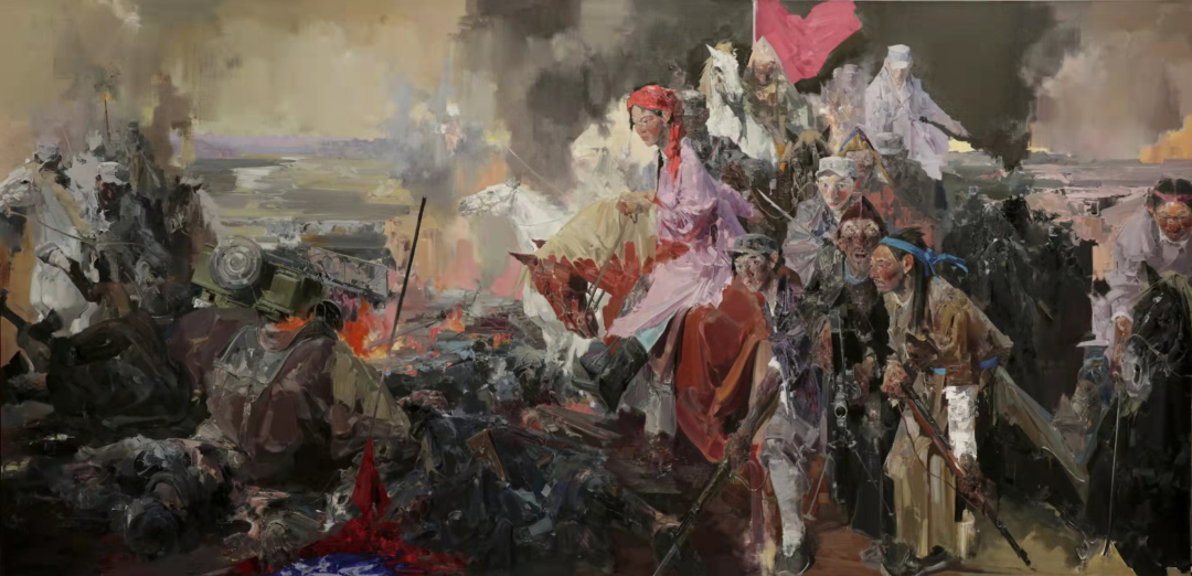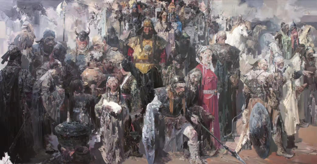 張延昭的畫(huà)個(gè)性語(yǔ)言鮮明,他的創(chuàng)作風(fēng)格寫(xiě)意,用筆隨心所欲,但又不失其章法,在他的隨意、性情化的用筆中,有著意象的特征。他作畫(huà)時(shí)喜歡即興、隨性,甚至將錯(cuò)就錯(cuò),這種敏銳度與他的秉性和天賦密切相關(guān),也展露了藝術(shù)家的個(gè)性。在表達(dá)宏達(dá)場(chǎng)面、多人物的歷史場(chǎng)景創(chuàng)作上,他也有自己的特征,展現(xiàn)了對(duì)畫(huà)面全局的把控能力和獨(dú)到見(jiàn)解。張延昭也是一位極具創(chuàng)作能力的藝術(shù)家,他的繪畫(huà)很瀟灑、恣意,呈現(xiàn)一種井噴的姿態(tài),他的畫(huà)面很有視覺(jué)感,刀、筆、線運(yùn)用自如、率性而為,但整個(gè)畫(huà)面有內(nèi)在的理性支撐,造型依舊在,仍屬于具象的范疇。