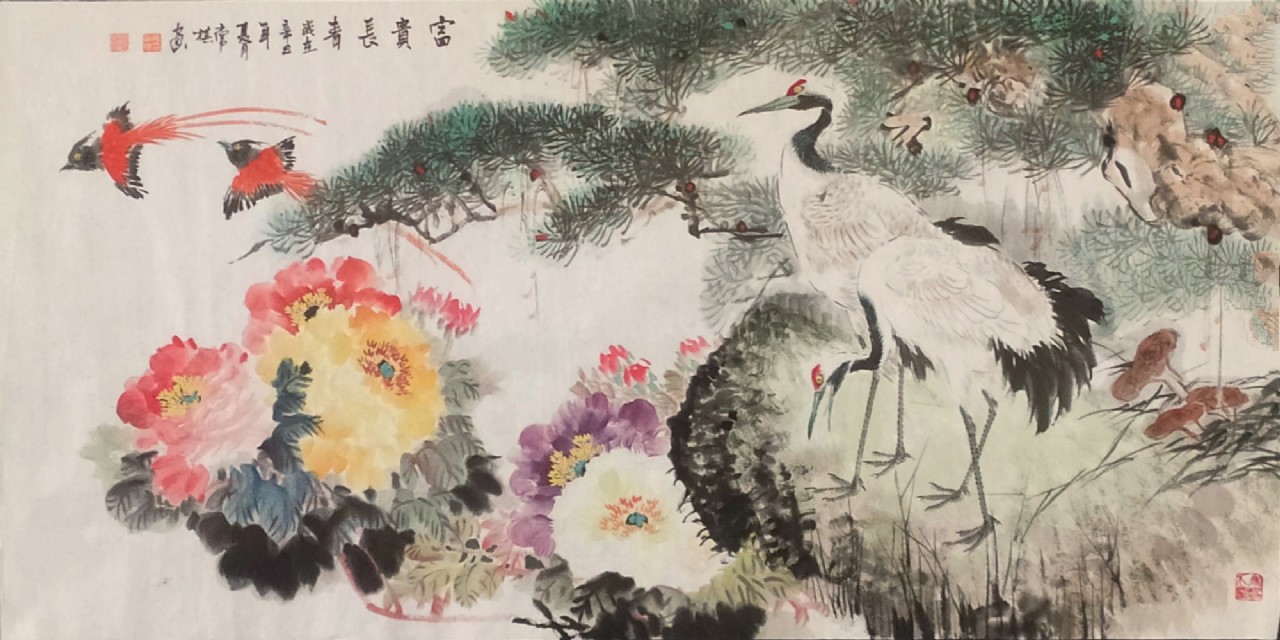 陳庚《雙鶴益壽》68cmx138cm