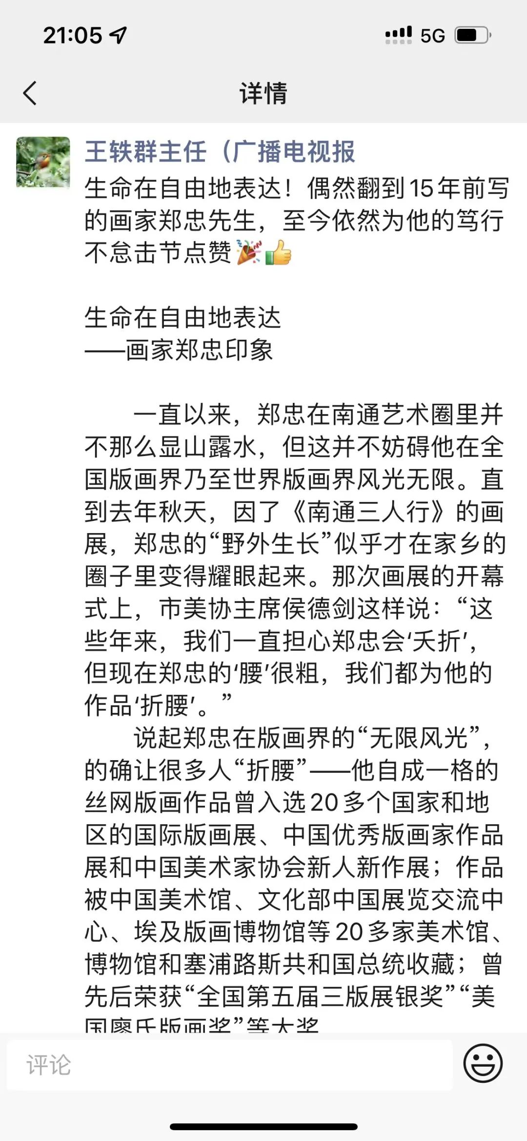 下午在523園區(qū)畫室收到學(xué)弟南通廣電傳媒集團(tuán)融創(chuàng)策劃中心主任王義群發(fā)來(lái)的圖片,是十五年前他寫我的文章,閱后面壁,情不能已!在行者鄭忠的背后多少雙期待的眼光?半輩子人生是江東父老兄弟姐妹們的默默支持、付出才有我這回眸一笑的一點(diǎn)點(diǎn)欣慰。