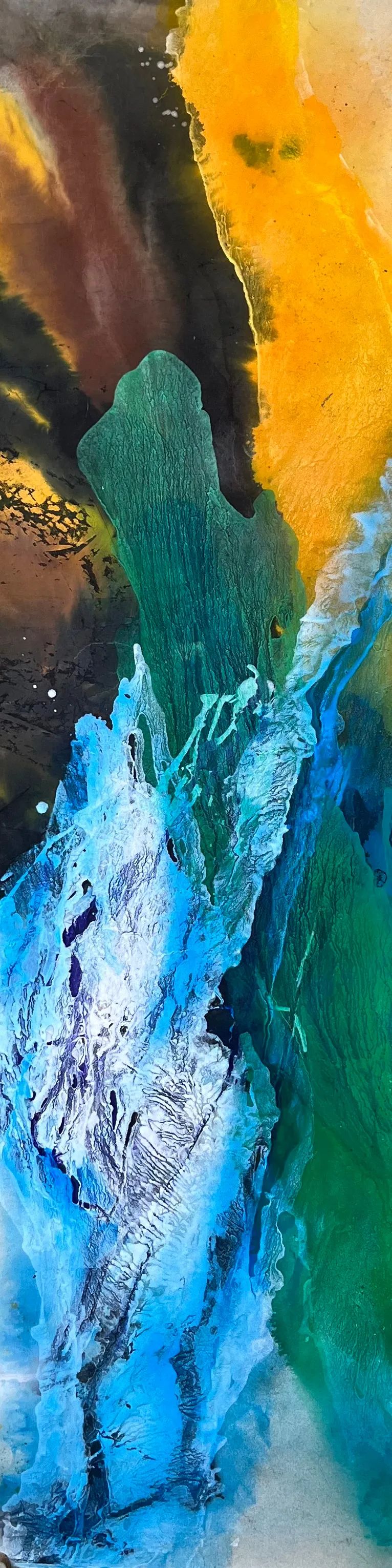 特別是“正是二十多年不帶功利目的的自由表達(dá)……”這段話讓我感慨系之,我仿佛一直生活在自己的夢(mèng)境里,為那西西弗西的神話而日夜兼程,在我“邂逅”抽象水墨(包括山水畫)之前就有了業(yè)內(nèi)人士感到的“不可思議”,這是獨(dú)特藝術(shù)歷程的生命體驗(yàn)與觸摸,是非同凡響的人生“沉淀”,他見證了“抽象水墨畫家鄭忠”之前的“版畫家鄭忠”,而版畫家之前的鄭忠又脫胎于“工程師”“發(fā)明家”“設(shè)計(jì)師”鄭忠,但此時(shí)的鄭忠藝術(shù)受“潛水員鄭忠”的渲染是默默地,間接的,到了抽象水墨畫家之后,二、三十年前受天風(fēng)海水的熏陶與海洋深處的洗禮而直接彰顯出藝術(shù)家鄭忠經(jīng)歷坎坷、波瀾壯闊、洶涌澎湃的生命底色。他當(dāng)時(shí)把握的相當(dāng)準(zhǔn)確!