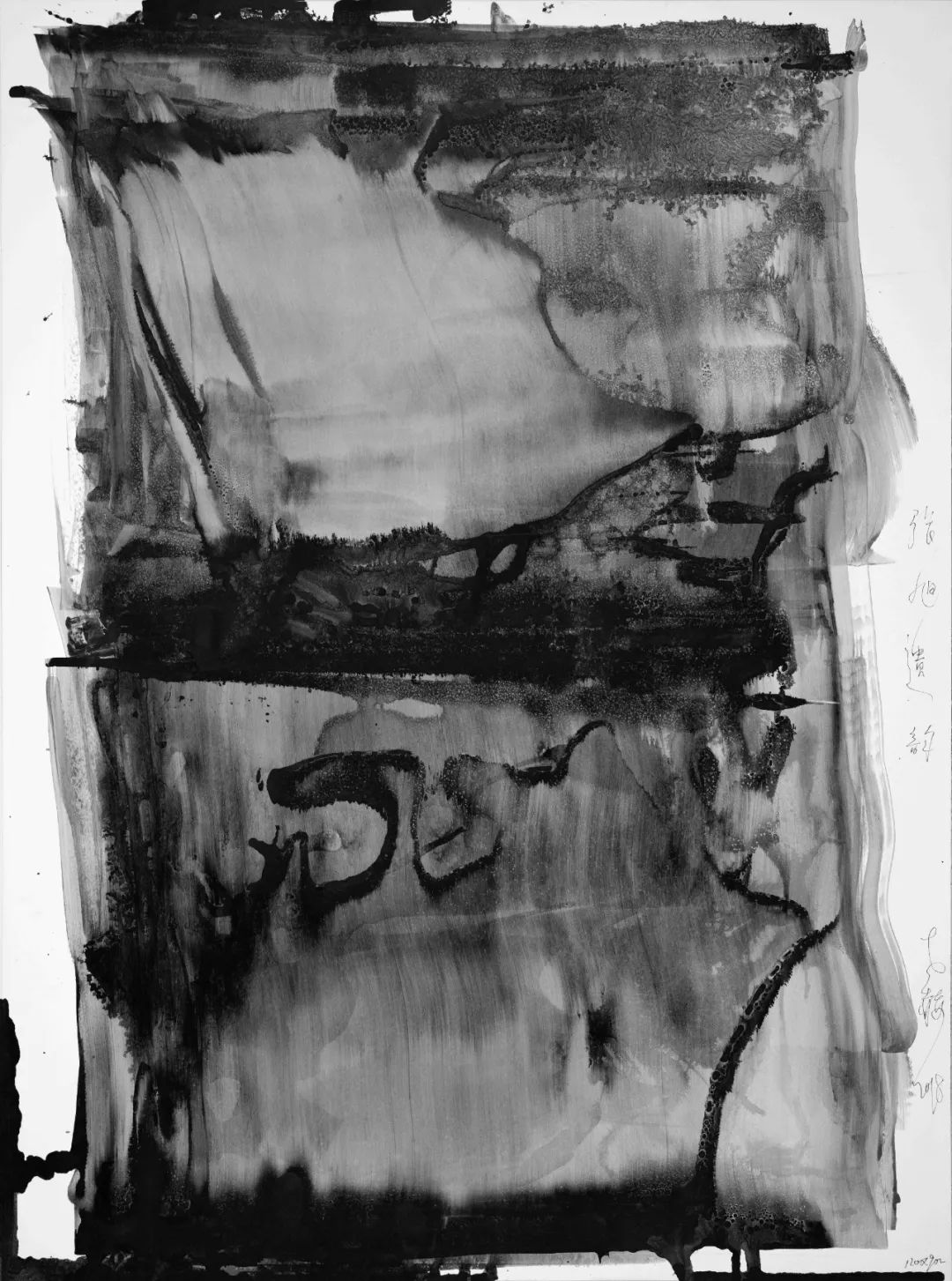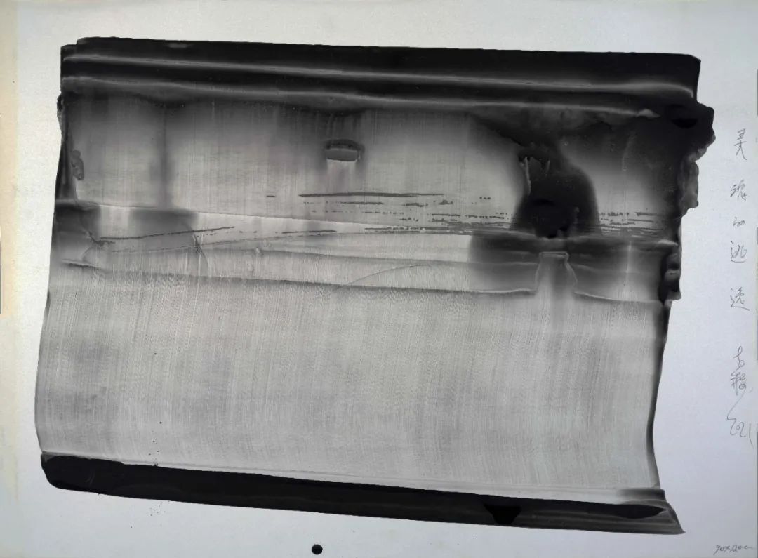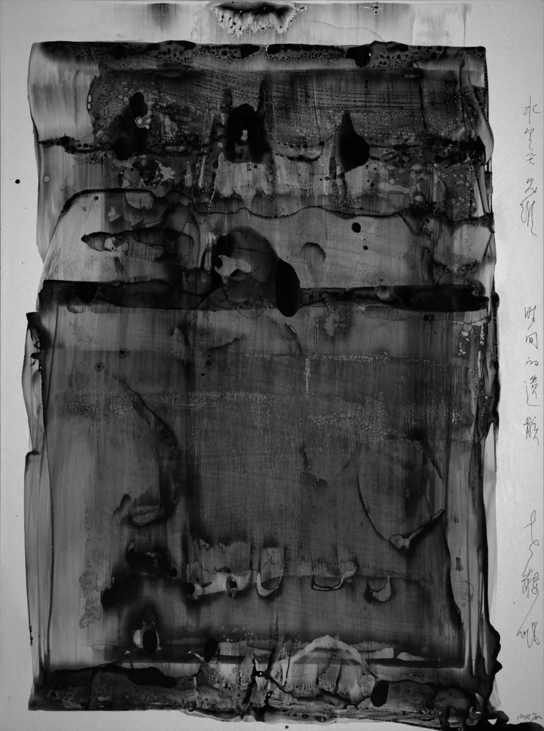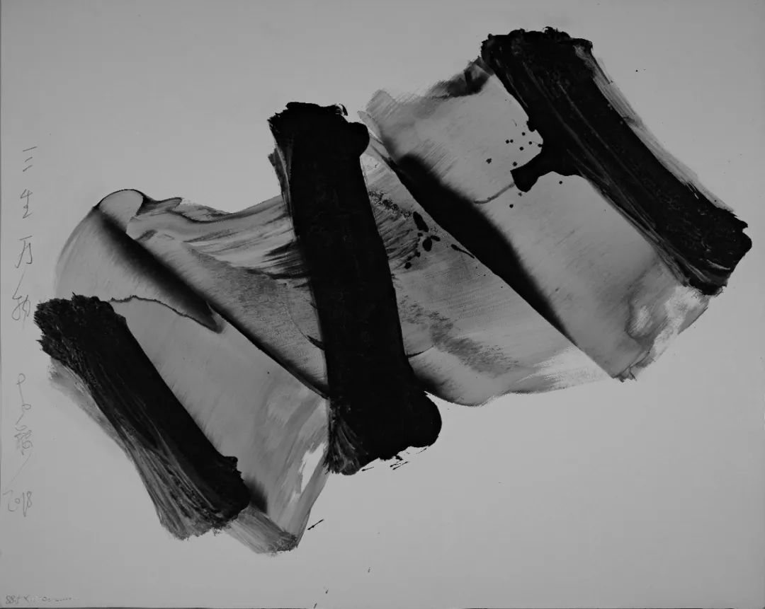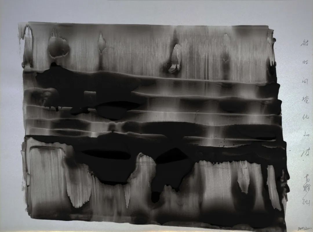 我用“筆”用“墨”形成的特殊肌理好似經(jīng)過時(shí)間、經(jīng)過風(fēng)雨,而留下的歷史 DNA,它們是時(shí)間的遺骸和生命的化石,它們被嚴(yán)酷的自然環(huán)境抽打、擠壓、碰撞、蹂躪。它們隱忍,但并非是僵死的,它們默默地和時(shí)間做經(jīng)久不息的對壘和死磕,那些斑痕、那些特殊肌理是它們面對獨(dú)特觀眾的言說與炫耀。那些特殊的肌理和結(jié)構(gòu)展現(xiàn)了不一樣的生命與時(shí)間,是對生命節(jié)點(diǎn)的呈現(xiàn)和剖視。人是宇宙的細(xì)胞,宇宙因?yàn)槿说拇嬖诓奴@得了它存在的意義,我用一種特殊的方式和時(shí)間對話,用一種特殊的方式與生命聊天。