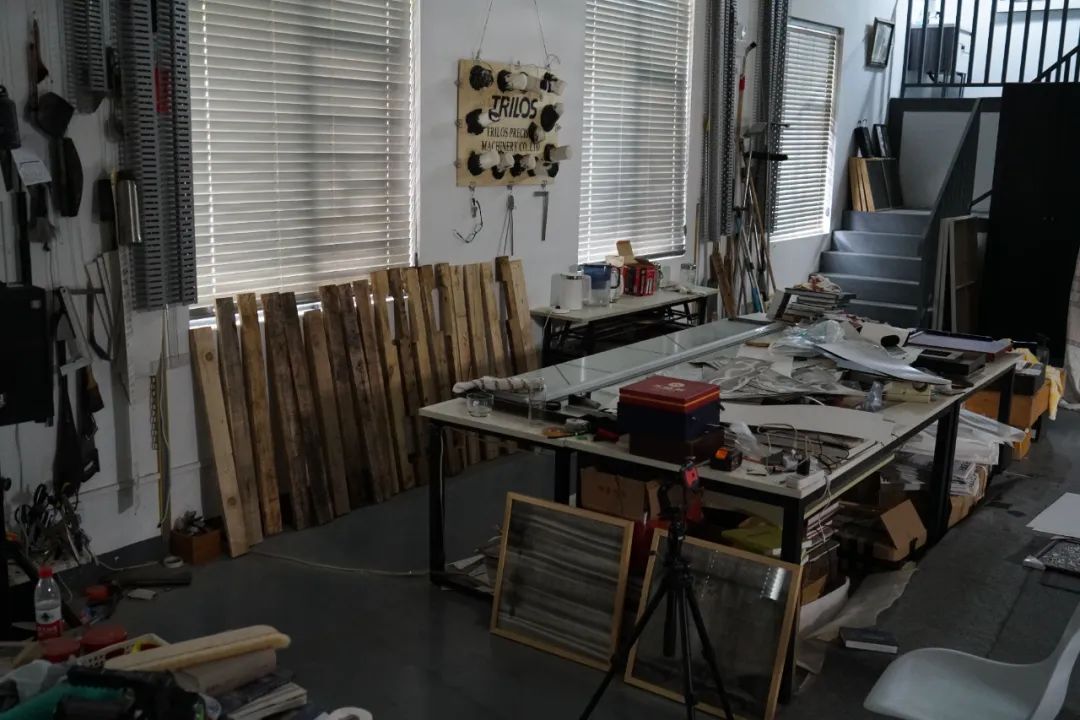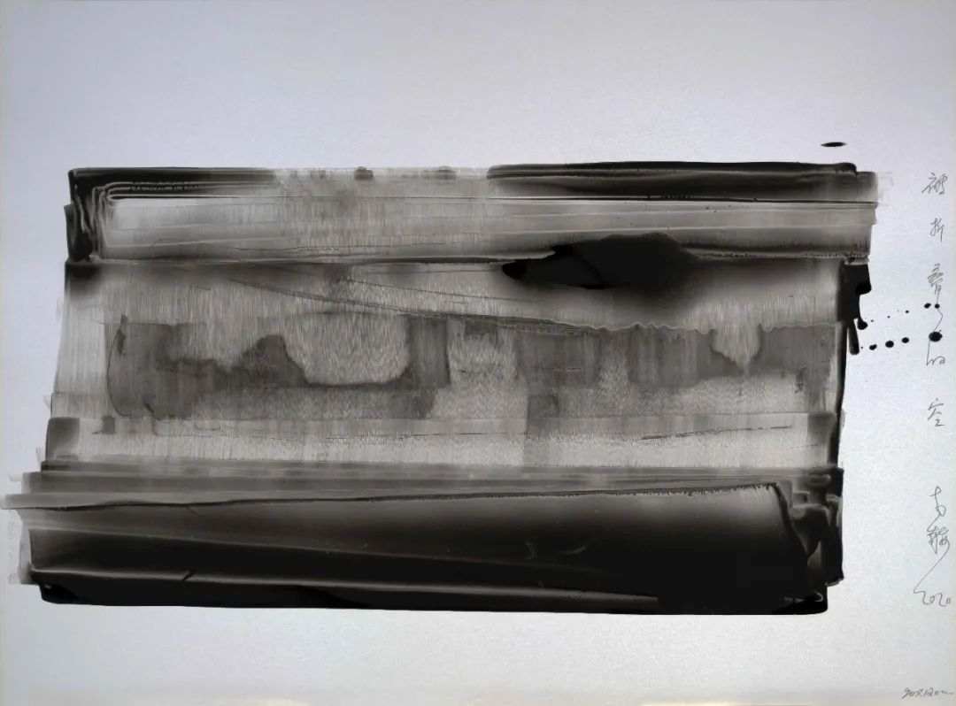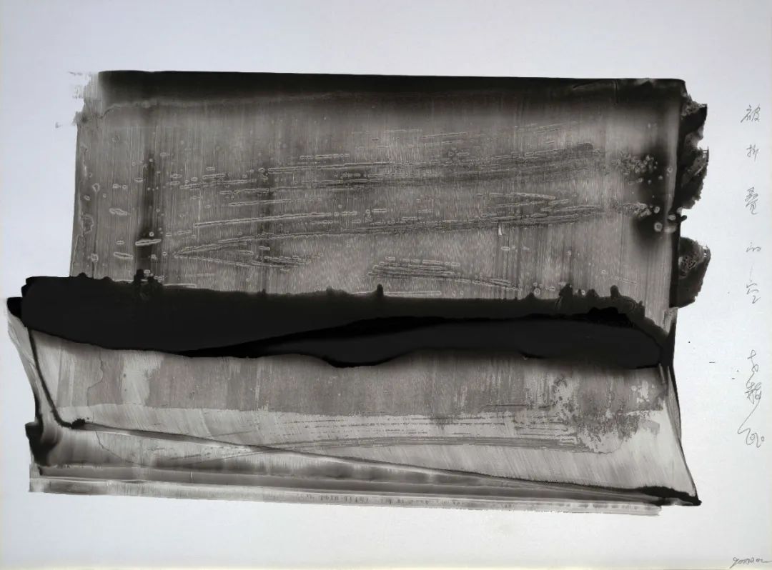 這些最新的作品,老赫用他研究多年的特殊工具,將墨色顏料在硬紙板上構(gòu)圖、涂抹,形成了一幅幅獨(dú)特的抽象作品,有的像是玻璃幕墻,又有的像是滿載歷史的紙張,還有的像雨中馬踏后濺起的水花。