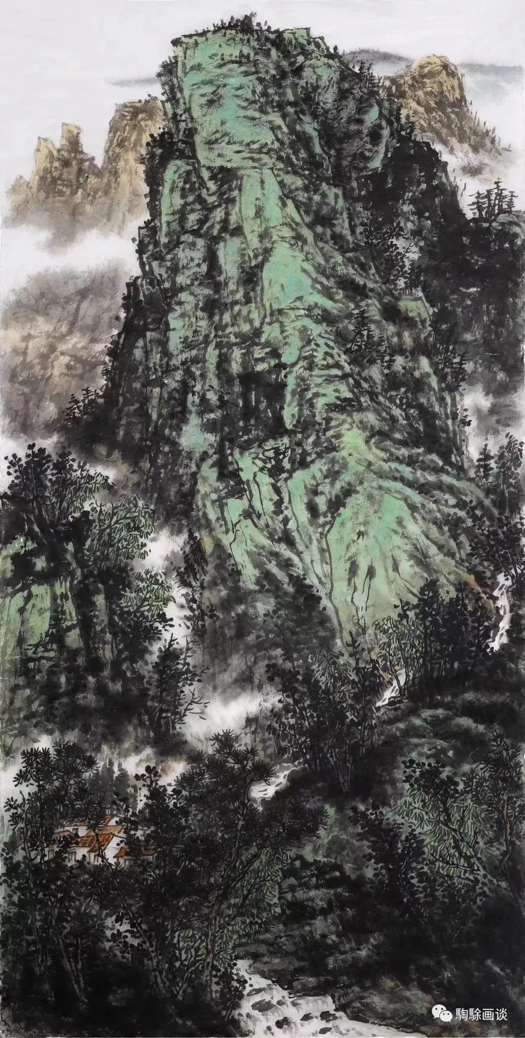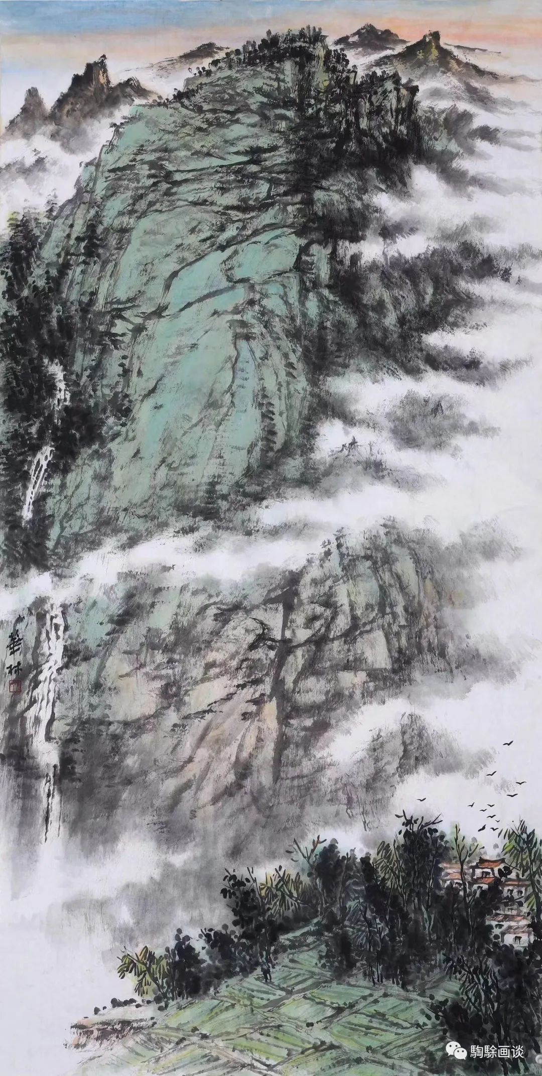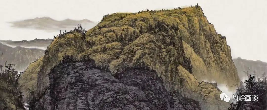 《原野沐秋陽(yáng)》以關(guān)中秋色為題,在山石交錯(cuò)間,縱橫的溝壑、小徑、飛流、云氣為畫面搭建了整體布局關(guān)系。以近、中、遠(yuǎn)的視點(diǎn)跨越溝壑,飛過(guò)叢林并遙望至遠(yuǎn)方的村落和水霧籠罩中的山野景觀。獨(dú)特的觀察視角讓人感受到山川無(wú)盡、柳暗花明的文學(xué)氣氛。畫面中的山石、樹木勾寫有力,點(diǎn)與線的變化豐富,而云氣與遠(yuǎn)景的塑造則采用較為淡雅的筆調(diào),以逆光視角將光影的直射、反射效果同交疊的山石緊密結(jié)合,展現(xiàn)出強(qiáng)烈的自然生機(jī)與恢弘的時(shí)代發(fā)展圖景。這種對(duì)時(shí)代內(nèi)涵的闡釋在《雨過(guò)山鄉(xiāng)》《云涌家山》等畫作中皆有體現(xiàn)?!队赀^(guò)山鄉(xiāng)》以奇險(xiǎn)的構(gòu)圖將左側(cè)高聳的山峰與右側(cè)錯(cuò)落的梯田進(jìn)行布局組合,圍合中的村落、梯田為雄奇的自然山川融入一絲人間煙火,可游、可居的藝術(shù)情境令人心向往之。近景的山峰以冷色調(diào)渲染,遠(yuǎn)山則適度調(diào)和暖色調(diào),以此強(qiáng)調(diào)光影于群山峻嶺中的層次變化,豐富了畫面的視覺感受。與此同時(shí),山形的彼此擠壓展現(xiàn)了畫家的構(gòu)成意識(shí),平面疊加及彼此交錯(cuò)關(guān)系形成了幾何張力。飛瀑、云氣及右下角的水流均以錯(cuò)落和彎折變化呼應(yīng)整體氣勢(shì),畫面的布白則增加了場(chǎng)景的呼吸與通透感,山明水凈、草木豐茂。《云涌家山》采用俯視的視角,將云霧、山峰及下方的村落進(jìn)行縱向空間疊加,形成大廣角構(gòu)圖。在縱、橫向的視點(diǎn)交織中展現(xiàn)了云??~緲、青山疊翠的開闊氣象。遠(yuǎn)方的一絲曙光與飛瀉而下的瀑布、下方的田野人家、飛行的群鳥皆共同譜寫了生命的贊歌?!犊丈降未洹返闹鞣宄髠?cè)彎折,造成畫面的“奇”“險(xiǎn)”之勢(shì)。左側(cè)的霧氣穿過(guò)山峰與右側(cè)的水流呼應(yīng),繞過(guò)屋舍而朝左下角沖出畫外,為豐茂的山川、叢樹增添了靈氣,山川渾厚,草木華滋。畫家以濃重的墨、色率意皴染,追求表現(xiàn)雨后山野的鮮活景致,觀者似乎感受到水流潺潺與云氣飛淌的縹緲之感。