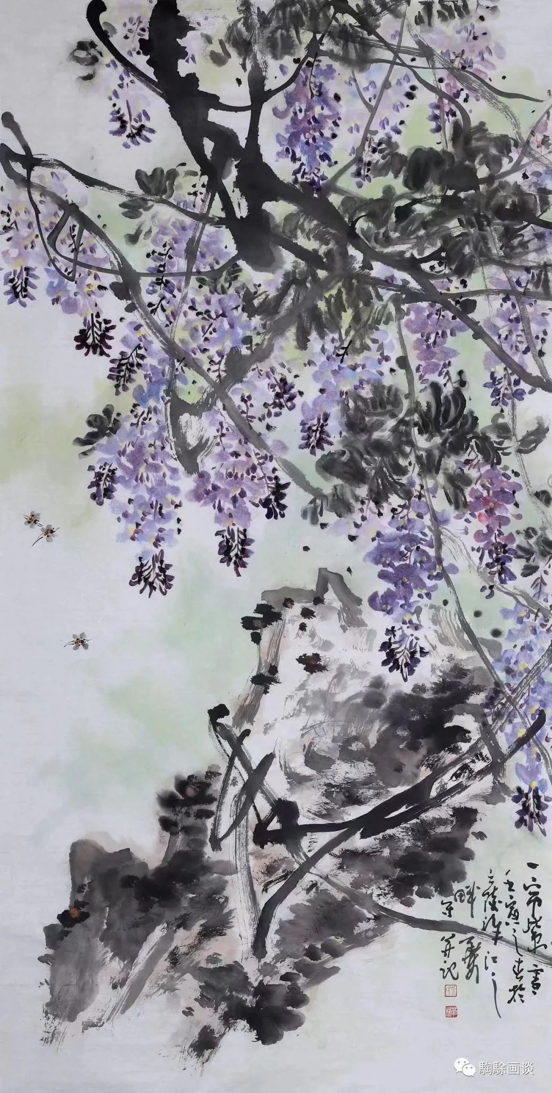 除受師承影響之外,吳華林的花鳥畫藝術(shù)亦借鑒了閩派名家沈耀初、林金定等人的風(fēng)格因素。與此同時(shí),其廣泛關(guān)注近現(xiàn)代花鳥畫名家諸如吳昌碩、齊白石等人的藝術(shù)格趣,逐漸形成了鮮活、率意、清潤(rùn)的藝術(shù)語(yǔ)言?!兑缓熥涎访枥L了春意盎然的自然情境,繁盛的紫藤花由下至上蜿蜒生長(zhǎng),其繞石而上的氣勢(shì)展現(xiàn)了豐富的筆墨趣味,與蒼潤(rùn)的青石形成呼應(yīng)關(guān)系,增強(qiáng)了墨線與色塊間的節(jié)奏張力。藤條伸出畫外之后再由上方垂下,此間的神采正掩映于盛放的花團(tuán)與忙碌的群蜂之中。遠(yuǎn)景渲染的淺綠色調(diào)既豐富了色彩關(guān)系,又活躍了畫面氣氛,令人似乎嗅到了陣陣花香并感受到蜜蜂飛舞間的歡鬧情形。《墨花也風(fēng)流》則以純墨色展現(xiàn)出紫藤花的人文氣質(zhì),畫作筆意粗獷,雖然形態(tài)塑造較為簡(jiǎn)練,但在構(gòu)圖與筆墨經(jīng)營(yíng)上卻十分考究,追求揮寫過(guò)程的節(jié)奏與氣韻。紫藤枝條穿插間的墨色濃淡及干濕變化十分豐富,溫潤(rùn)的色調(diào)輔以點(diǎn)寫花、葉間的靈動(dòng)筆意,將枝、葉、花的生長(zhǎng)狀態(tài)與風(fēng)舞瞬間的運(yùn)動(dòng)變化盡皆呈現(xiàn)。書法跋文亦呼應(yīng)圖像的形態(tài)設(shè)計(jì),后點(diǎn)染的黃色花蕊更增添了紫藤的生命氣質(zhì)。