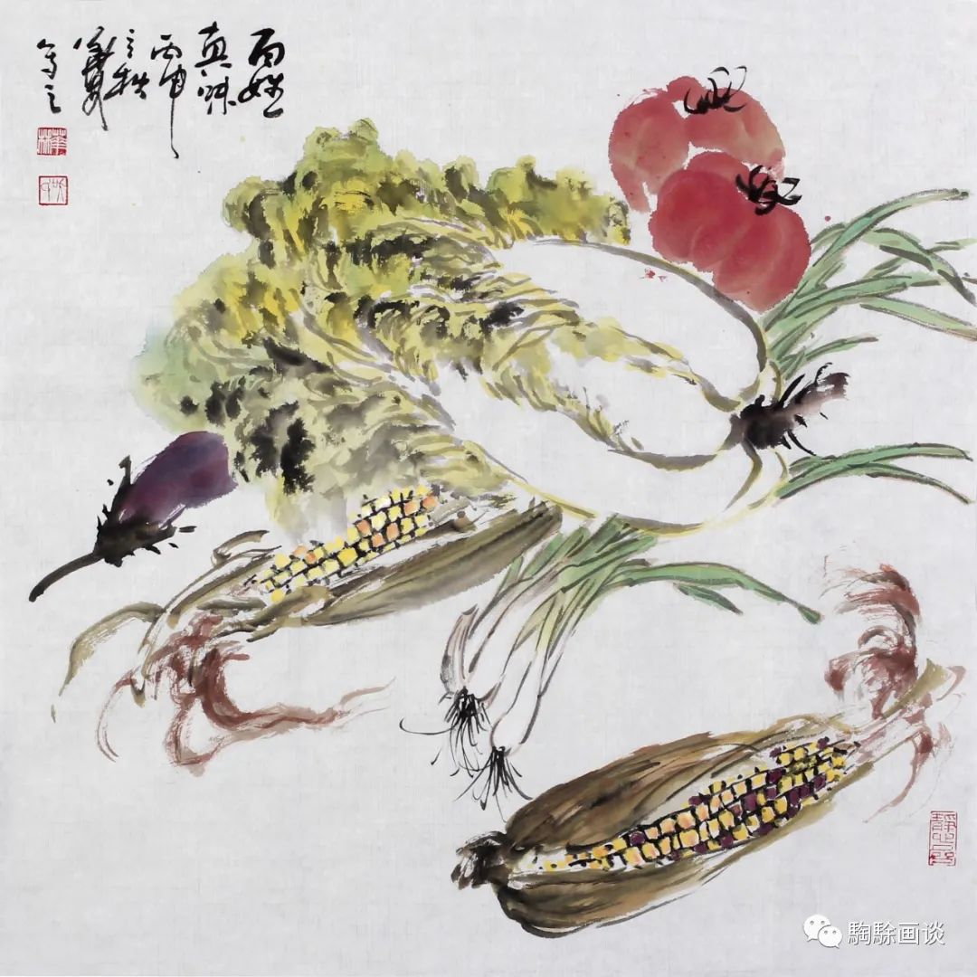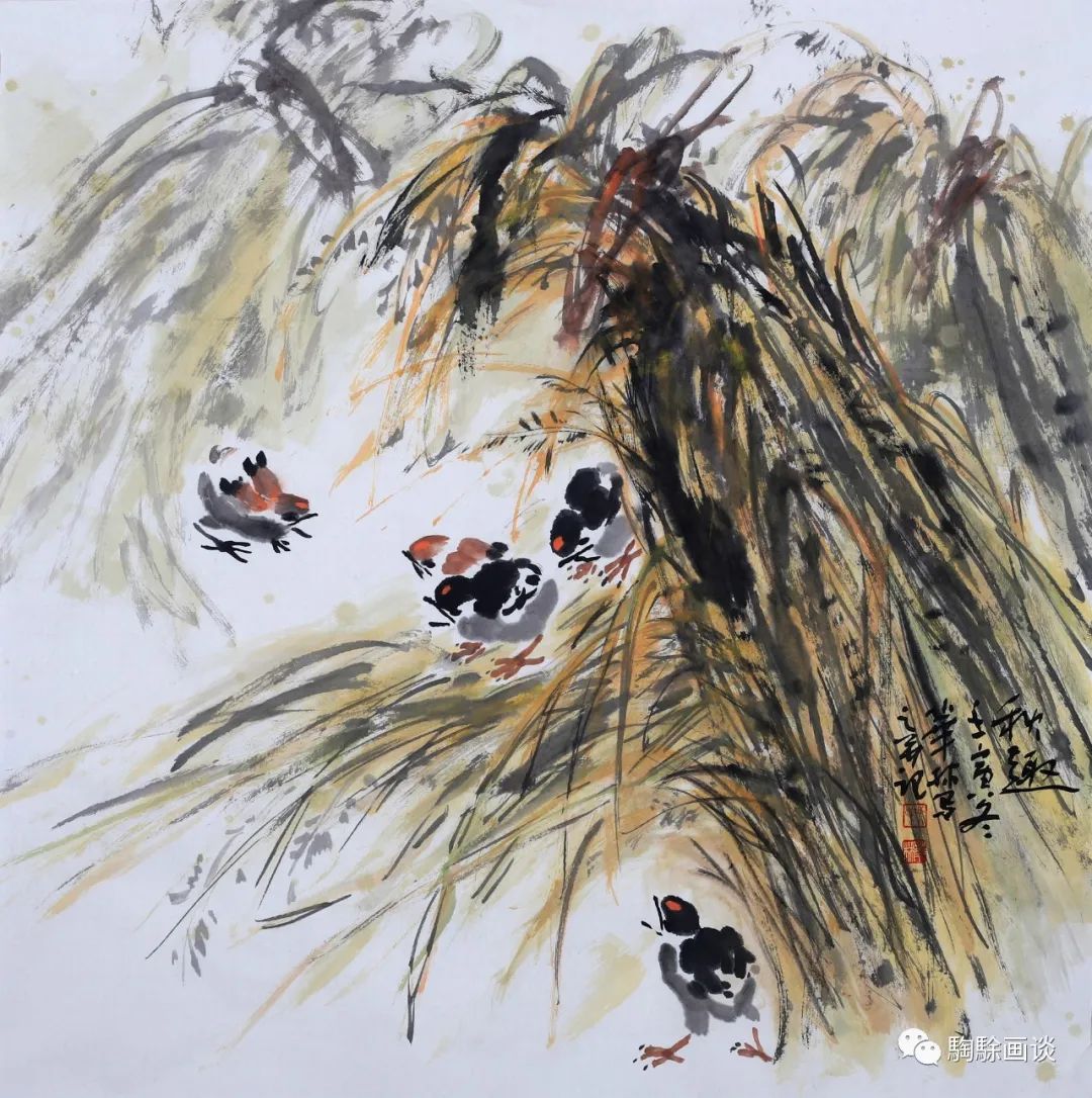 吳華林創(chuàng)作的《秋趣》《蔬果圖》等作品皆以生活中常見事物入畫,這既是題材的拓展,又是筆墨語(yǔ)言的周延。嬉戲稻捆間的小雞與菜市場(chǎng)所見是生活圖景,亦是歲月輪轉(zhuǎn)中的鄉(xiāng)土印象。他的荷花別有意趣,表現(xiàn)手法多樣,其所塑造的情境,既不是寒塘鶴影,也不是孤高冷逸,而是描繪荷塘恣意生長(zhǎng)中的生機(jī)與煙靄繚繞間的繁華。畫家在傳統(tǒng)刻畫手法的基礎(chǔ)上,充分發(fā)揮暈染與疊加相結(jié)合的方式,墨、色、水的彼此交融、共生,以古拙的筆意譜寫出荷塘的秋日序曲?!肚锾吝^(guò)雨》以拉伸變形的方式述說(shuō)著一池秋荷的生命神采,大筆觸橫斜直下,狂風(fēng)暴雨過(guò)后的水潤(rùn)墨色沖撞、交疊,水痕與墨韻精彩呈現(xiàn),彼此延展、避讓中的形態(tài)構(gòu)成別有意趣。枯筆寫出的荷梗與俏皮活潑的蓮蓬則成了戲中主角,奇崛的身形訴說(shuō)著既往的傳奇與當(dāng)下的灑脫。