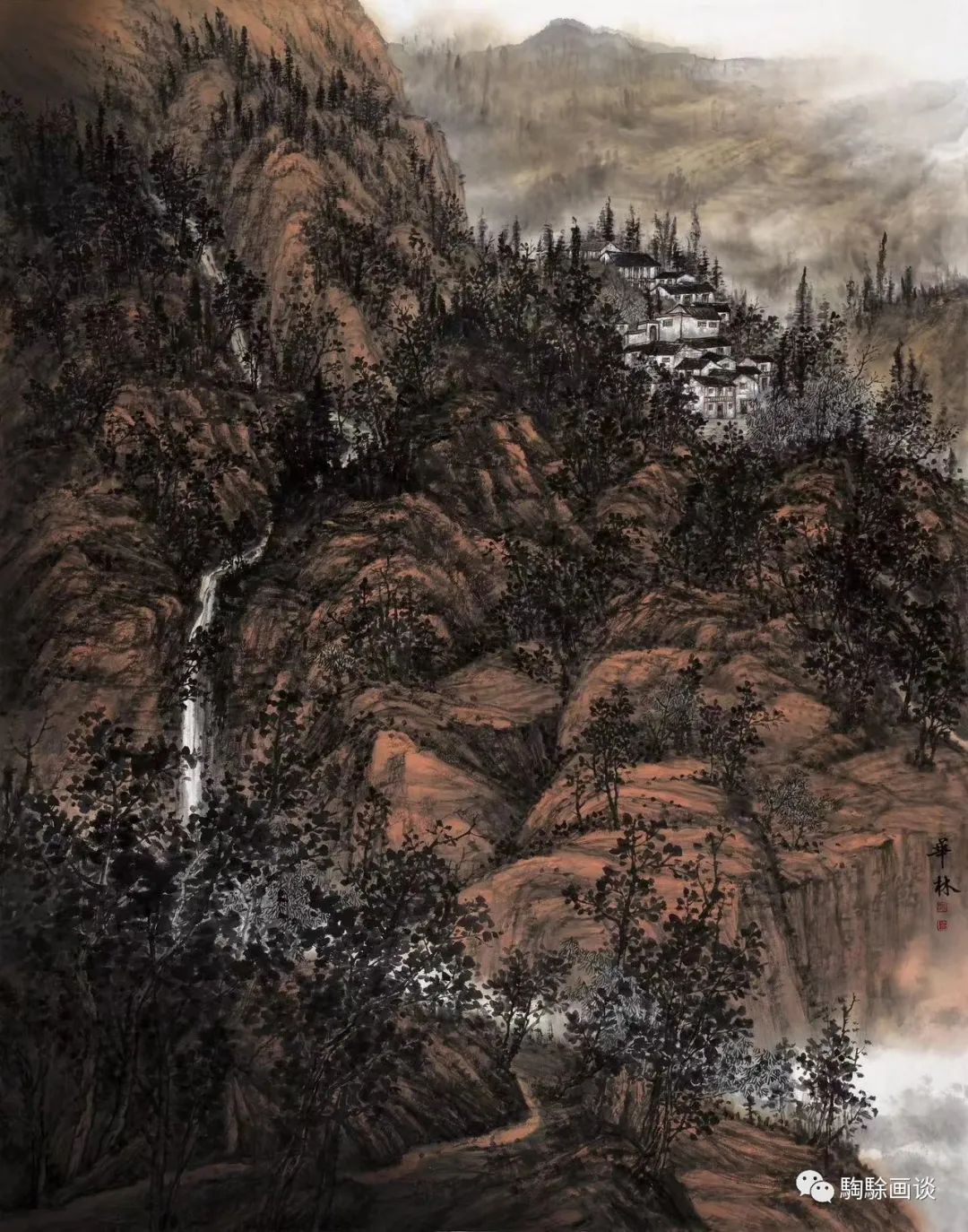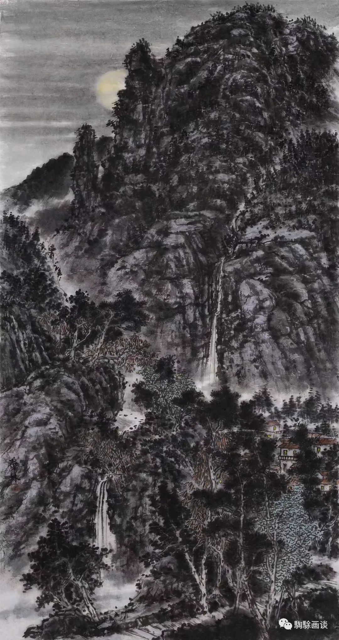 近年來(lái),吳華林亦開始關(guān)注山水畫的主題創(chuàng)作,并嘗試將山水與花鳥題材進(jìn)行立意布局,以拓展彼此的風(fēng)格及內(nèi)容表達(dá)。他在游歷與學(xué)習(xí)的過(guò)程中,尤其關(guān)注北派山水的現(xiàn)代轉(zhuǎn)型問(wèn)題,如對(duì)“巨碑式”山水風(fēng)格的研習(xí),以范寬、李唐、郭熙等古人的立意布局及皴染技法為范本,細(xì)致摹寫品讀。與此同時(shí),他對(duì)現(xiàn)代山水畫家李可染、黎雄才、賈又福等人的藝術(shù)風(fēng)格亦有充分的借鑒。他的山水畫重視對(duì)北方山川的藝術(shù)描寫,追求其雄奇、悠遠(yuǎn)的視覺感受?!对率枪枢l(xiāng)明》展現(xiàn)了崇山峻嶺之中的山村夜景,霧氣彌漫著初升的圓月,在峰巒的掩映中散發(fā)出醉人的光韻,觀者的目光沿著飛騰的瀑布向下方游走,跌宕間所形成的水汽繚繞,掩映著幽靜的村落。透過(guò)重重枝影,簡(jiǎn)約的屋頂及隱現(xiàn)的燈光讓人感受到現(xiàn)代鄉(xiāng)村的生態(tài)宜居。視點(diǎn)繼續(xù)沿著瀑布向下方移動(dòng),高大的枝干、空曠的潭水及蜿蜒的小徑回環(huán)向上,與瀑布的運(yùn)動(dòng)形成逆向?qū)Ρ龋剿诲e(cuò)為我們營(yíng)造了月影朦朧中的詩(shī)情與畫意。從畫面的具體塑造上來(lái)看,畫家的筆墨點(diǎn)染蒼勁渾厚,云氣、月光、山石與樹木的刻畫為此情此景作出了極佳的鋪陳。
